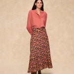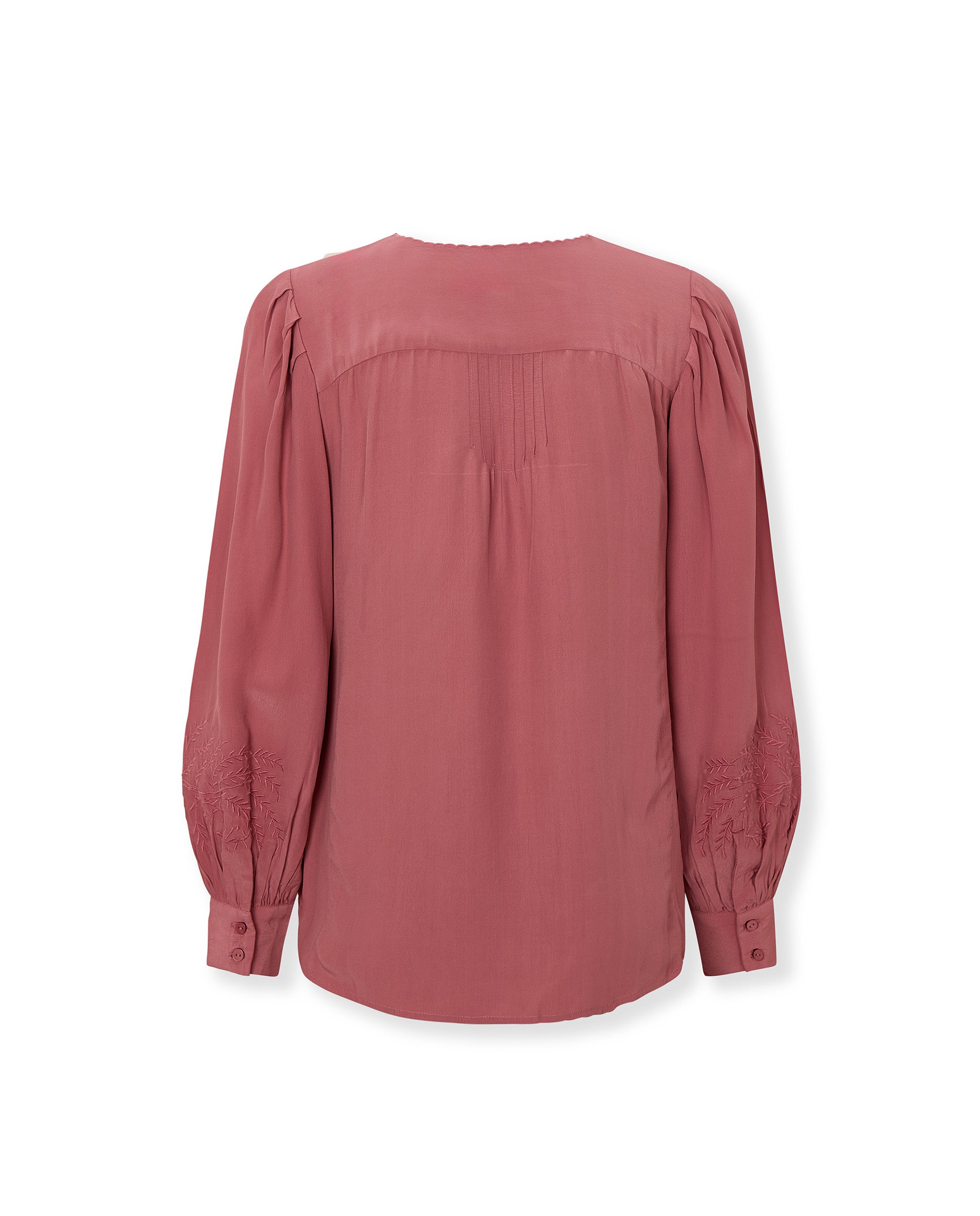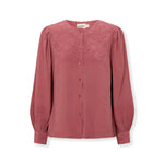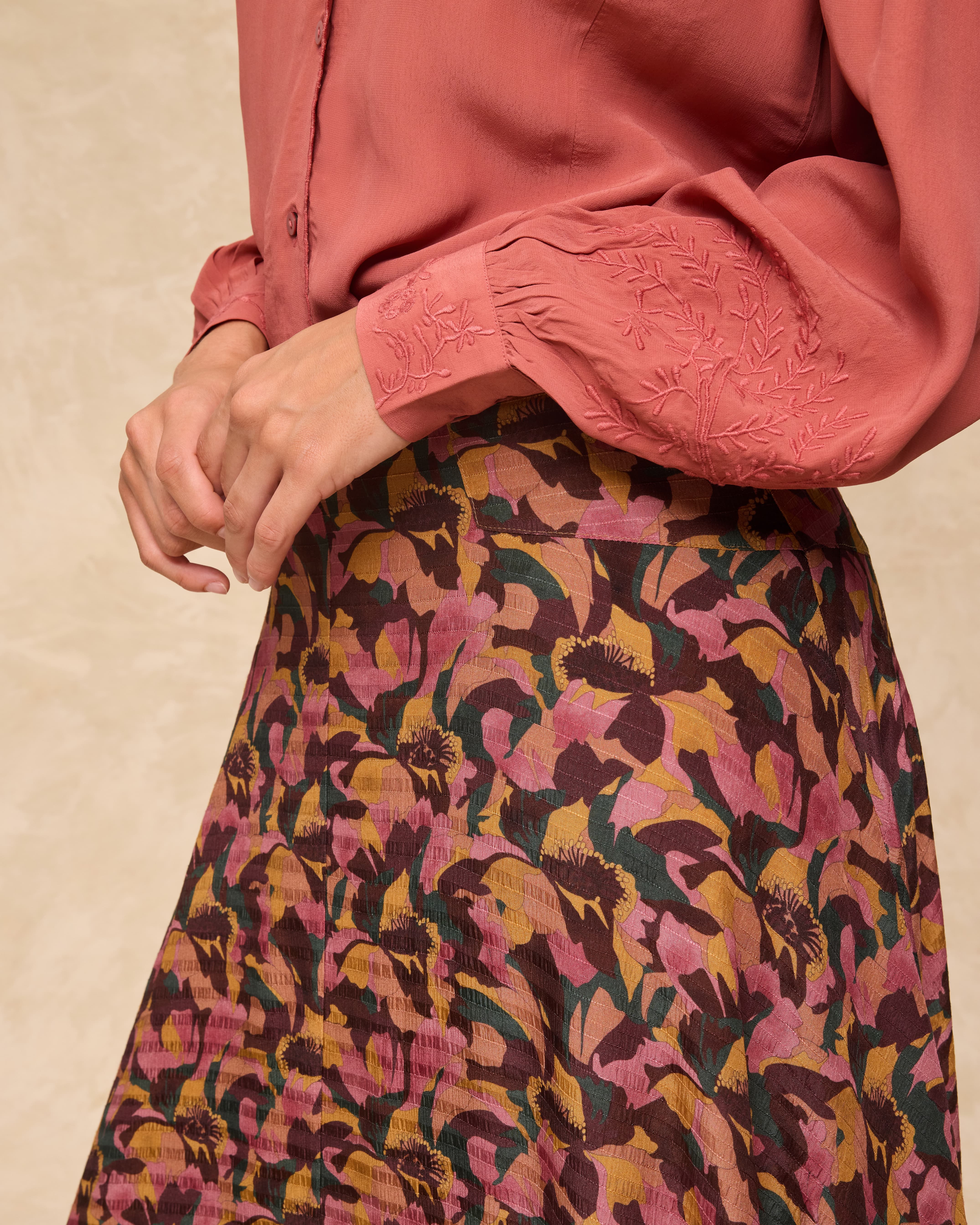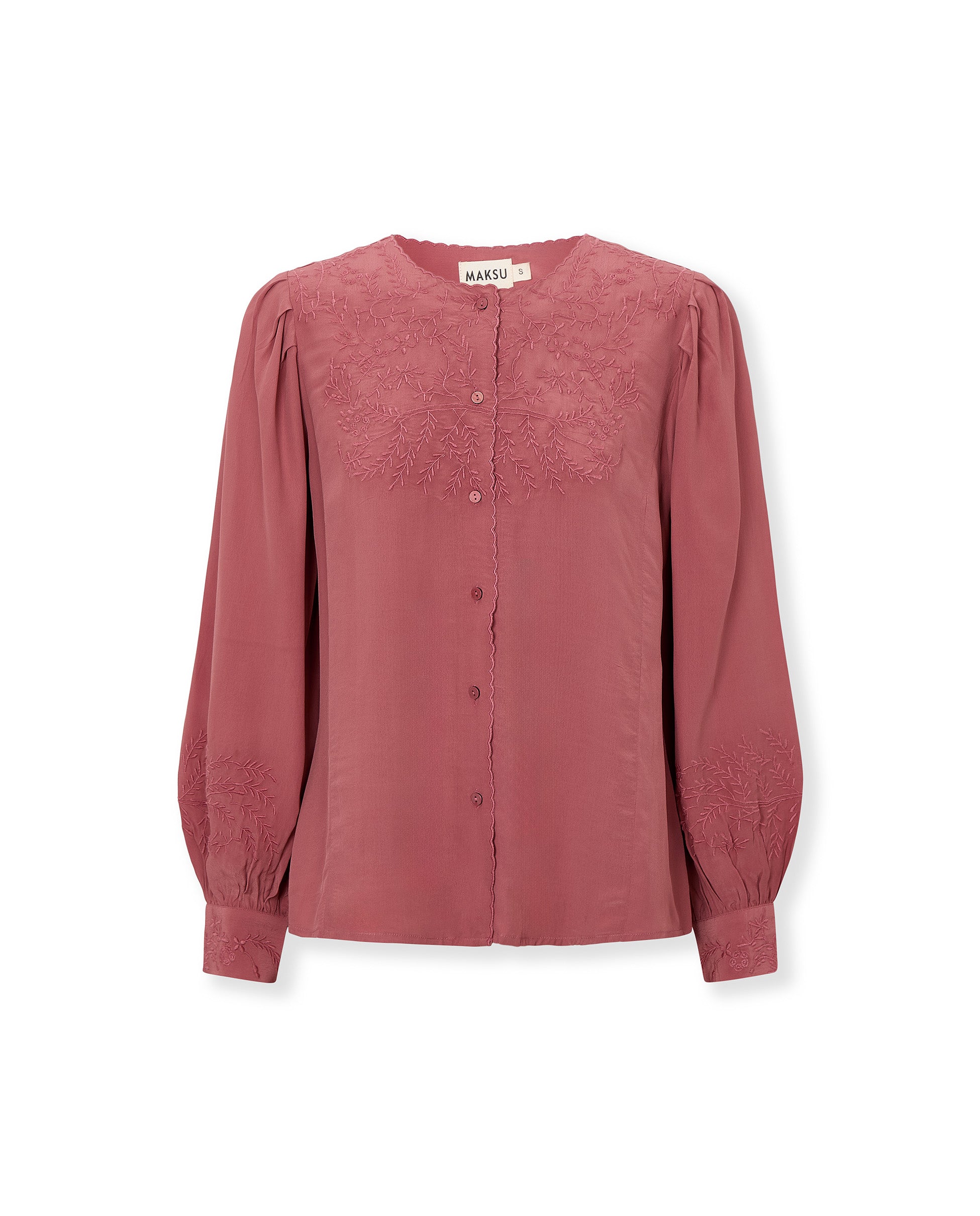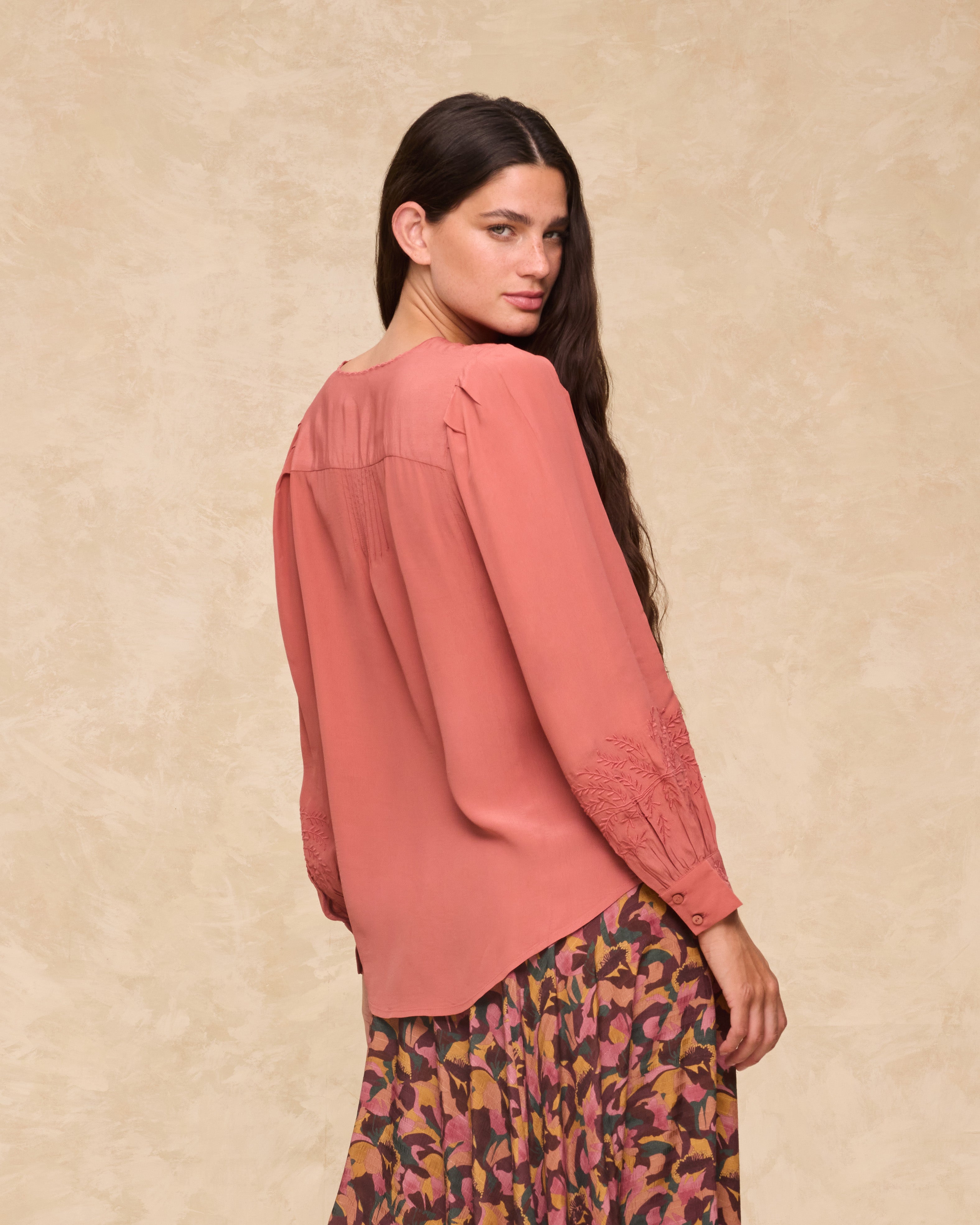 Softly structured with delicate detail, the Amal blouse is crafted in a rich sienna tone that complements both neutrals and bold prints. The relaxed silhouette features tonal embroidery across the shoulders and cuffs, finished with gentle gathers for subtle volume through the sleeve. Style it tucked into tailoring or draped loose over flowing skirts. • Tonal floral embroidery at the collar and cuffs • Relaxed silhouette with softly gathered sleeves • Dyed in a warm sienna tone for a natural finish