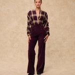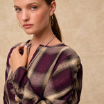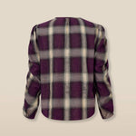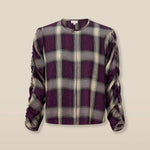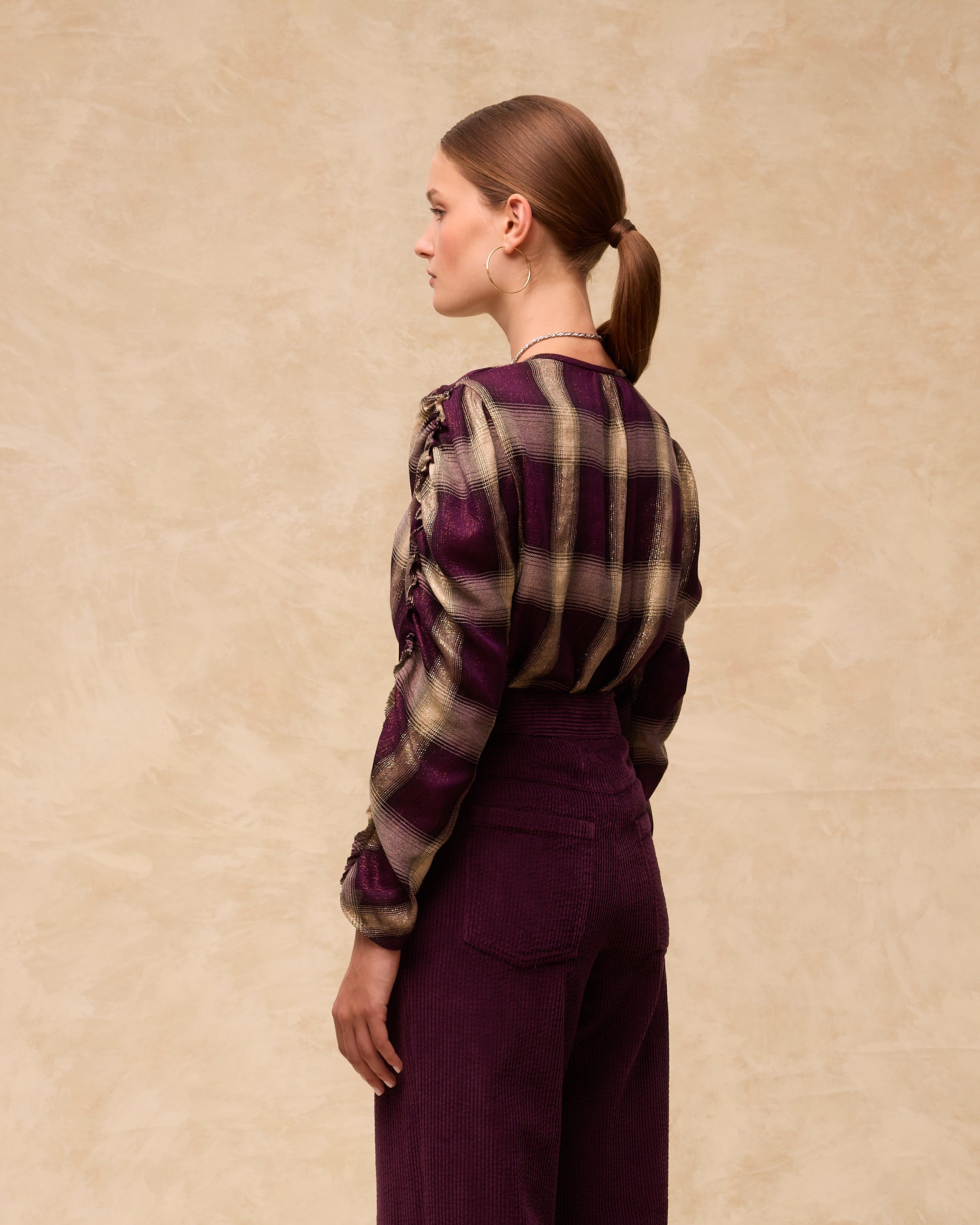 The Arianne blouse is crafted from Italian check fabric in rich aubergine and neutral tones, woven with subtle golden lurex for a soft shimmer. Designed with a clean round neckline and a single visible button at the top, it fastens through a concealed front placket for a minimal finish. The long sleeves are softly ruched for added texture and movement. • Italian check with golden lurex thread • Round neckline with single top button and concealed placket • Ruched long sleeves in a softly structured silhouette