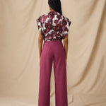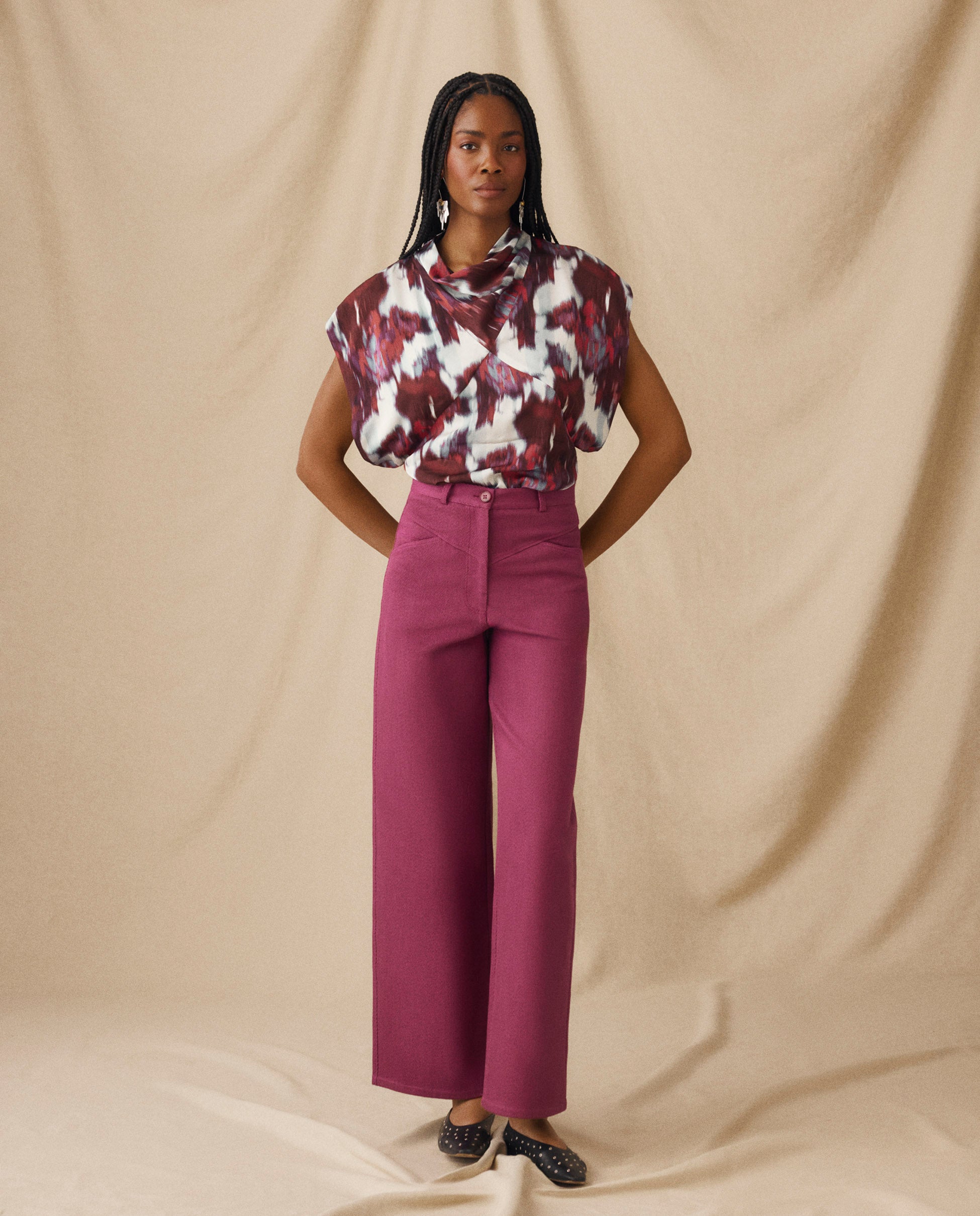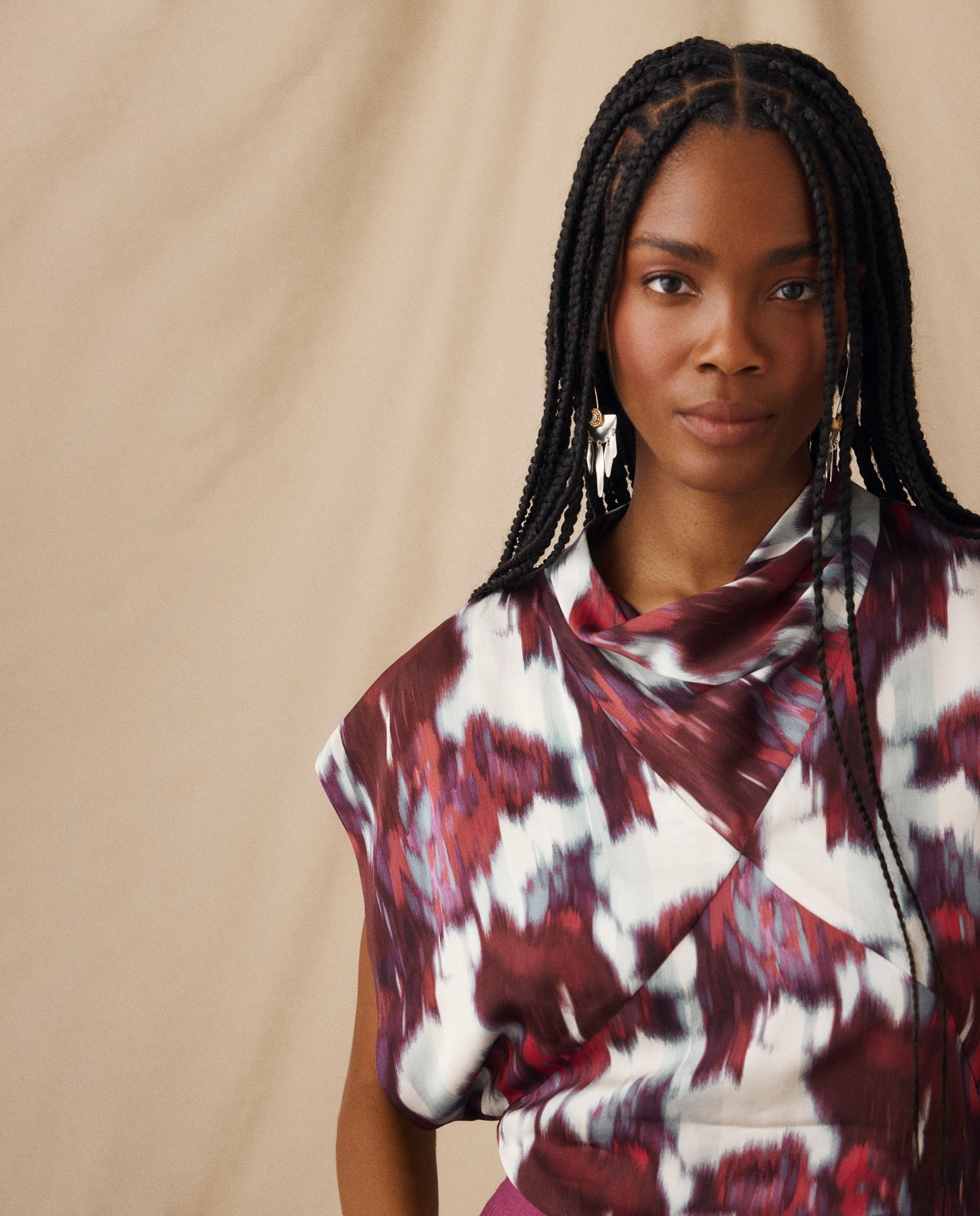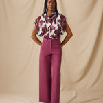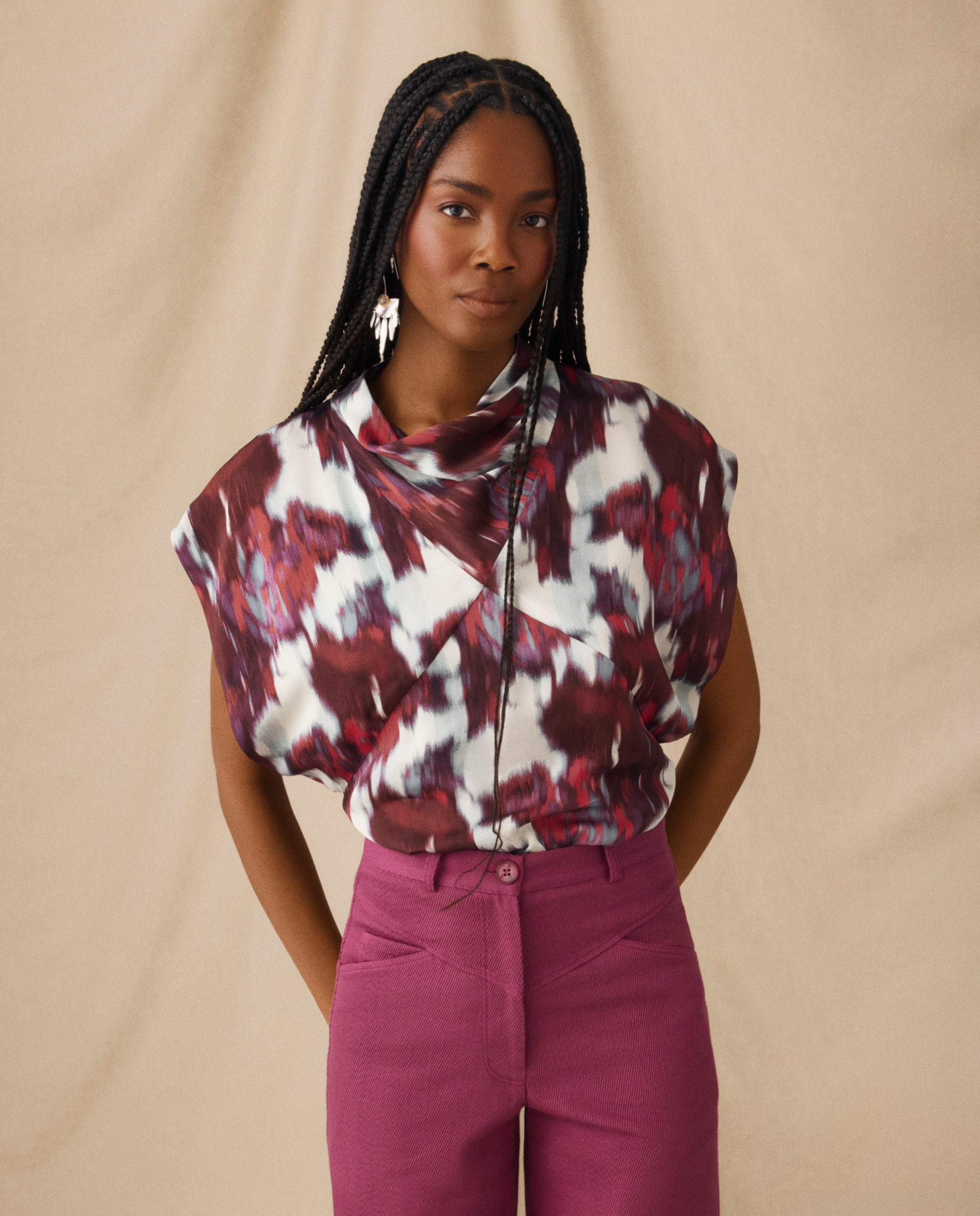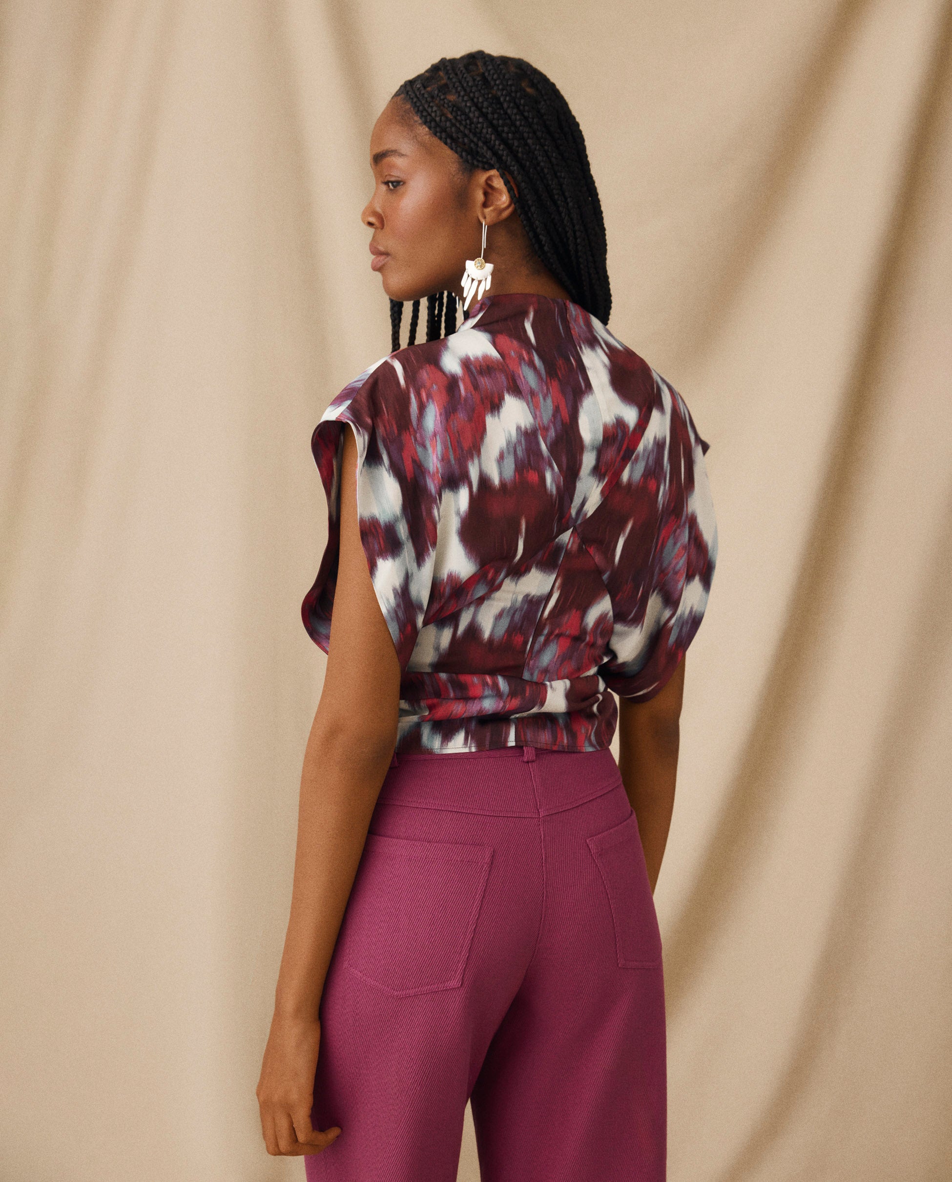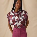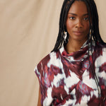The Freya top is defined by its artful drape and sculpted silhouette. Cut in a bold brushstroke print of crimson, ivory and violet-blue, it features a softly folded cowl neckline and diagonal seams that contour the body. The open armholes add ease and movement, balancing the top’s fluid, fitted shape.
