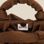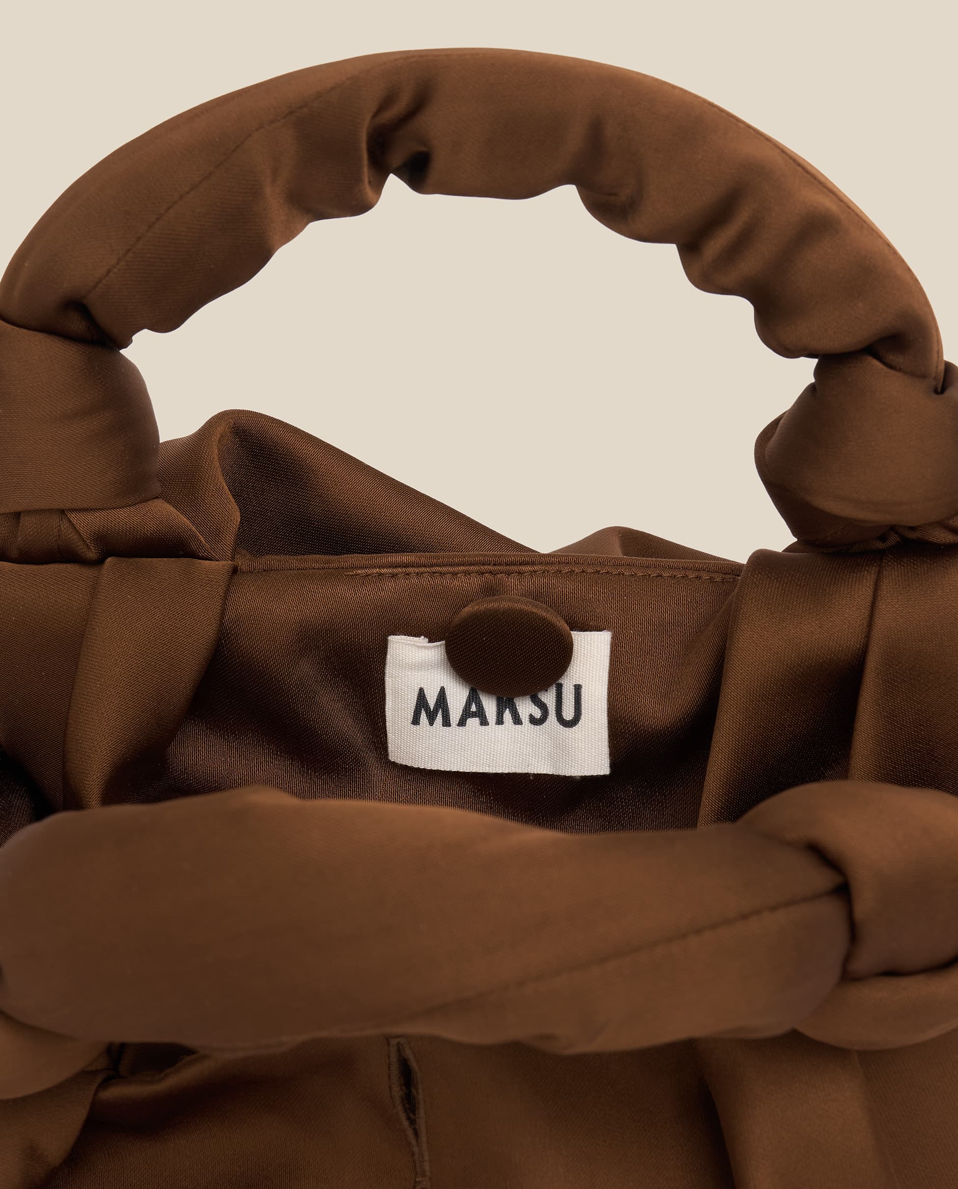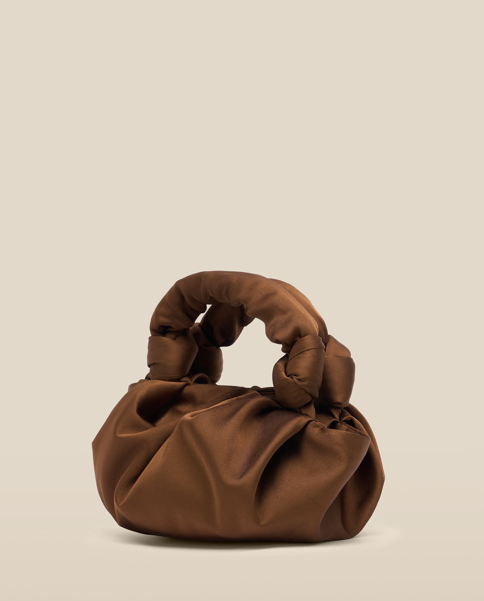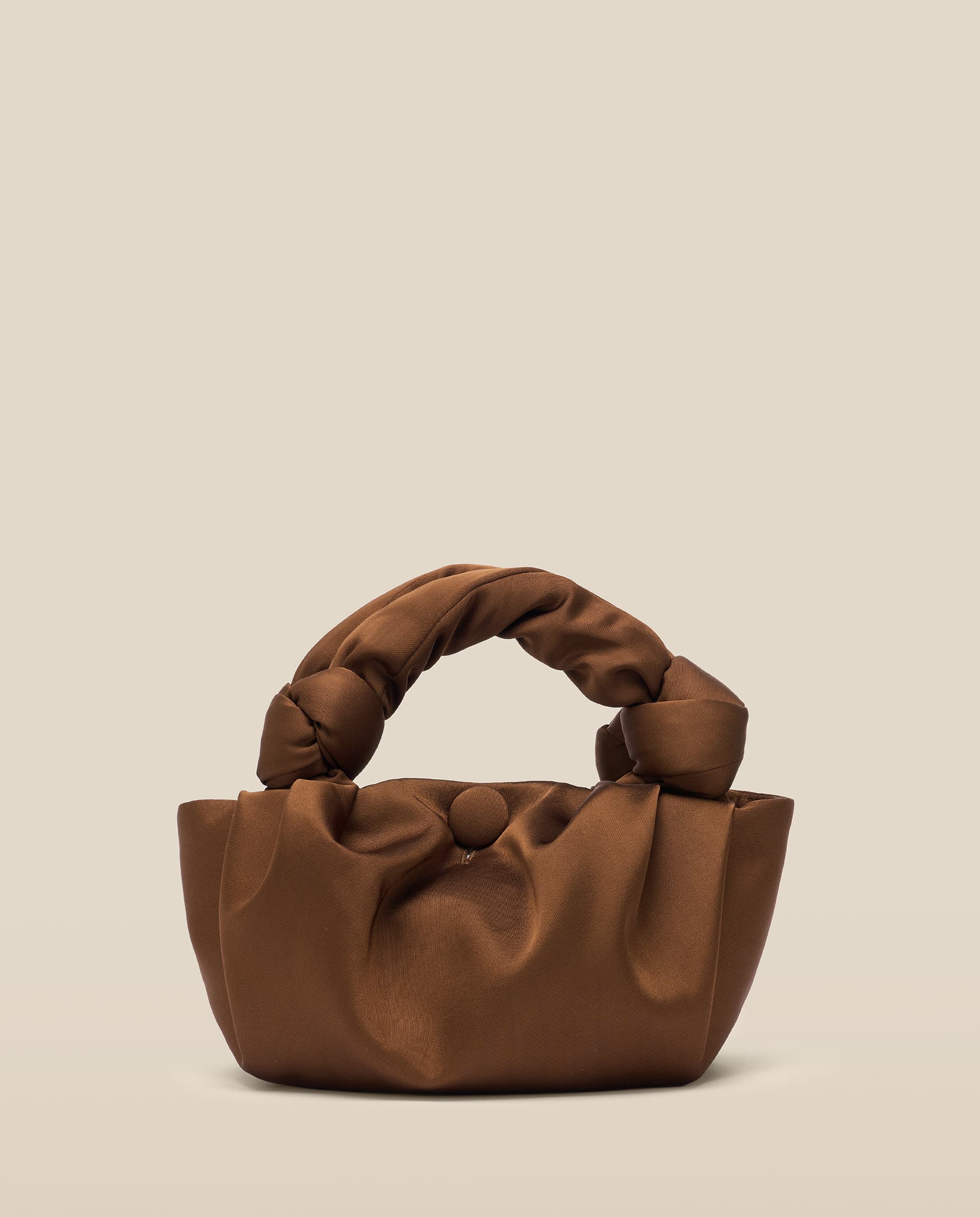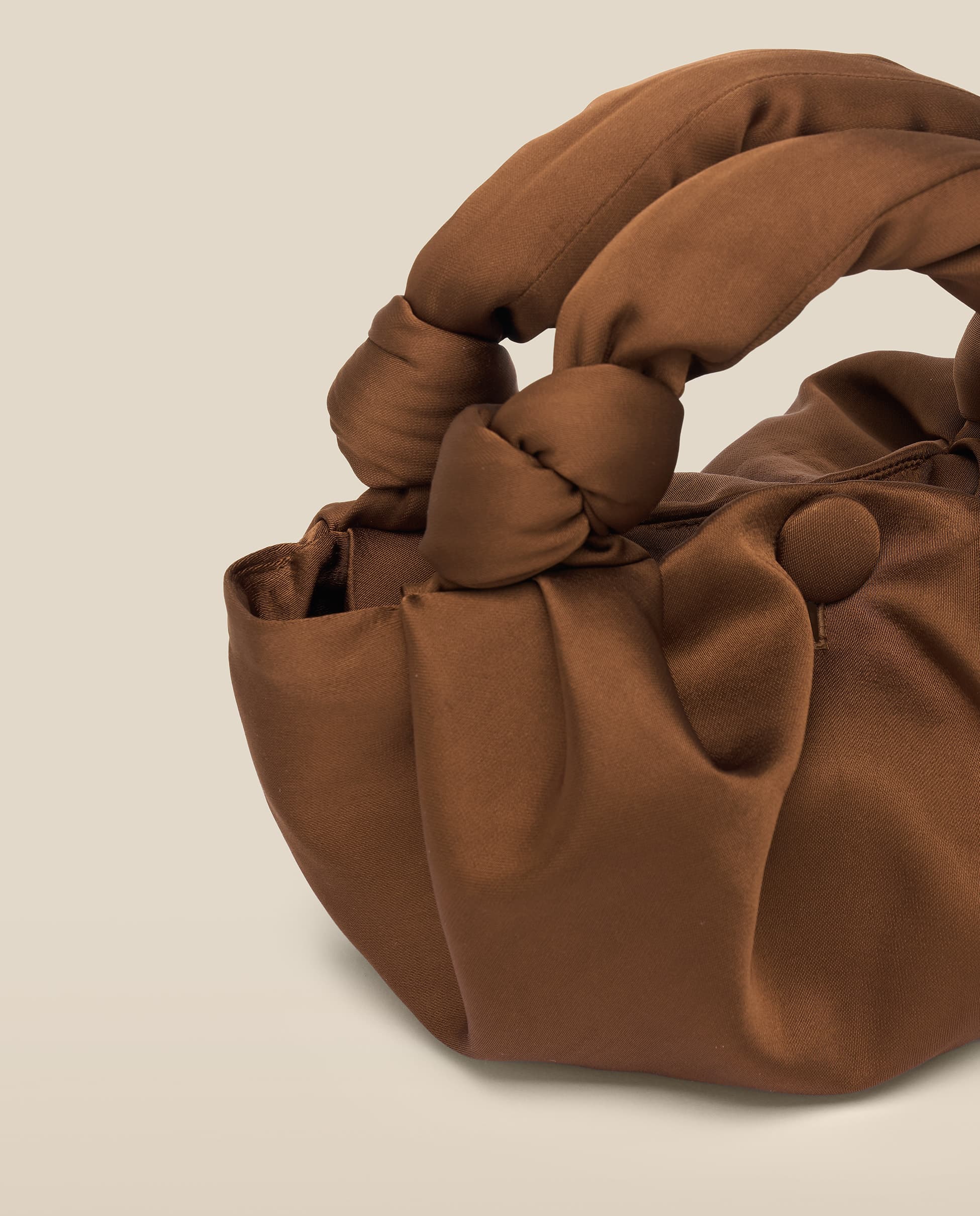 Crafted in smooth satin with a subtle sheen, the Gyosa bag is defined by its sculptural shape and softly padded knotted handles. The unstructured form sits naturally in the hand, while a covered button closure keeps essentials secure.