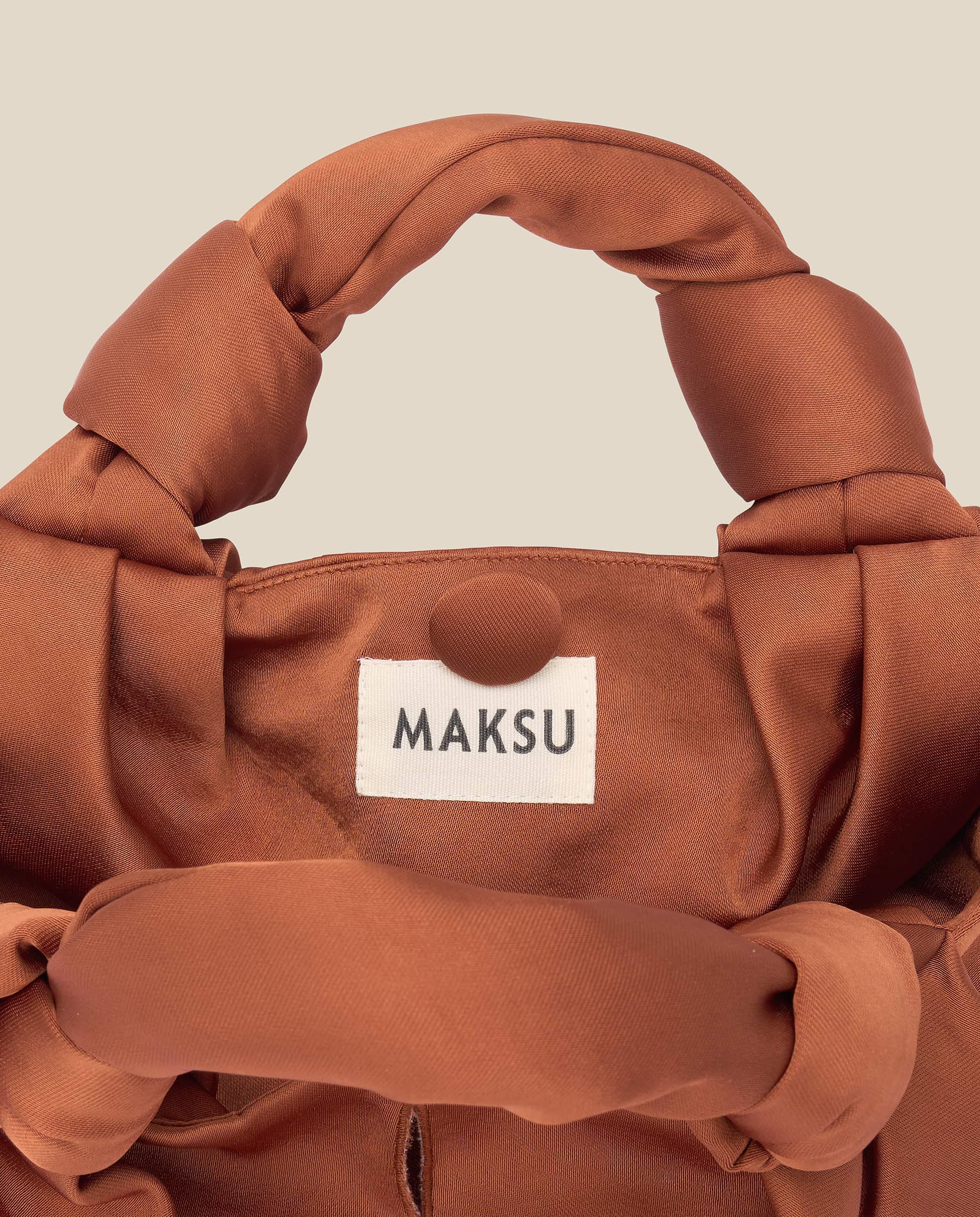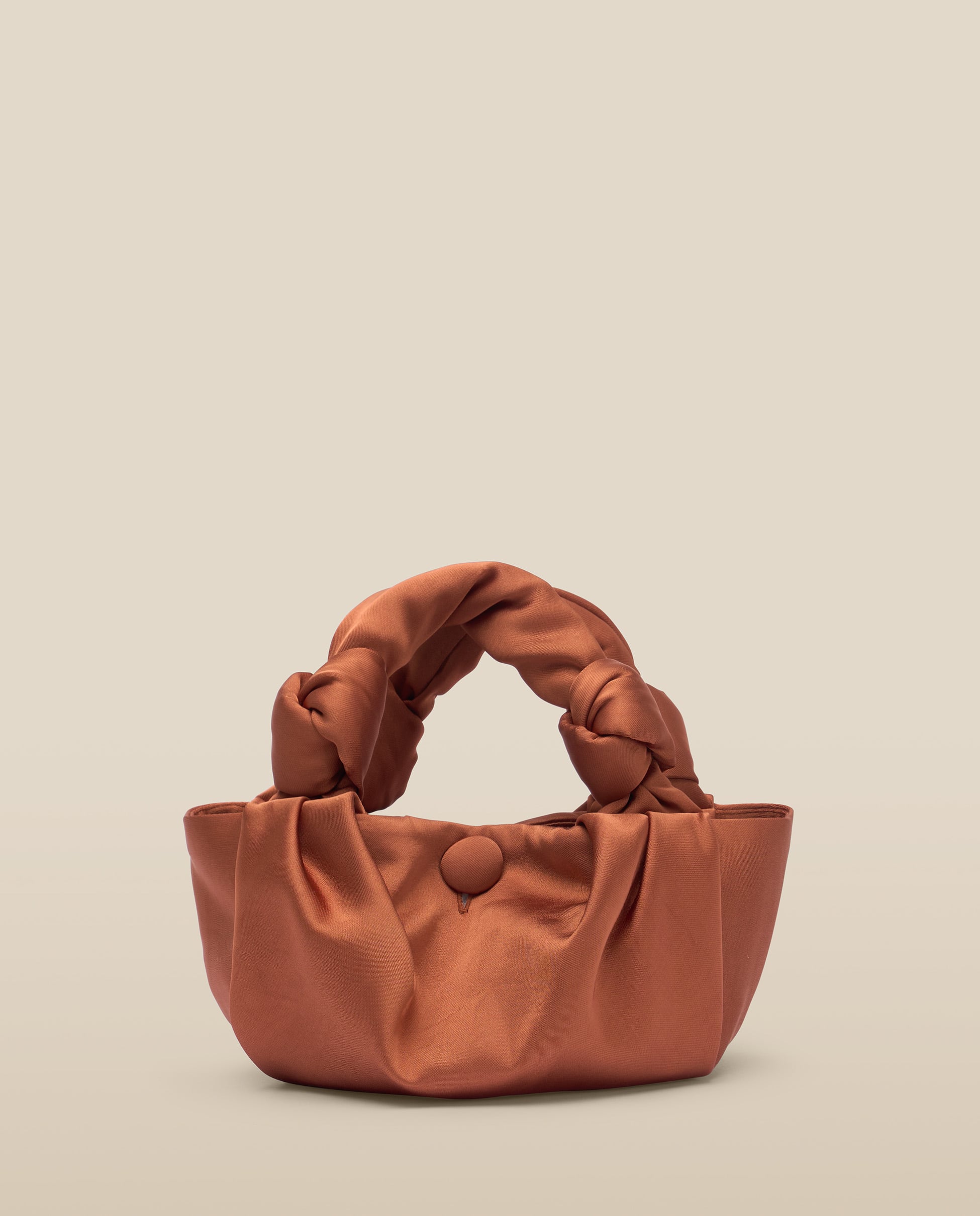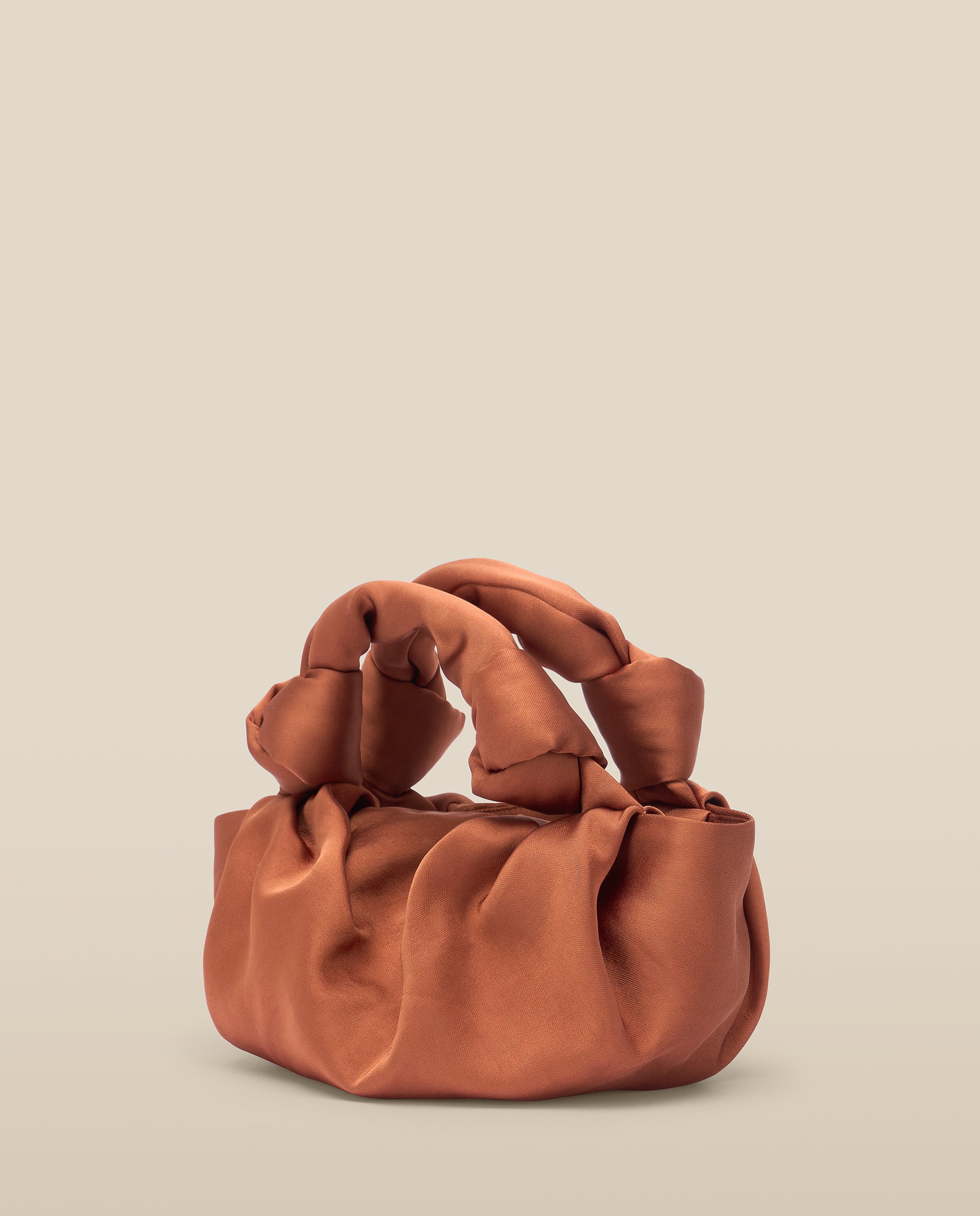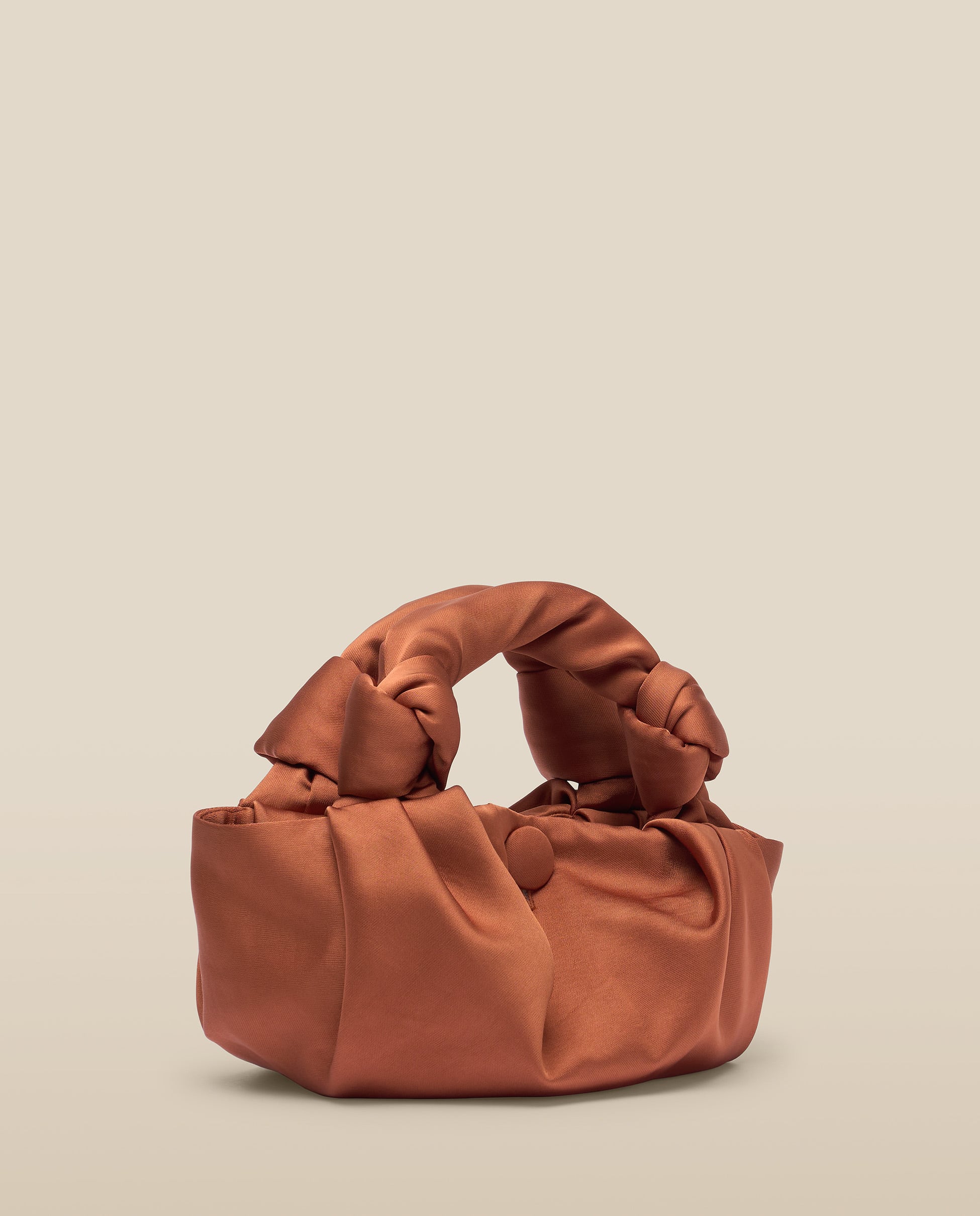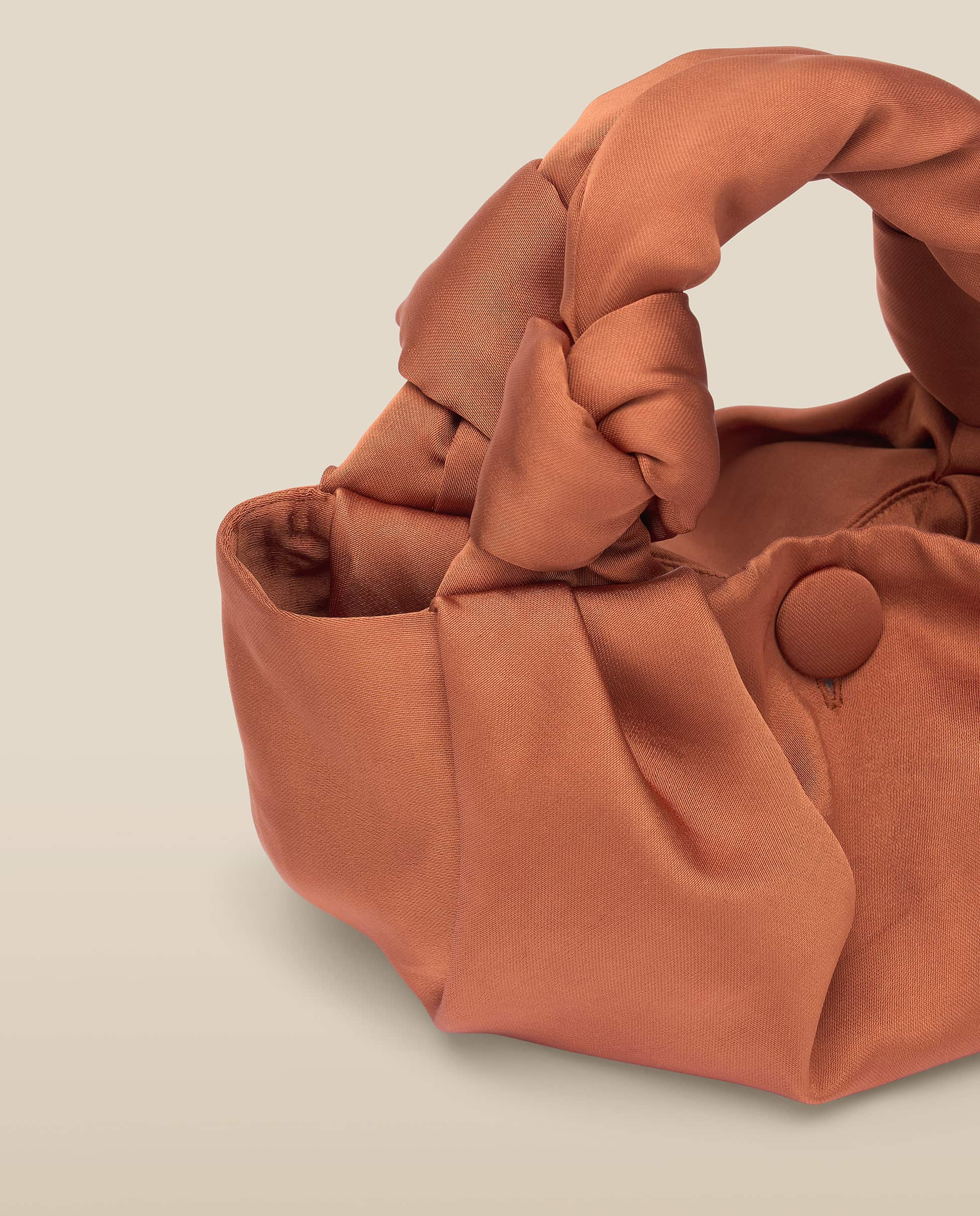 Crafted in smooth satin with a subtle sheen, the Gyosa bag is defined by its sculptural shape and softly padded knotted handles. The unstructured form sits naturally in the hand, while a covered button closure keeps essentials secure. Designed in rich paprika orange for standout appeal.