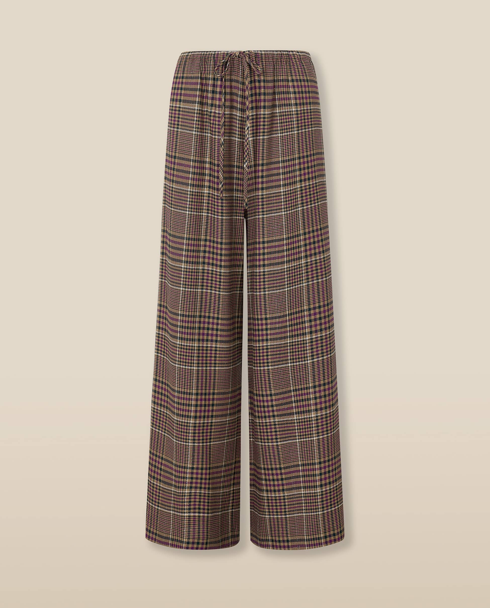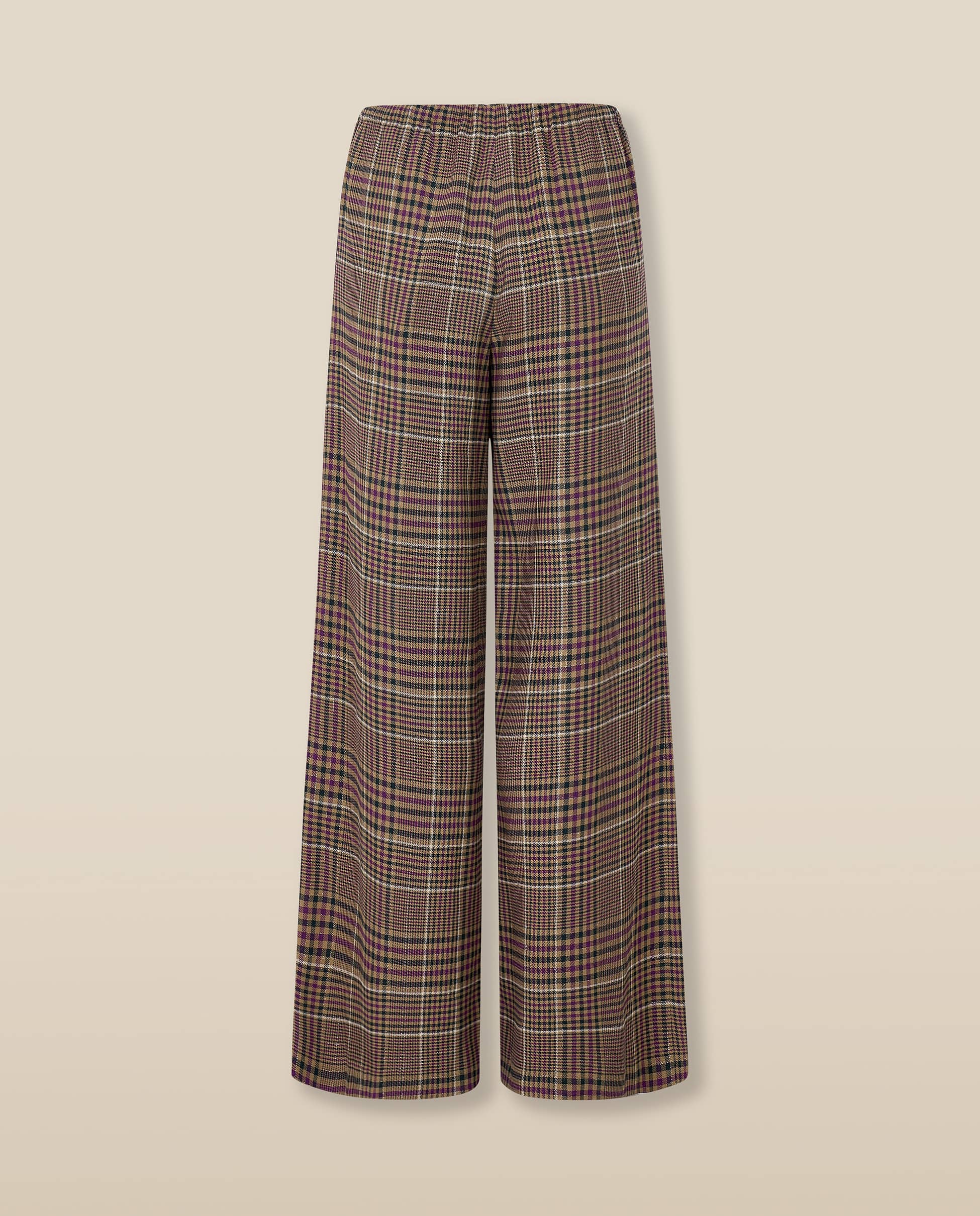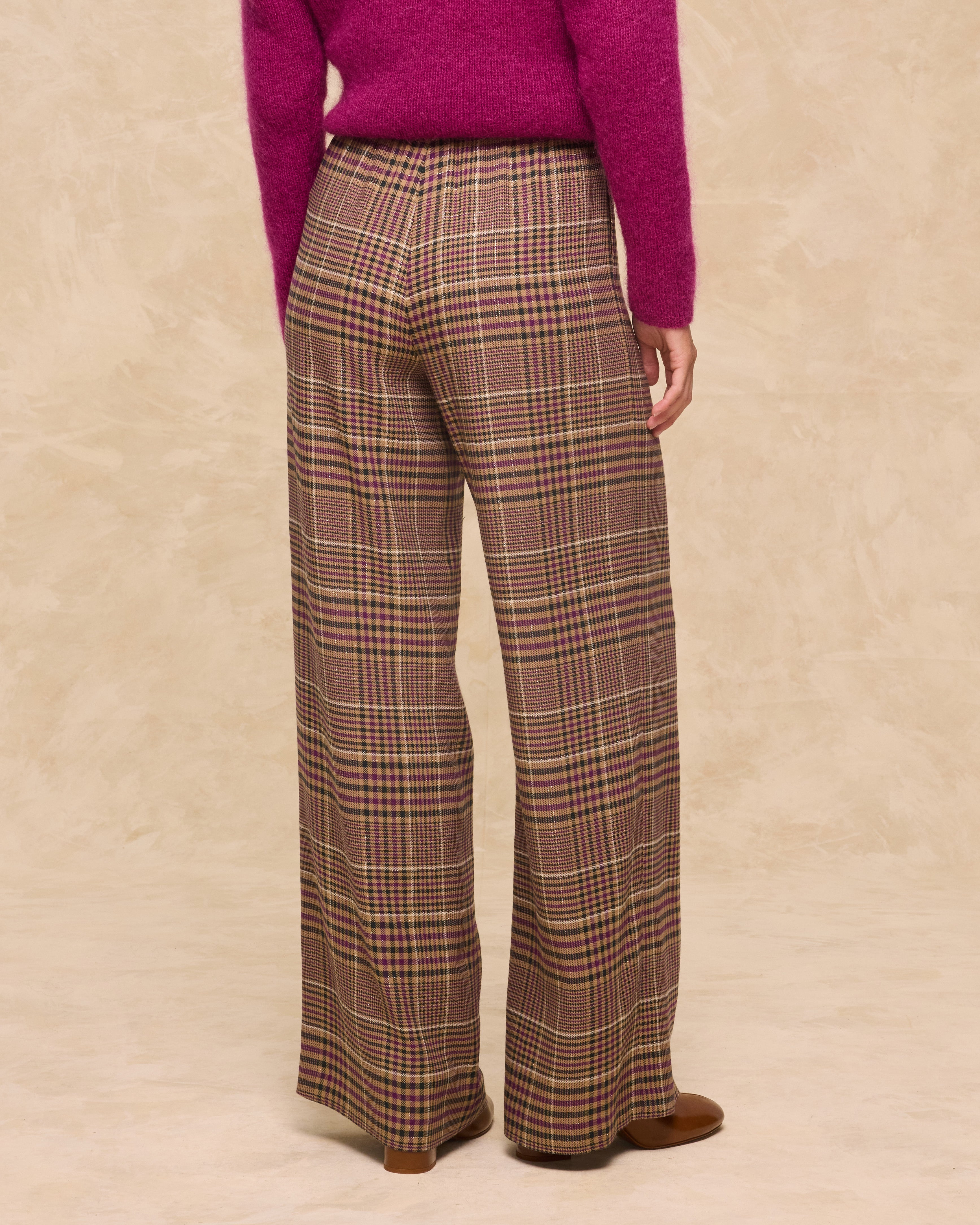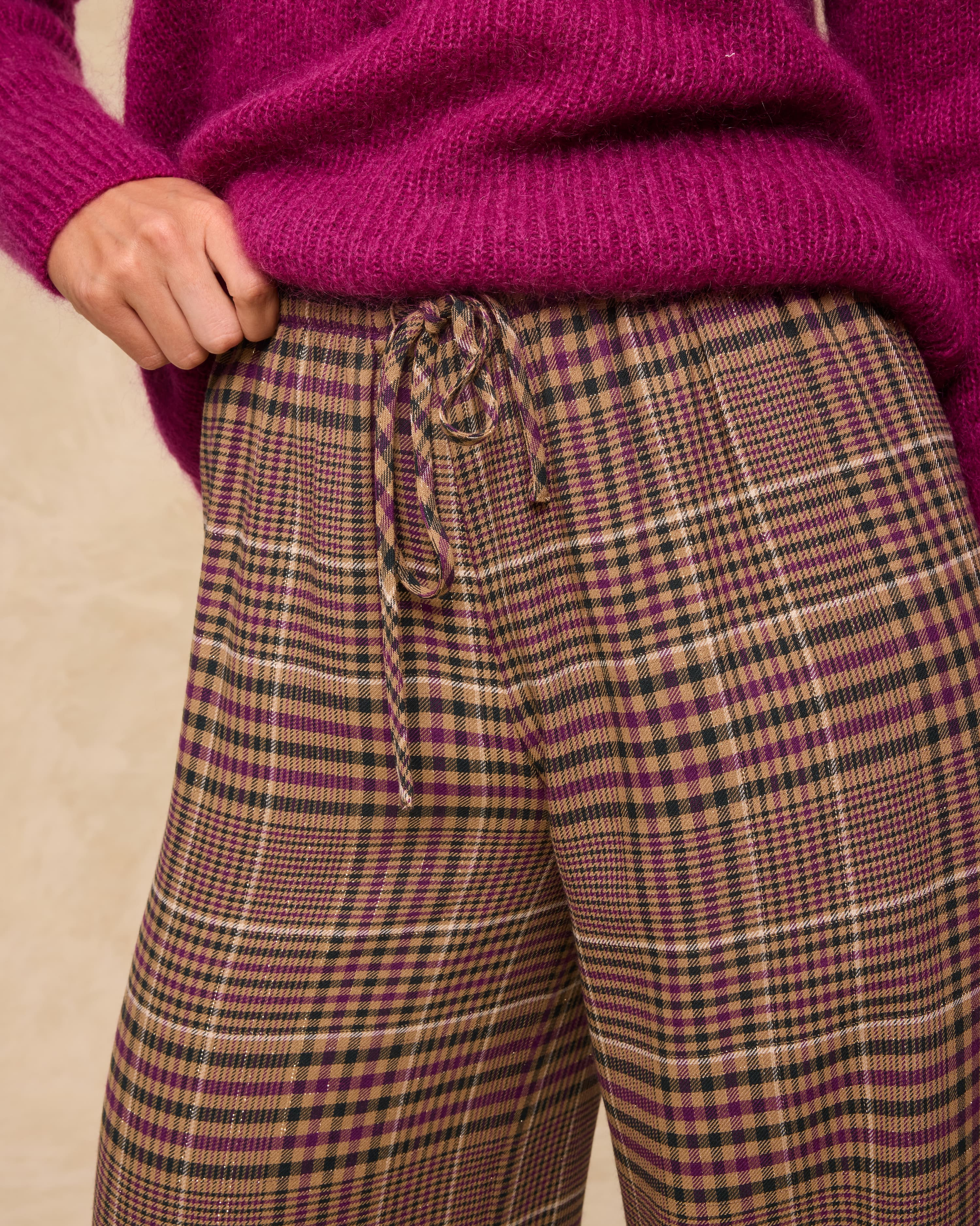 Relaxed tailoring meets elevated texture in the Henry trousers, cut from Italian check wool in deep purple, camel and black tones. Fully lined for comfort, they feature a soft wide-leg silhouette with a tonal drawstring tie waistband. A versatile statement piece that balances softness with structure.