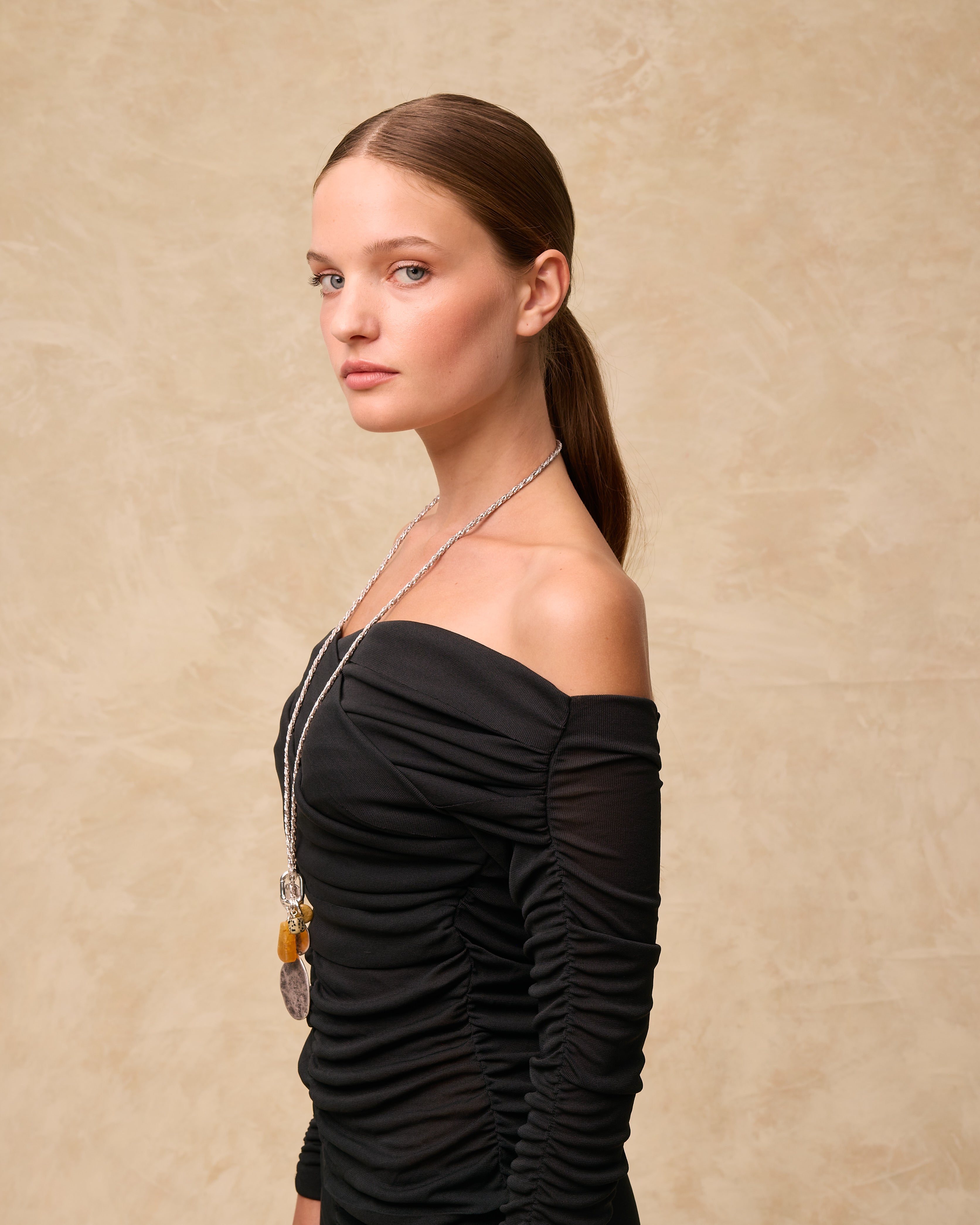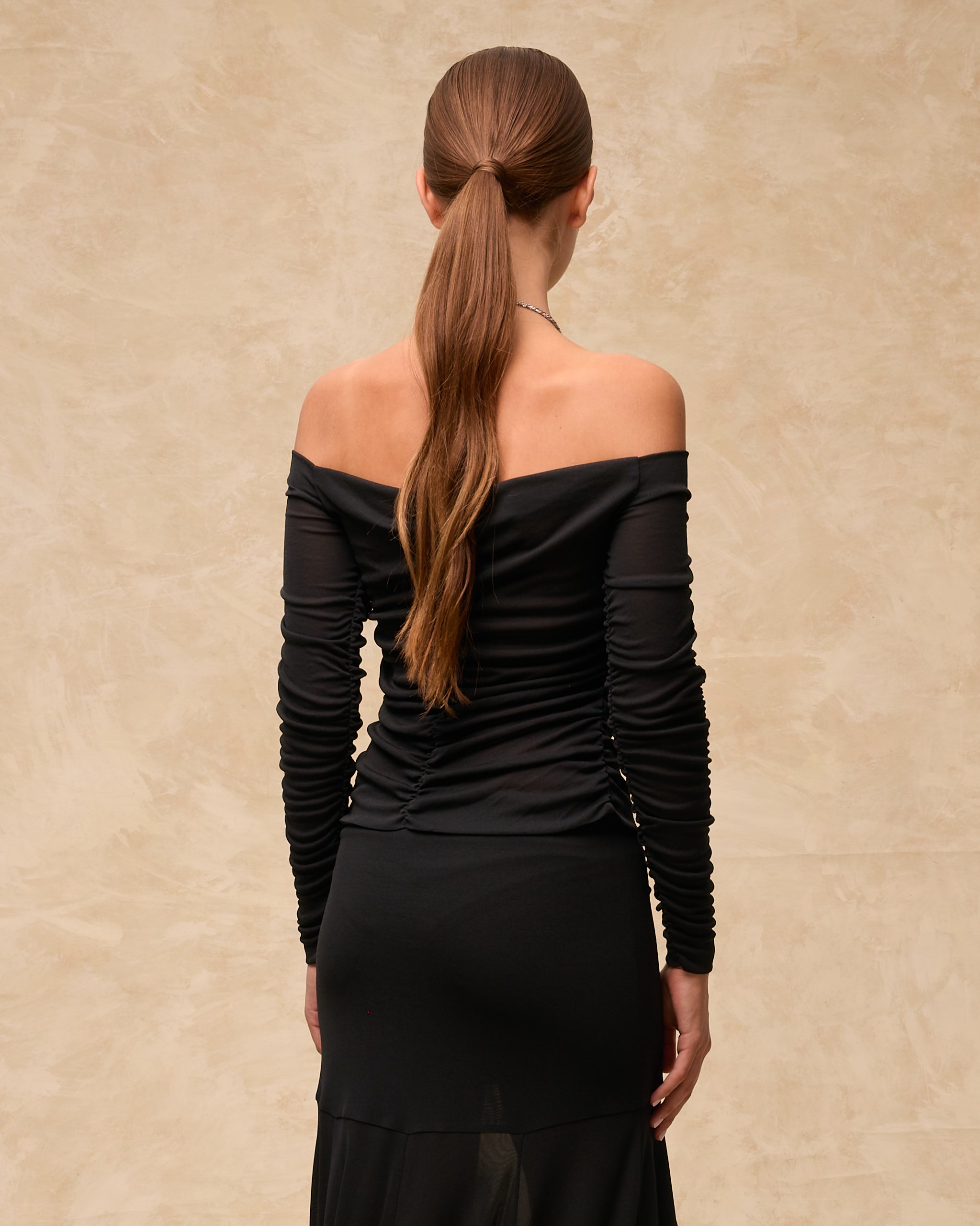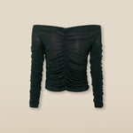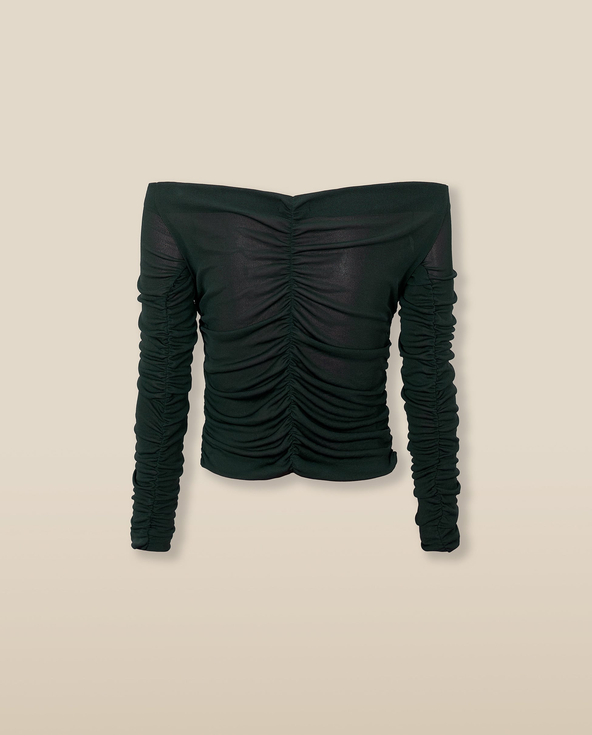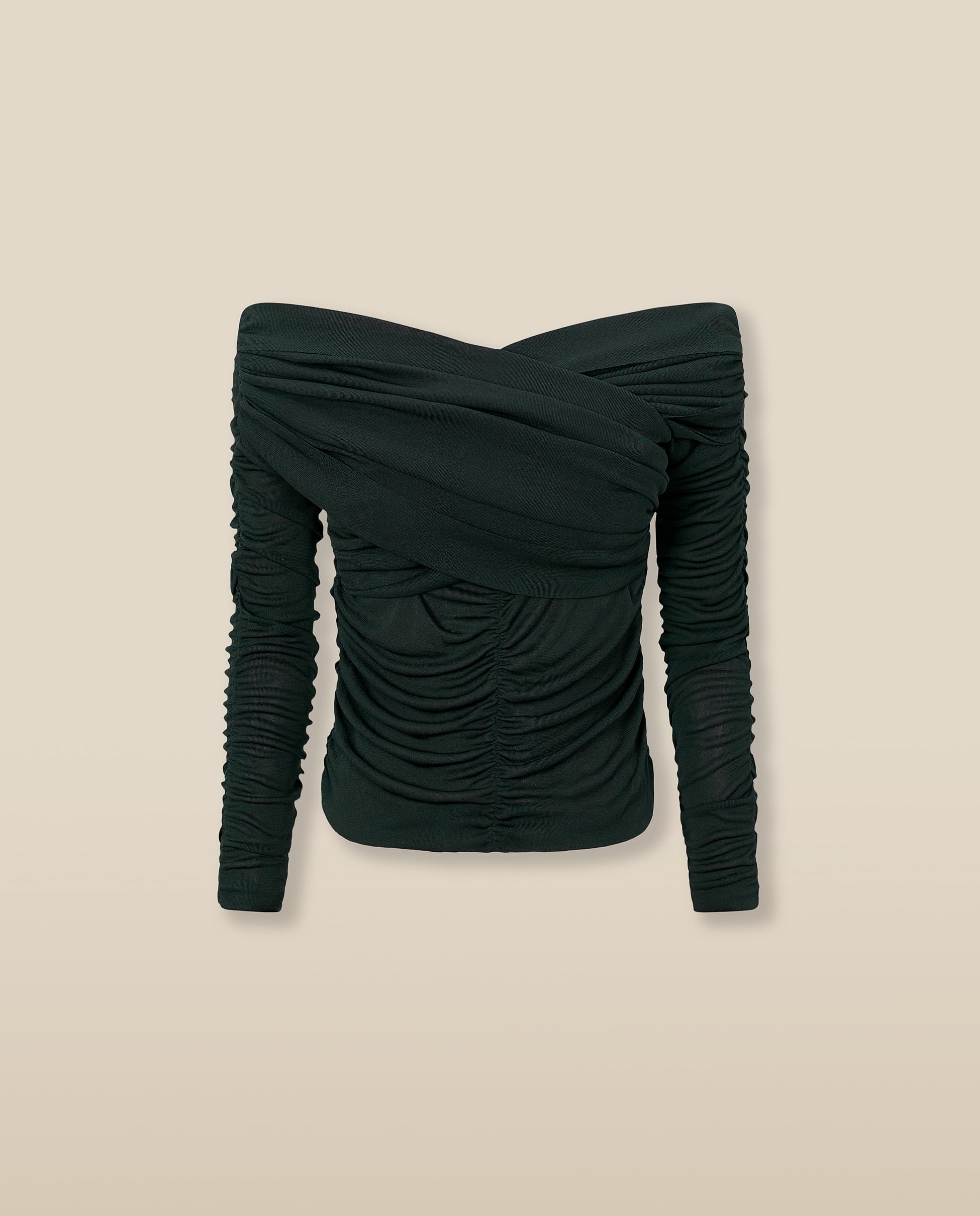 Sleek, sculptural and effortlessly versatile, the Jane top is crafted in soft forest green jersey with natural stretch. Designed with a flattering off-shoulder neckline, it features full-length ruched sleeves and delicate draping across the bodice for a contoured, body-skimming fit. Style it with the matching skirt for a modern, fluid silhouette. • Off-shoulder neckline with gathered draping and full-length sleeves • Ruched bodice for a sculpted, flattering shape • Made using Naia™ acetate blend jersey for softness and breathability