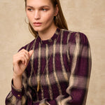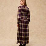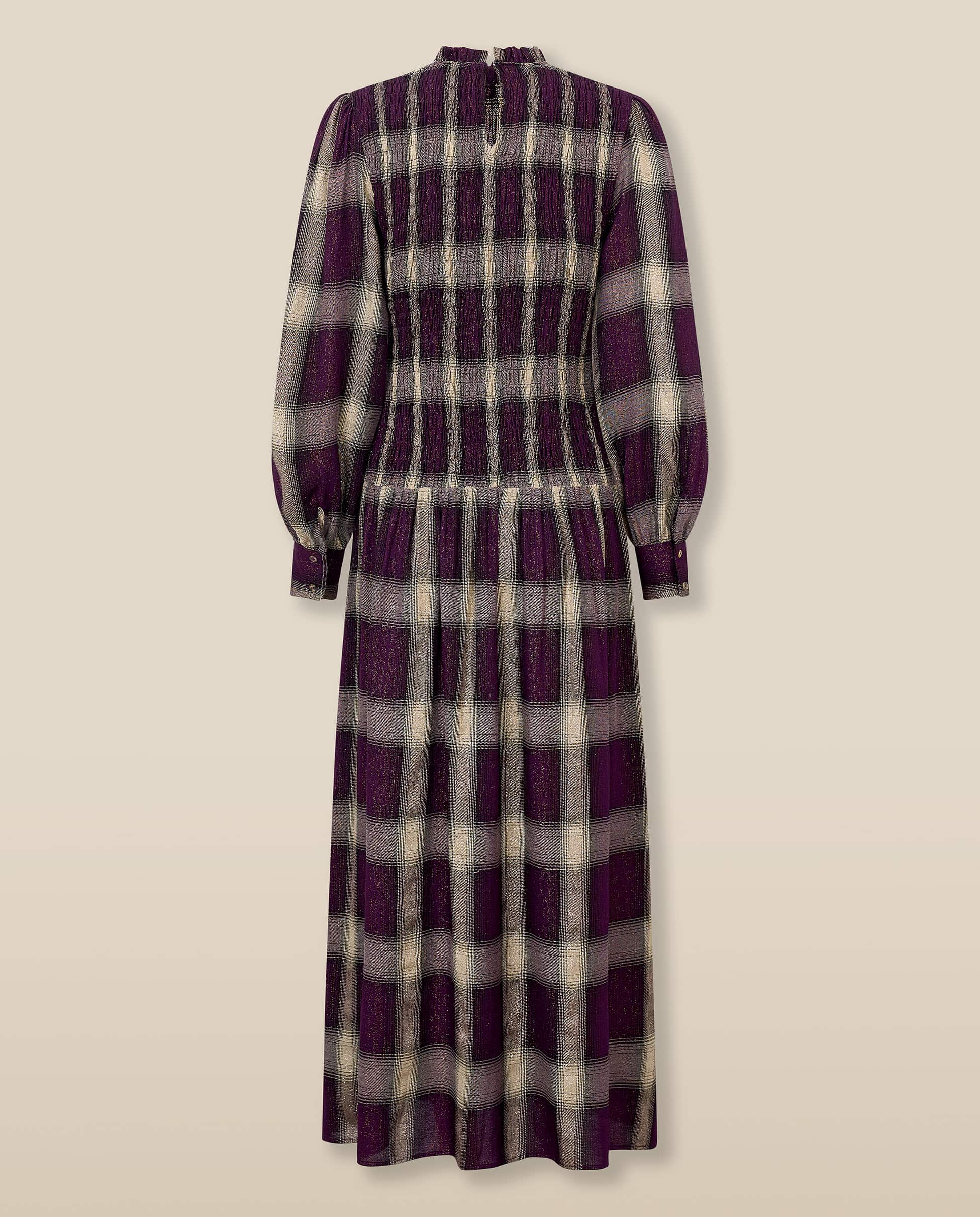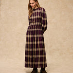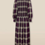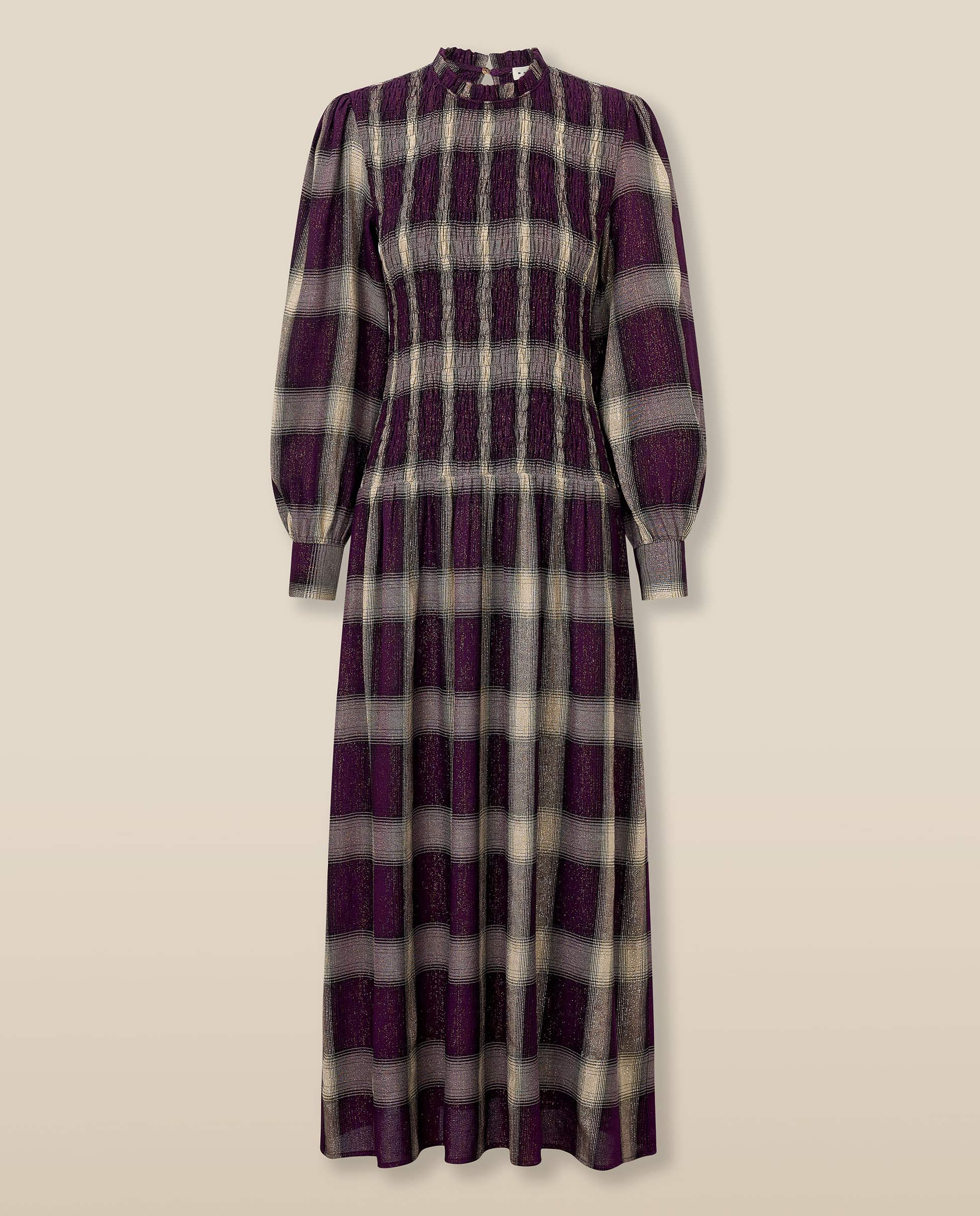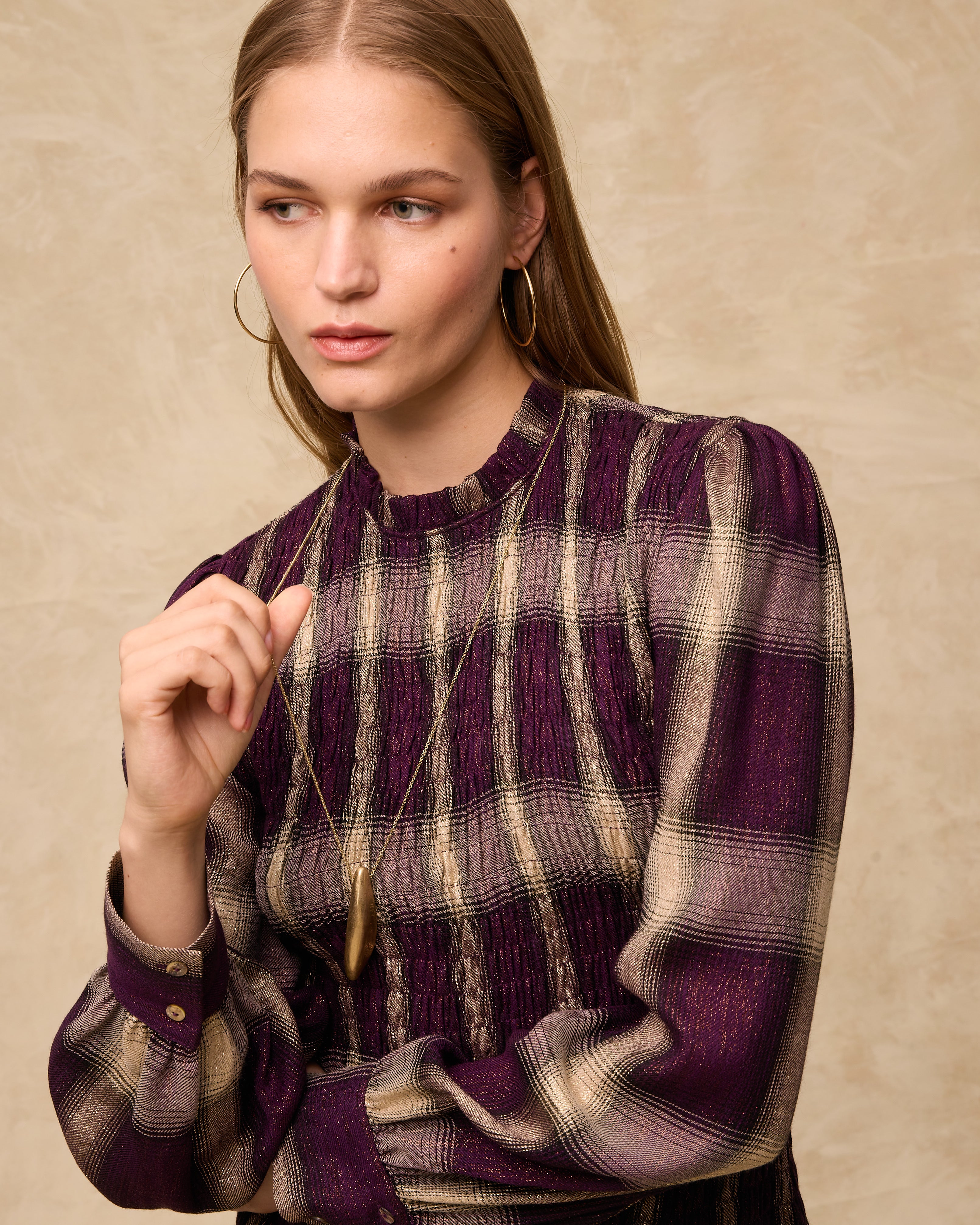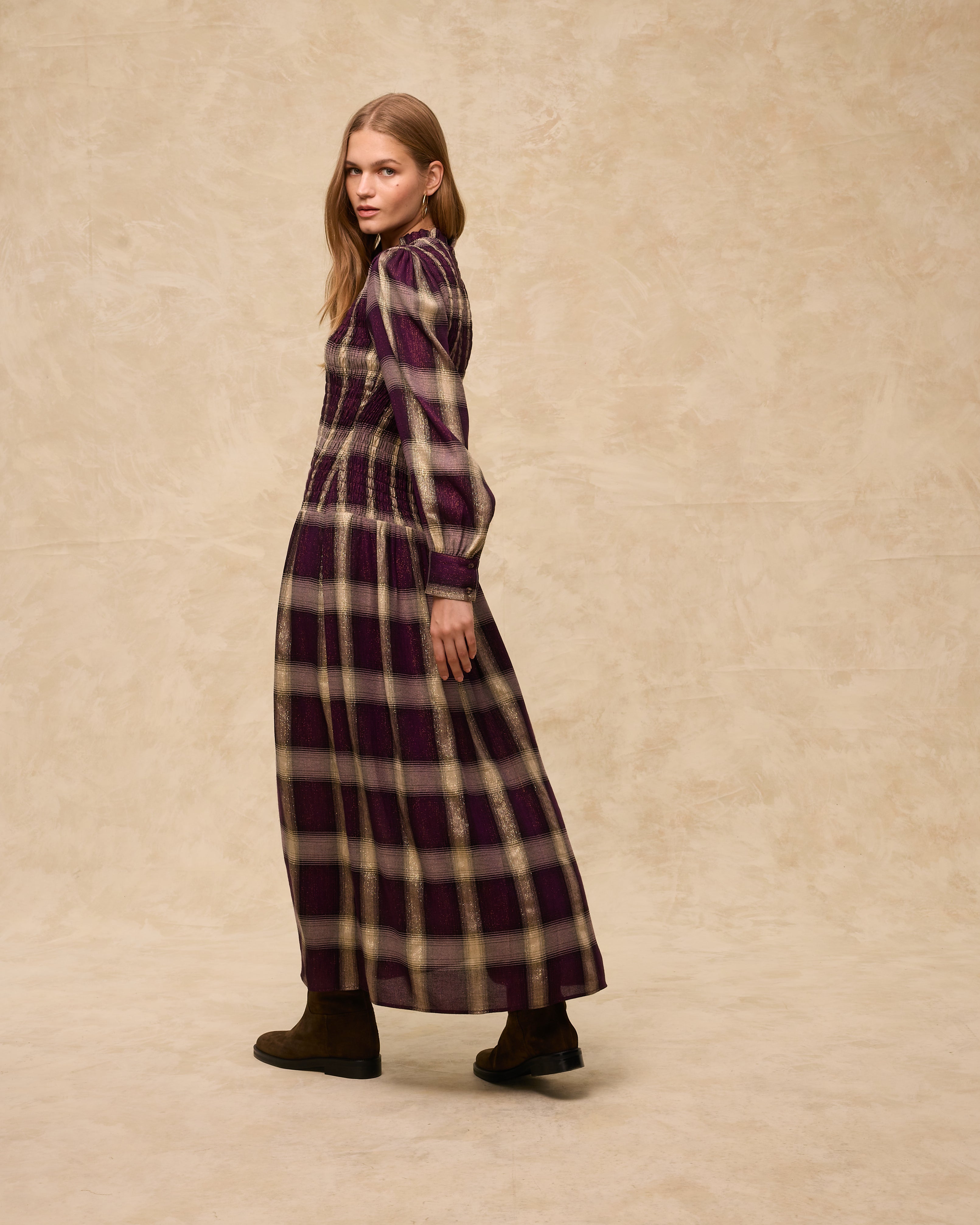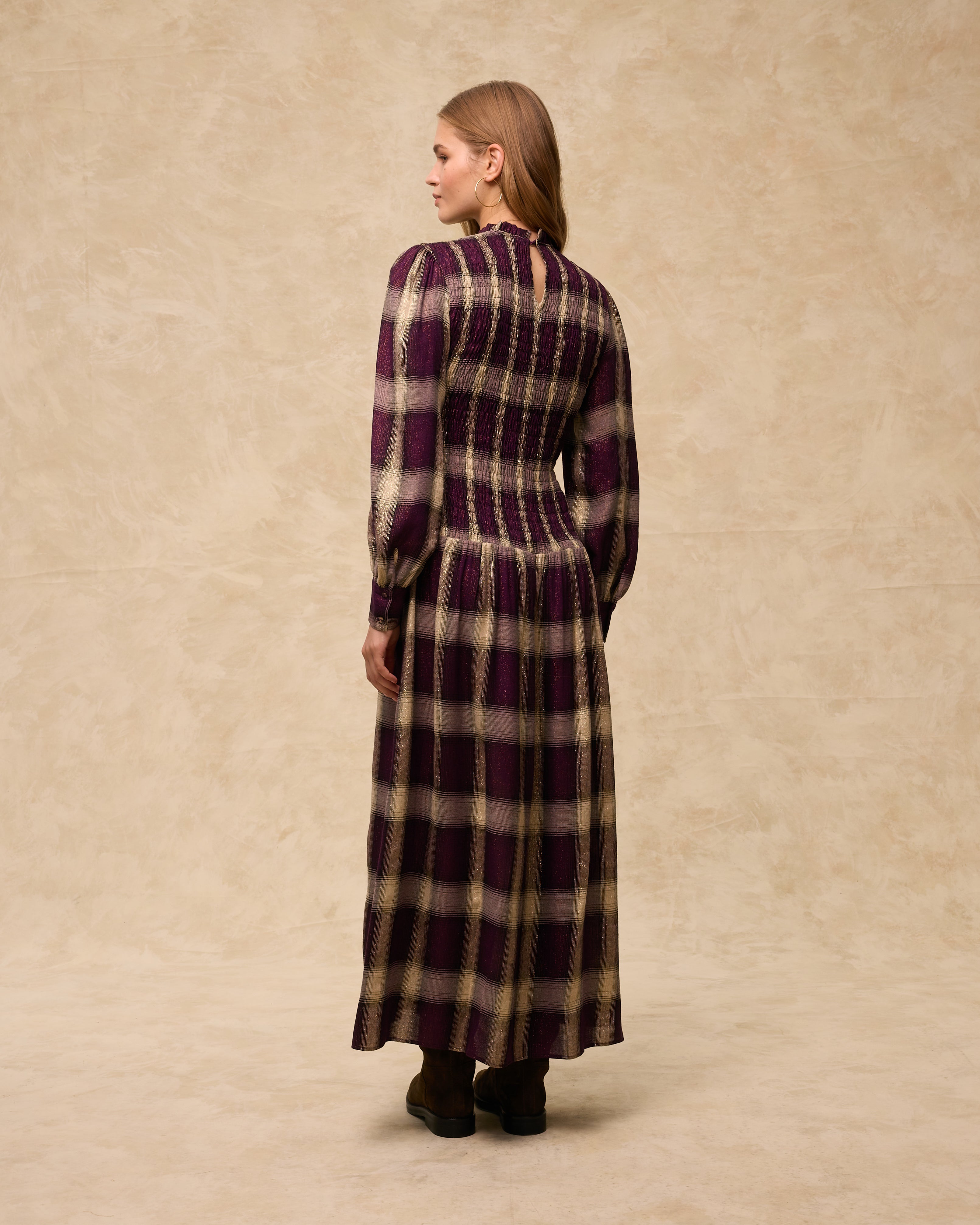 Woven from Italian fabric in aubergine check with a subtle metallic thread, the Leonor Dress delivers timeless structure with soft volume. The bodice is smocked through the waist and sleeves for a defined silhouette, while the skirt falls to a softly flared midi length. Finished with a high neckline and keyhole button fastening at the back.