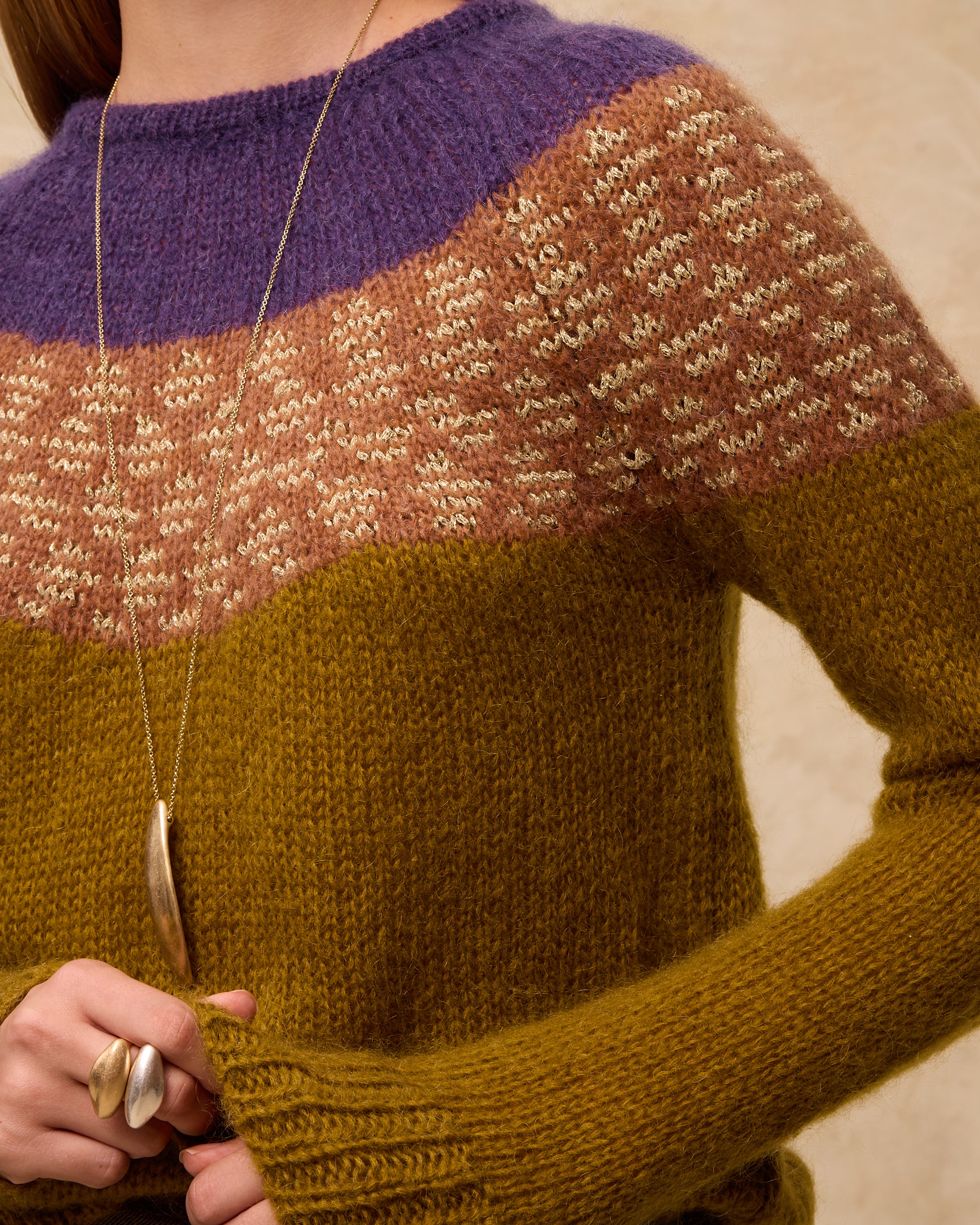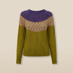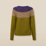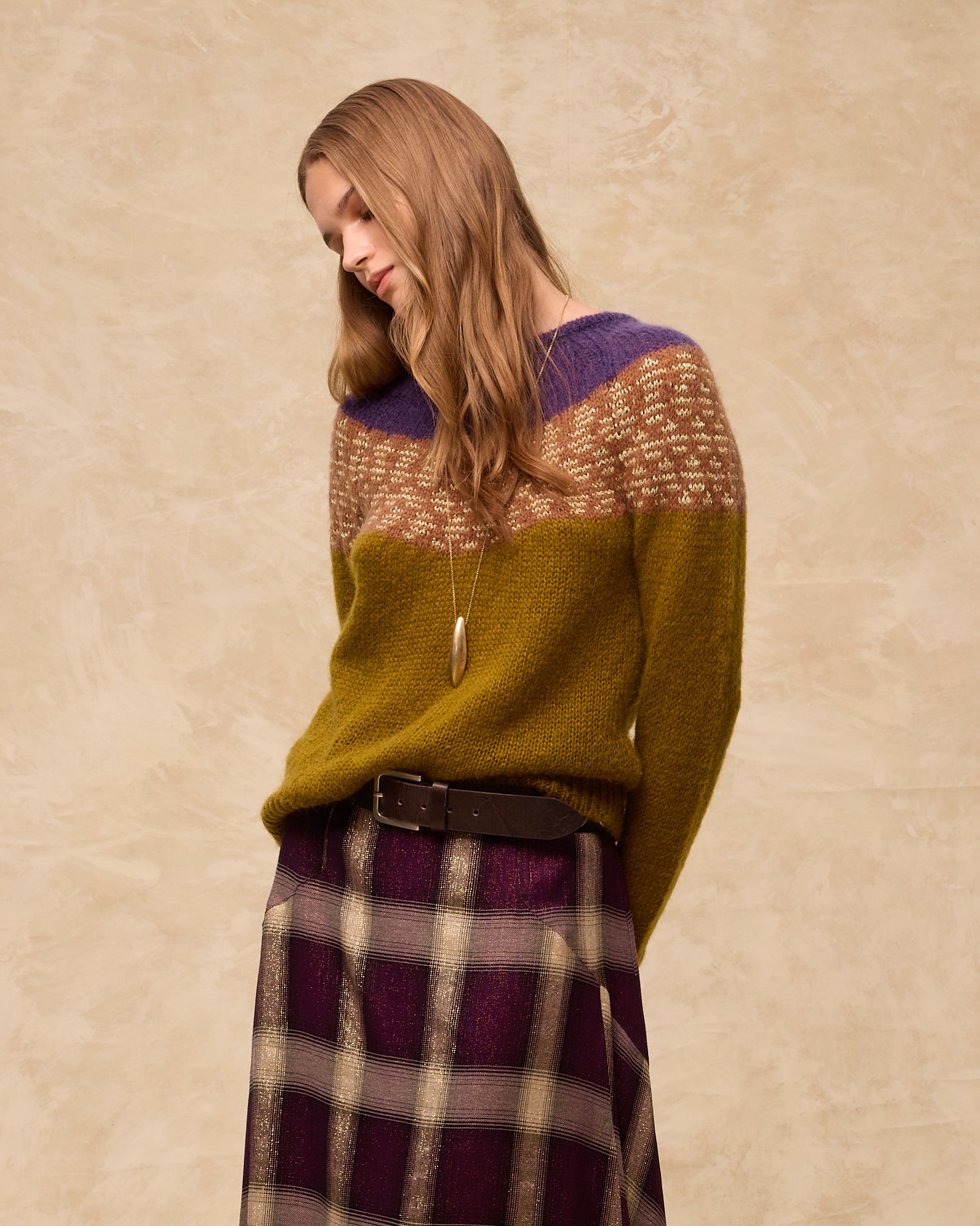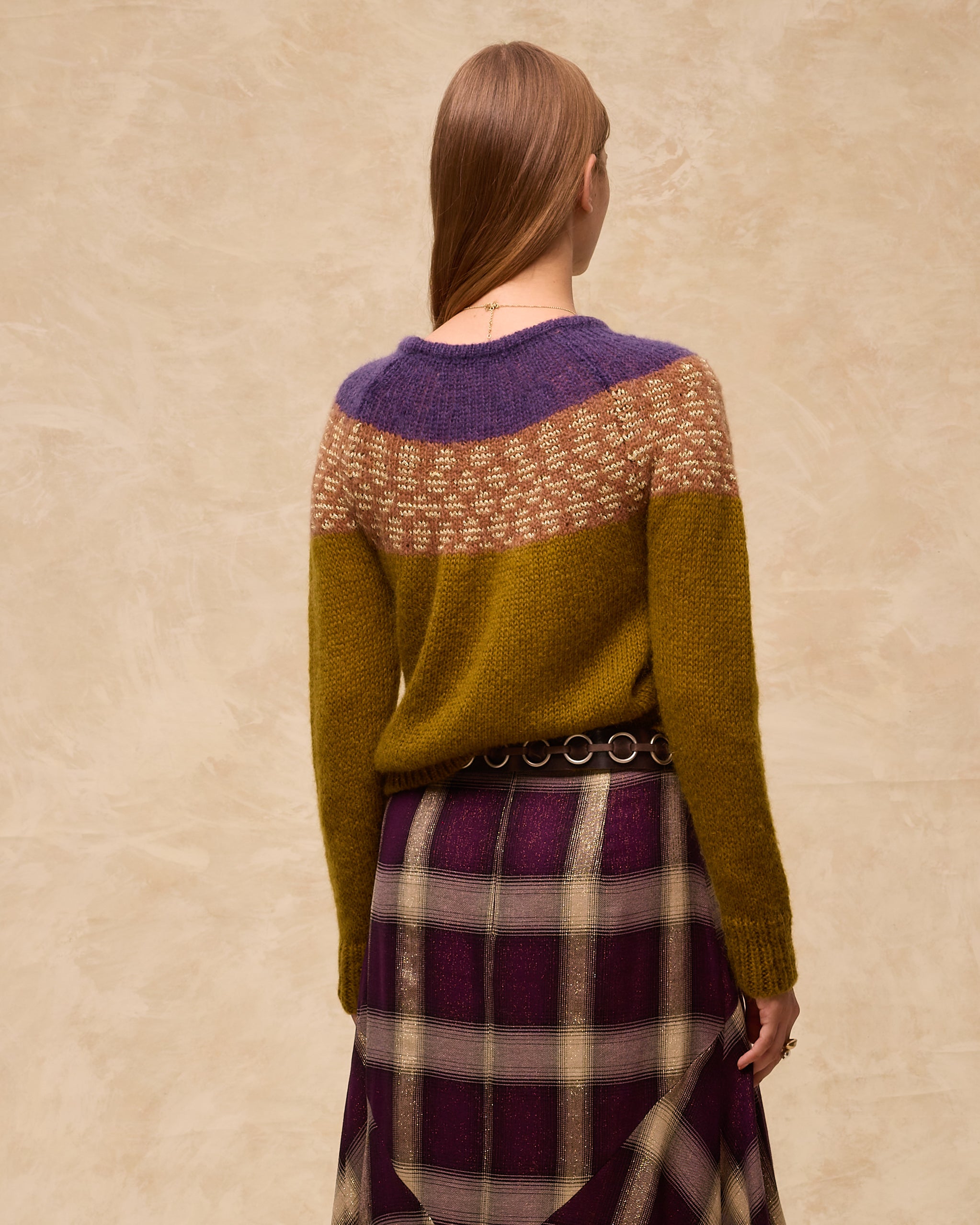 A contemporary take on seasonal layering, the Louvre Sweater is spun from a soft blend with mohair and merino wool for warmth without weight. The moss green base is offset by a striking colourblock yoke in soft bronze, shimmering gold and vivid violet, creating texture and contrast in every stitch.