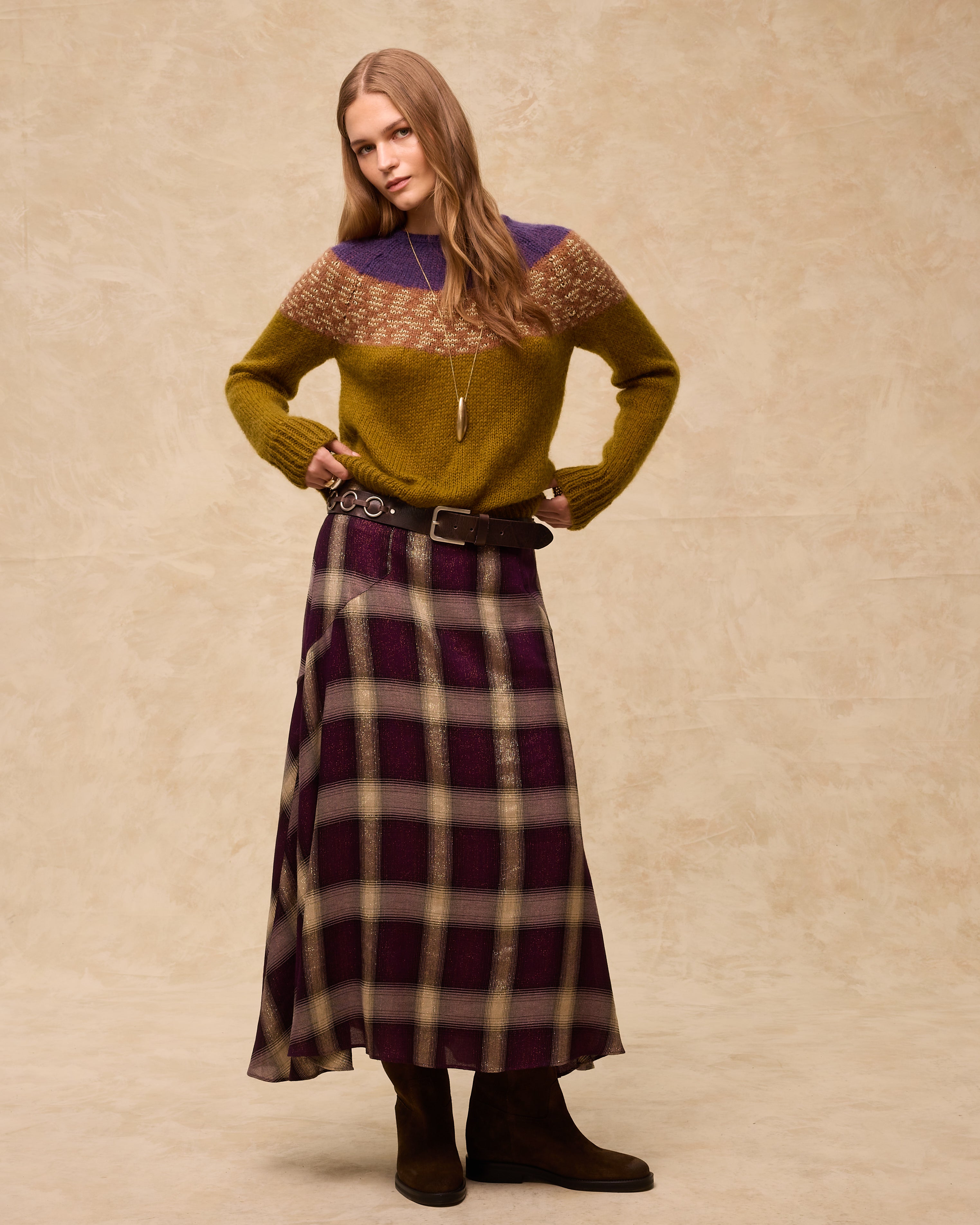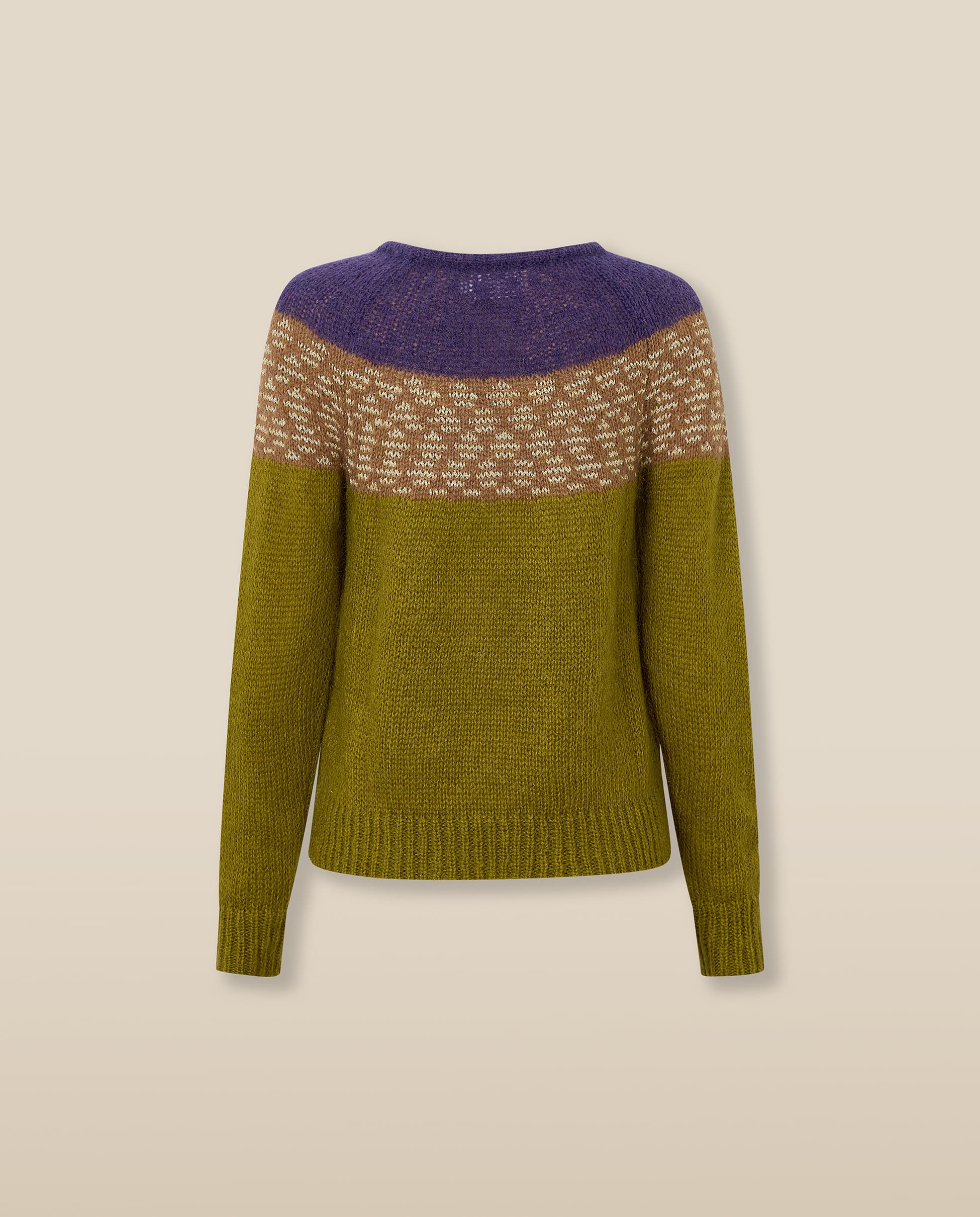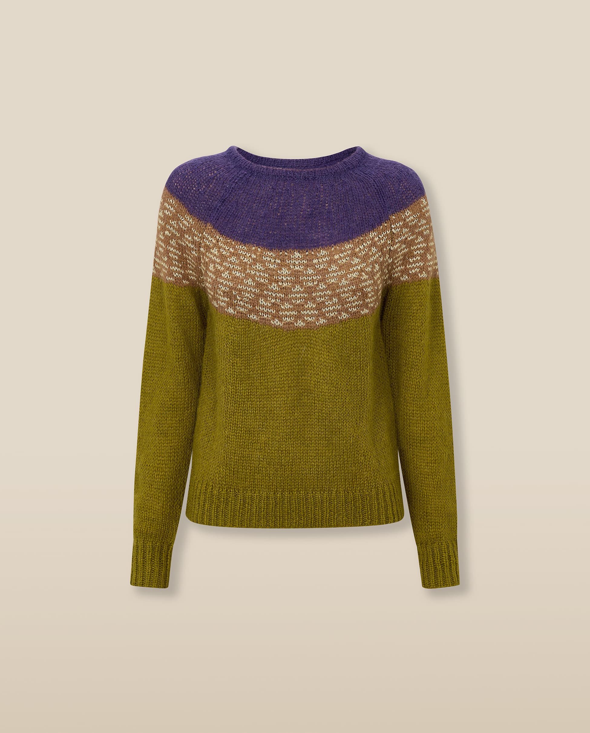 A contemporary take on seasonal layering, the Louvre Sweater is spun from a soft blend with mohair and merino wool for warmth without weight. The moss green base is offset by a striking colourblock yoke in soft bronze, shimmering gold and vivid violet, creating texture and contrast in every stitch.