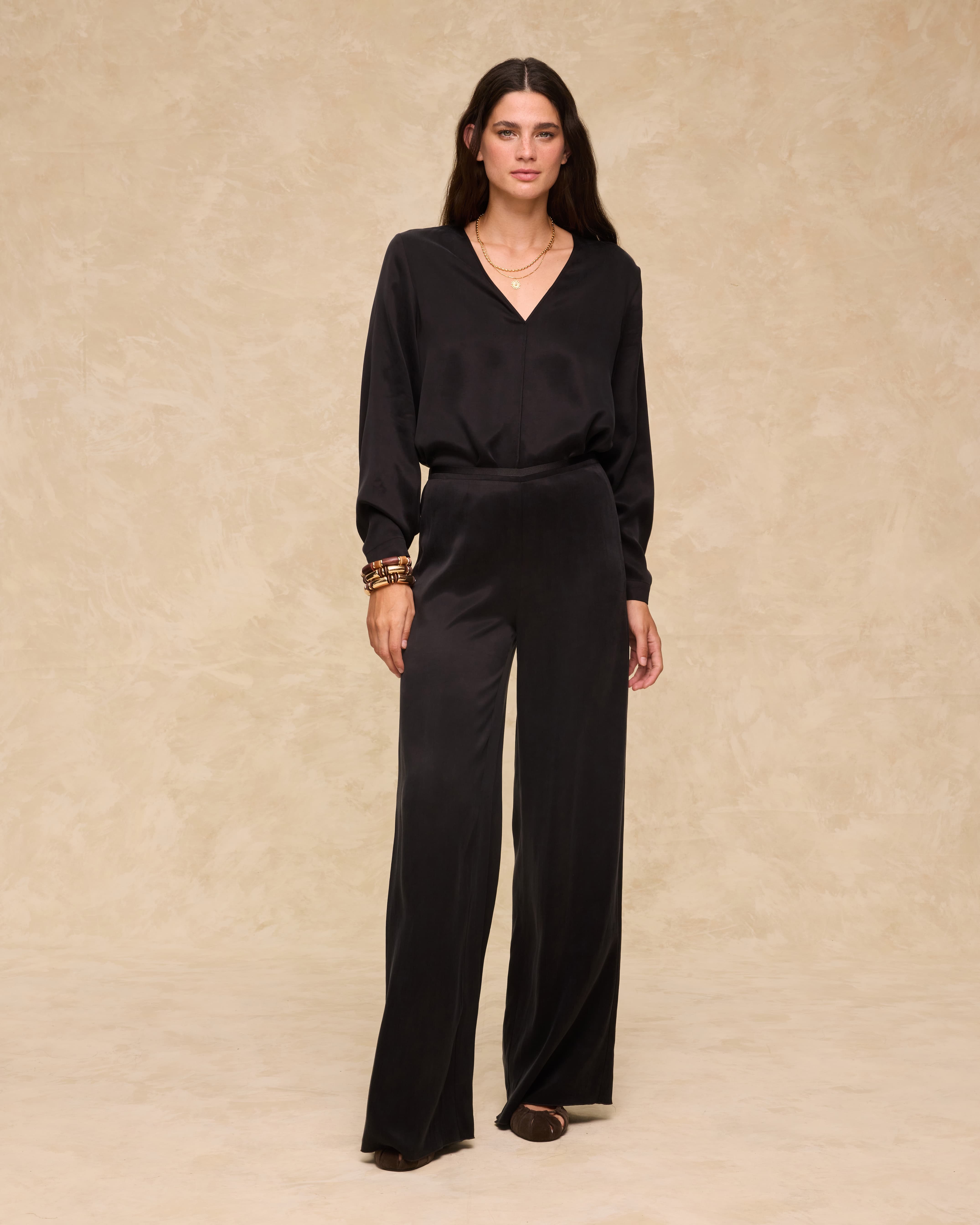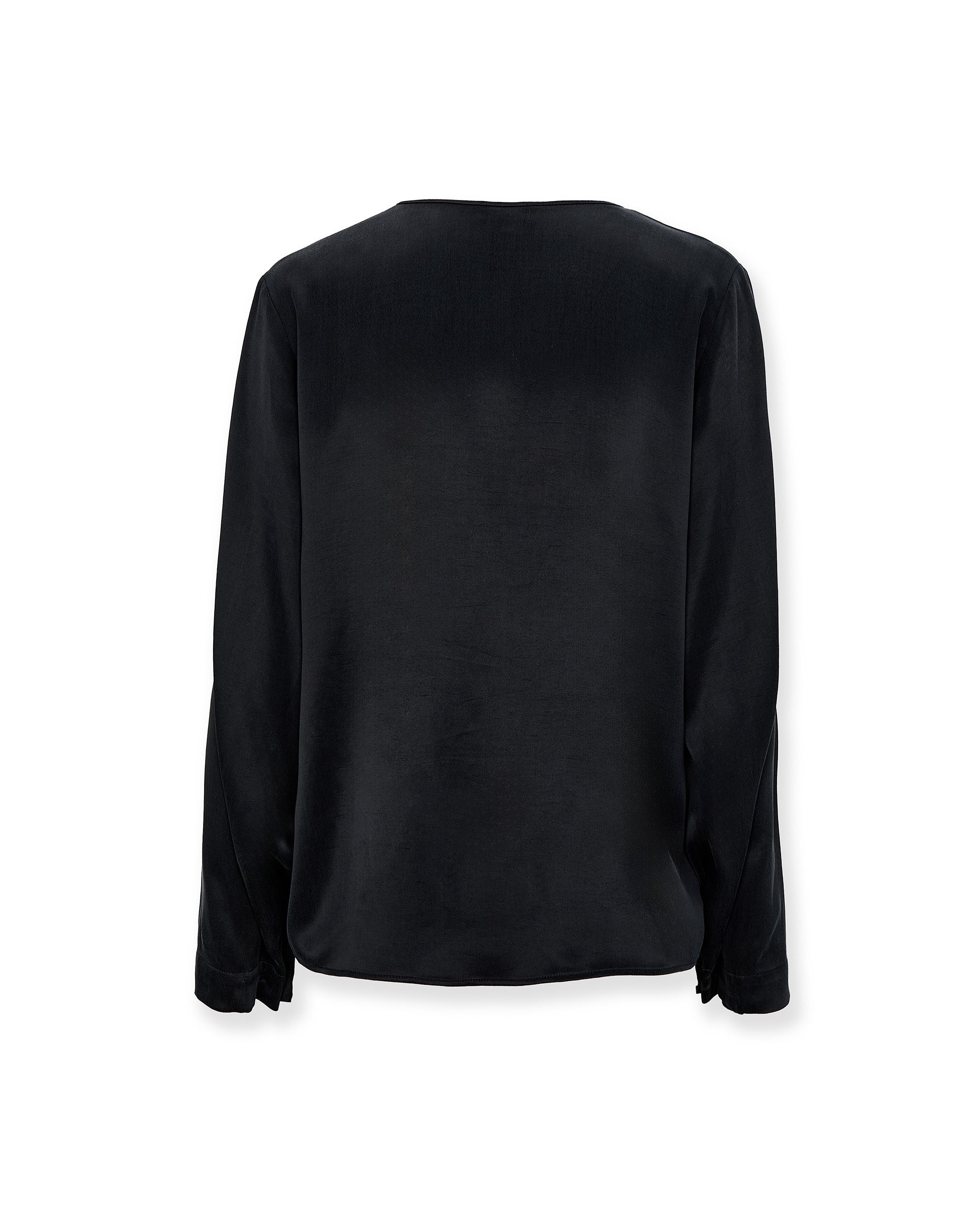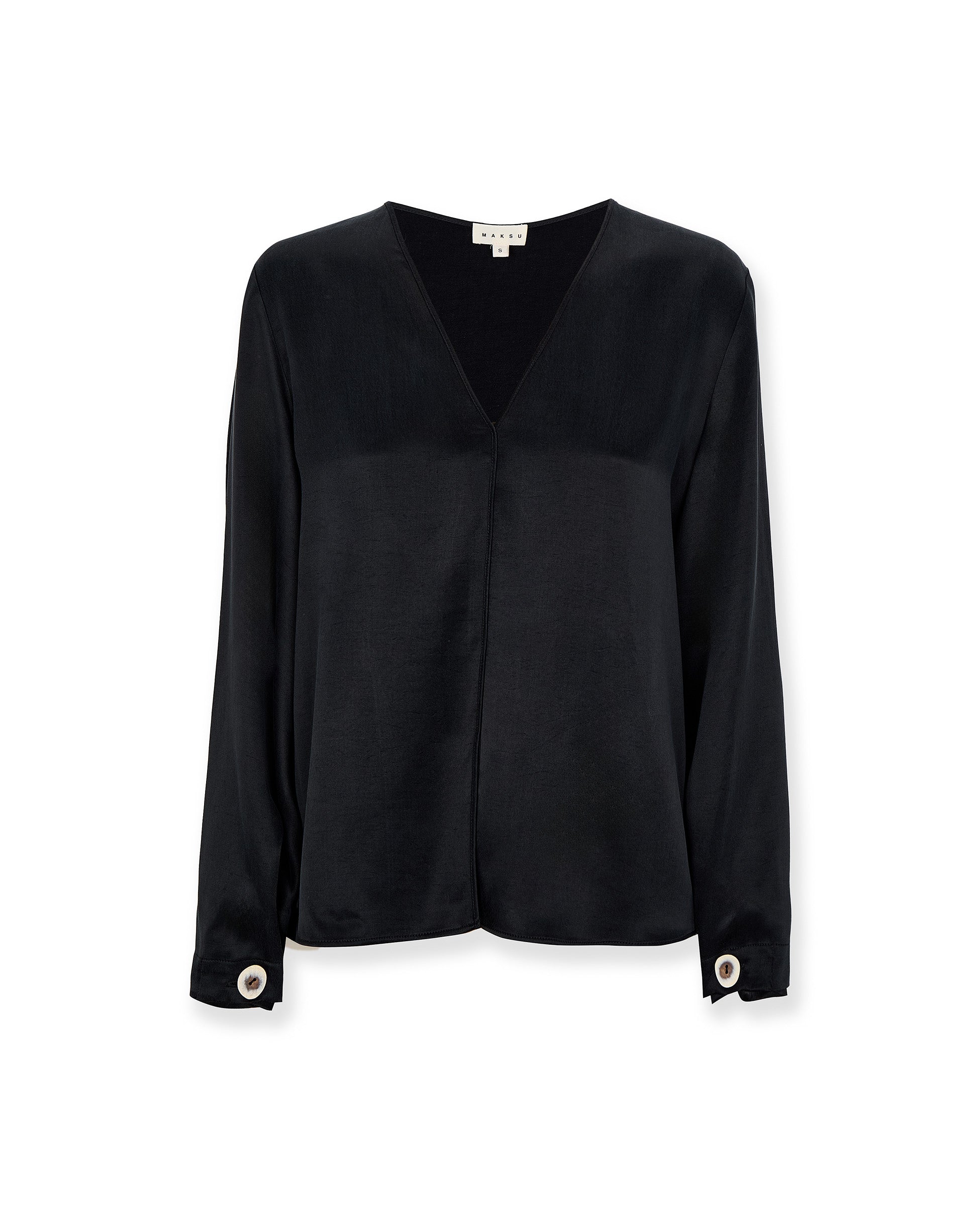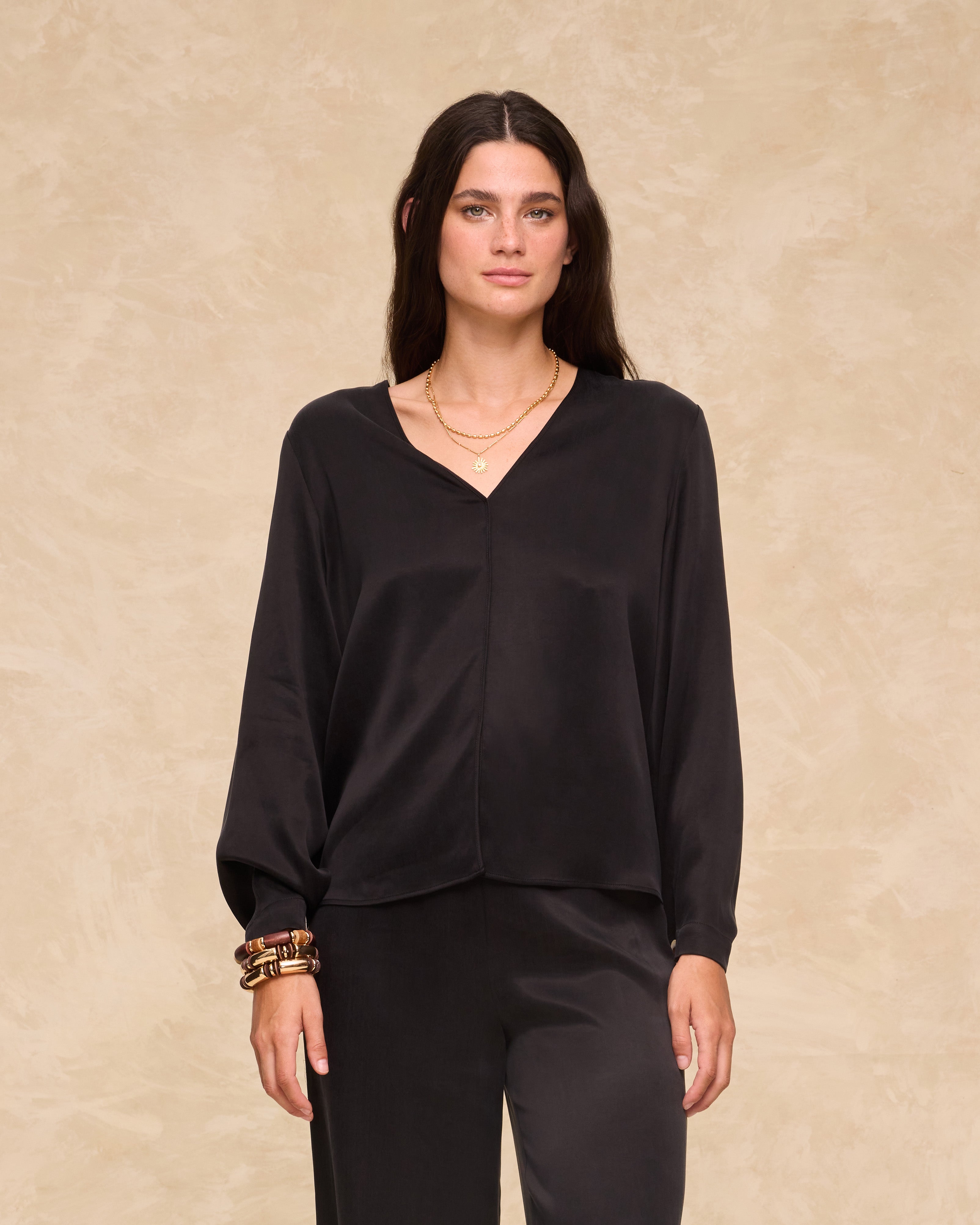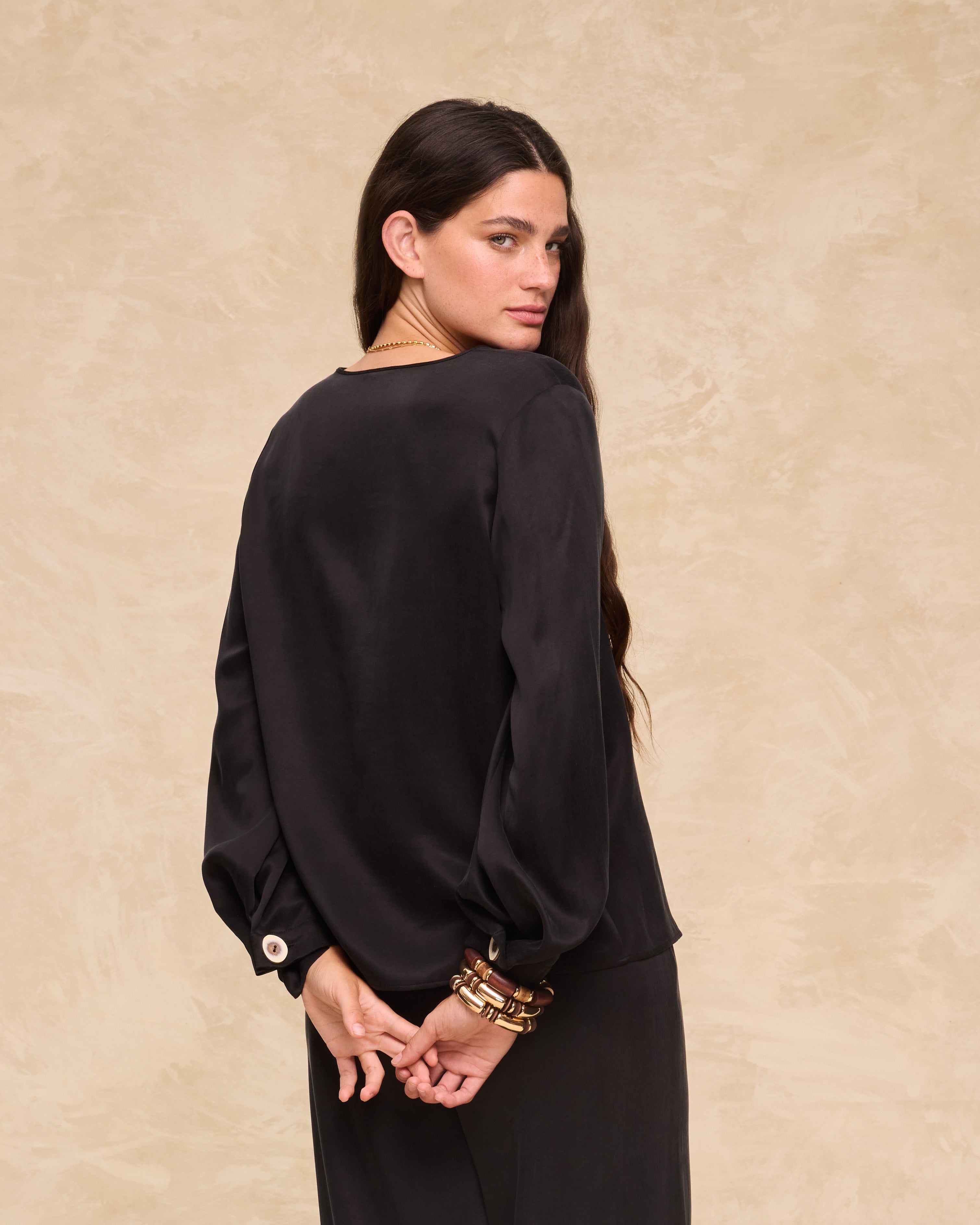 Understated yet refined, the Mae blouse is cut from a soft cupro-viscose blend with elegant drape and subtle sheen. Designed with a deep V neckline and relaxed silhouette, it features gently gathered long sleeves finished with contrast button cuffs for a polished touch.