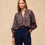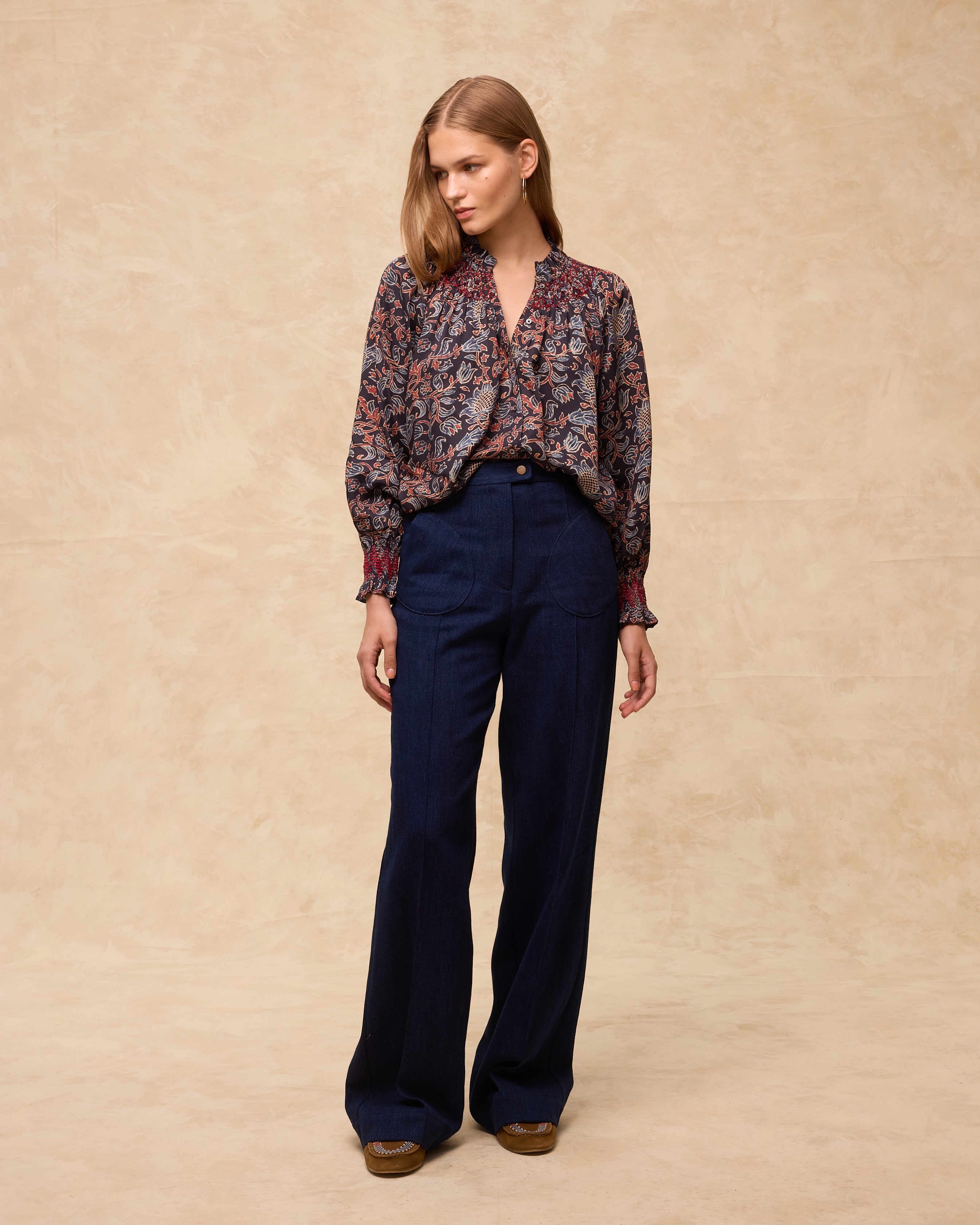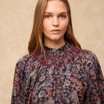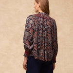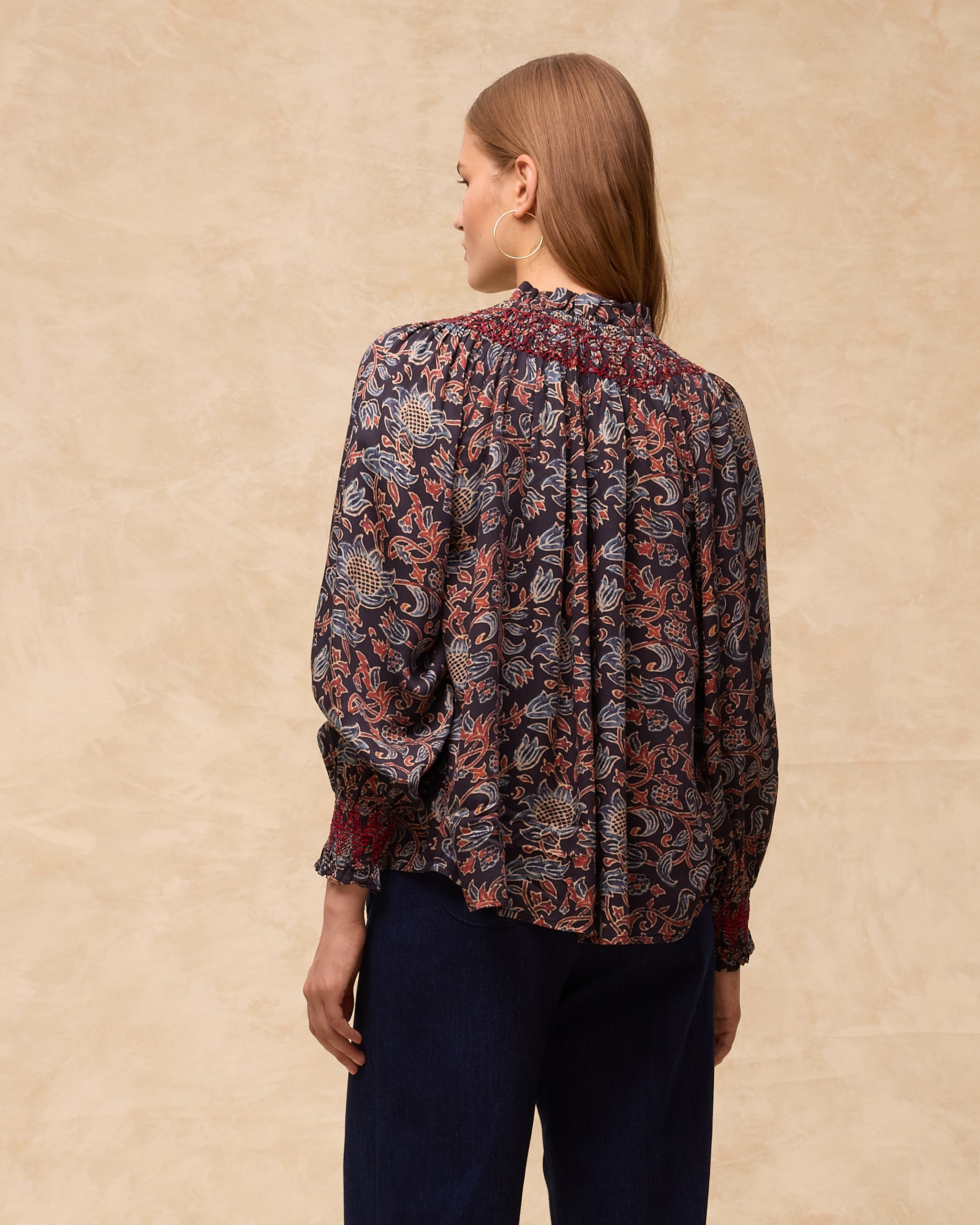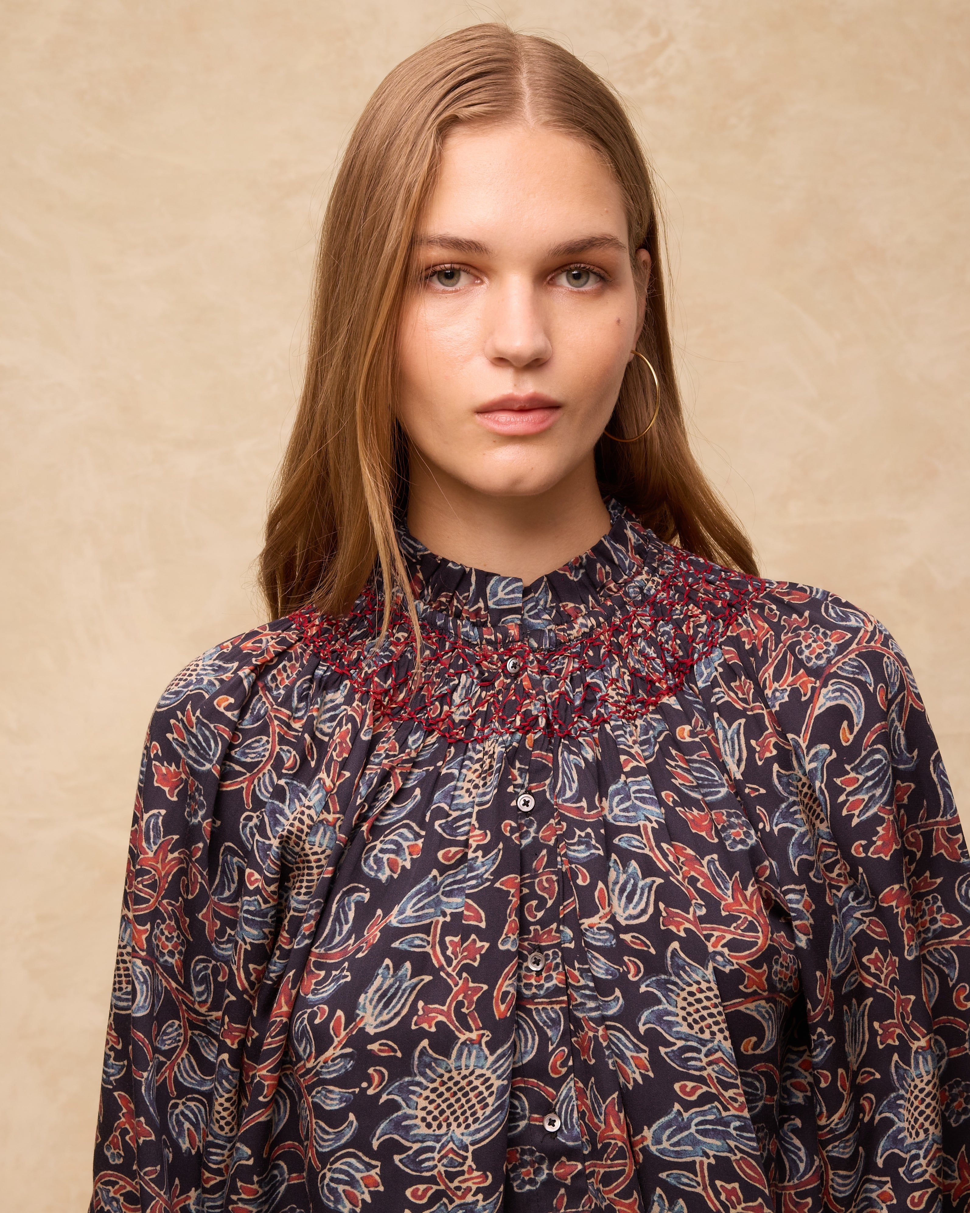 Crafted from lightweight 100% modal, the Maretoile blouse showcases a vintage-inspired floral print in navy, brick red and muted ivory. The gently gathered silhouette is framed by a hand-smocked neckline with tonal embroidery, while the long sleeves finish with smocked cuffs for subtle volume. A refined piece that balances craftsmanship and comfort.