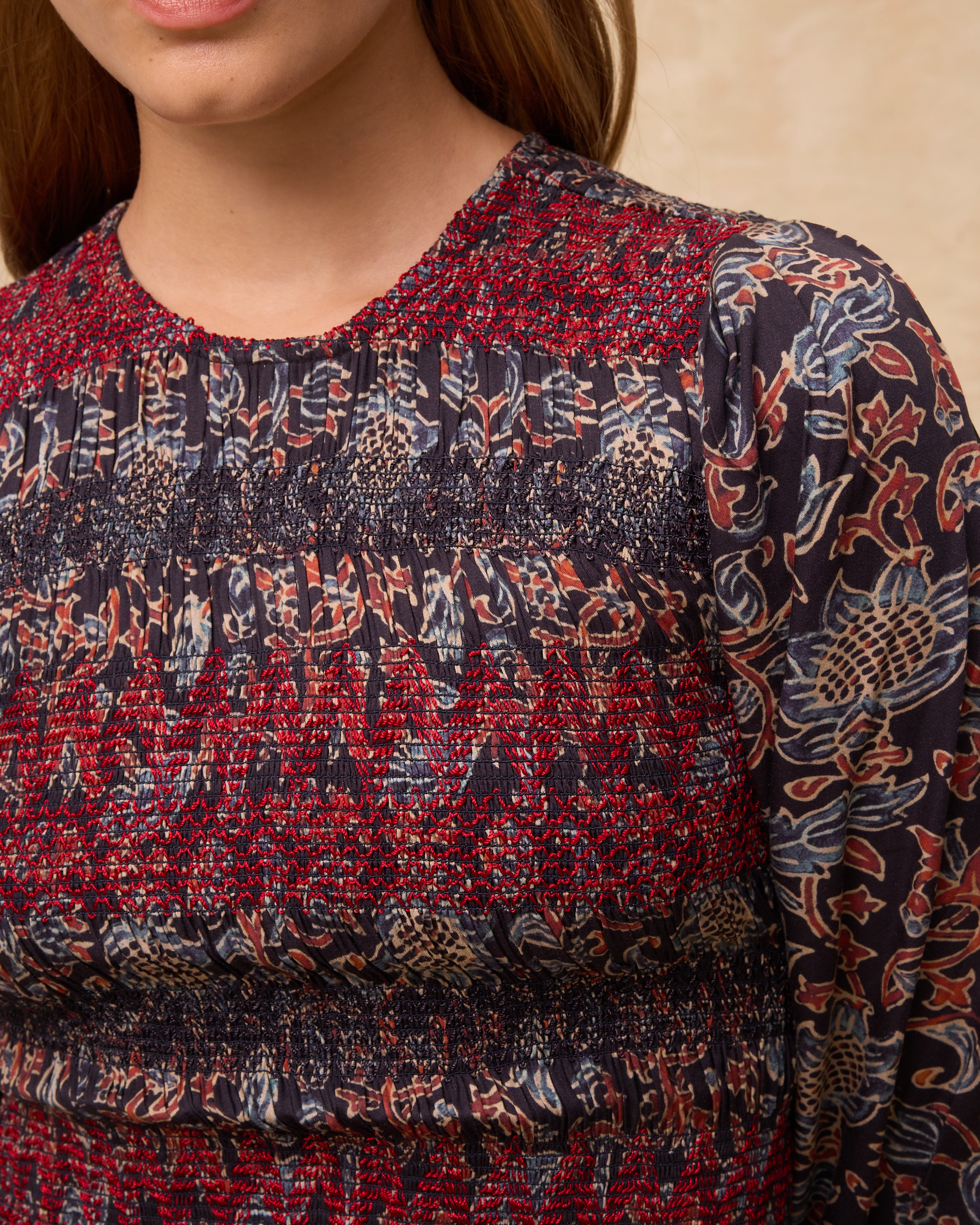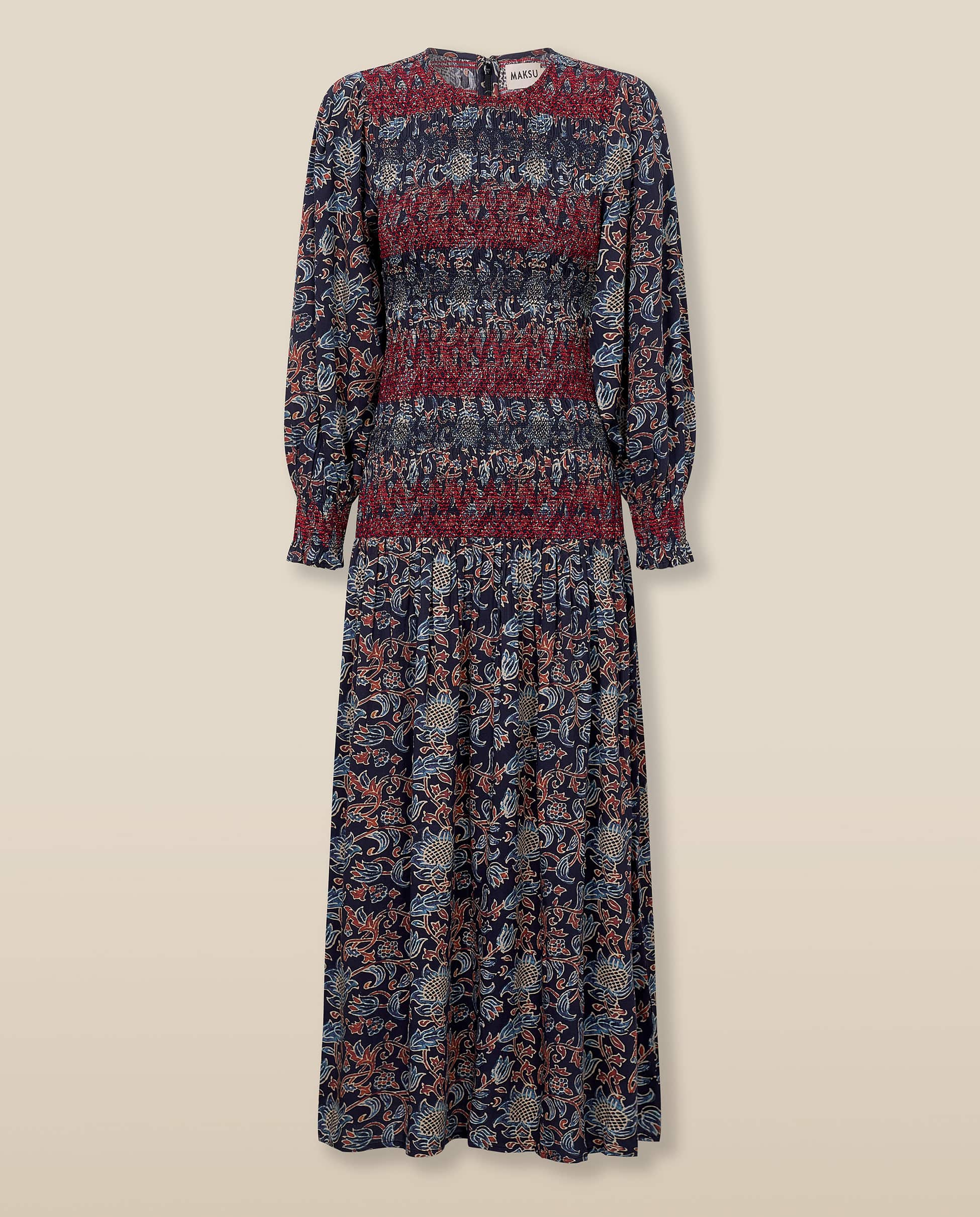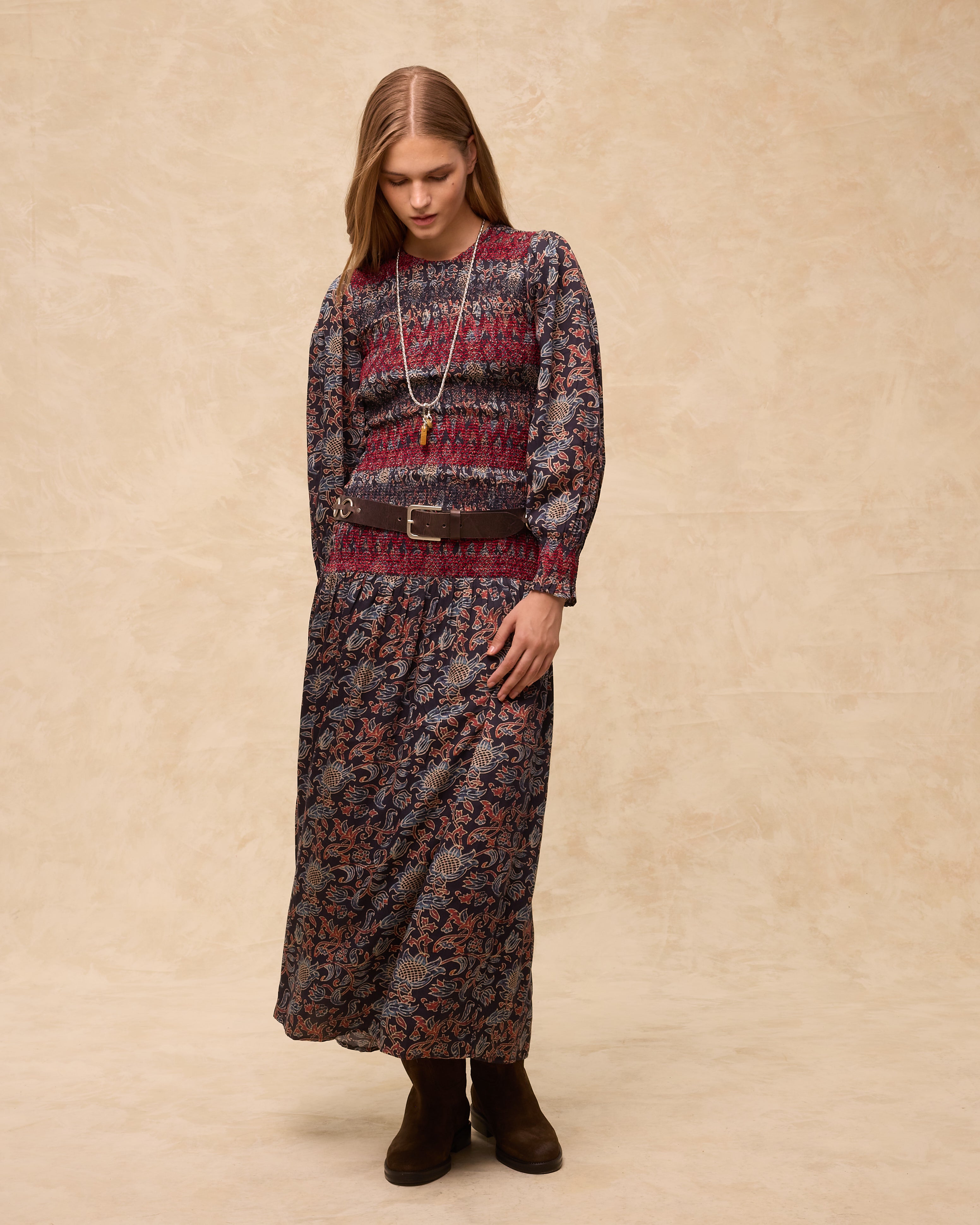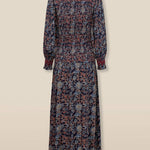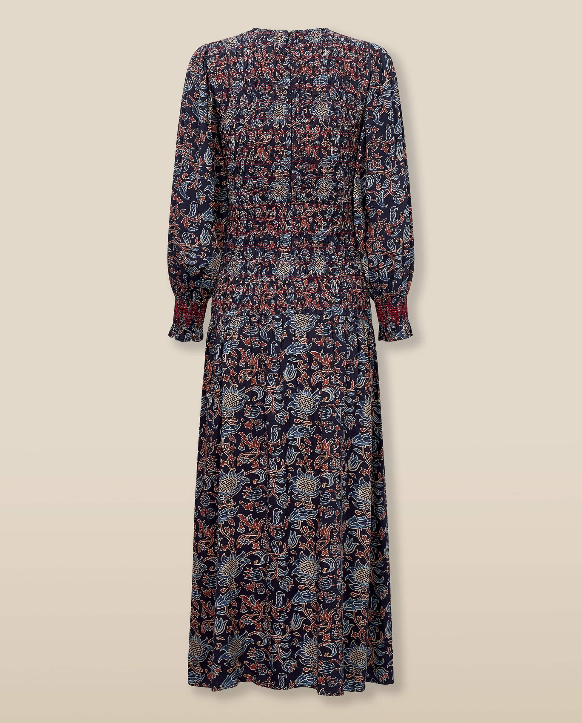 Crafted from 100% modal, the Maretoile Dress is defined by its fluid drape and artisanal detail. The silhouette is gently structured with wide embroidered smocking across the bodice and cuffs, giving way to a softly gathered skirt that falls to midi length. The floral print blends warm reds, navy and soft neutrals for a timelessly feminine look.
