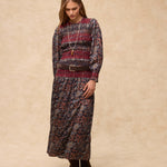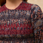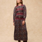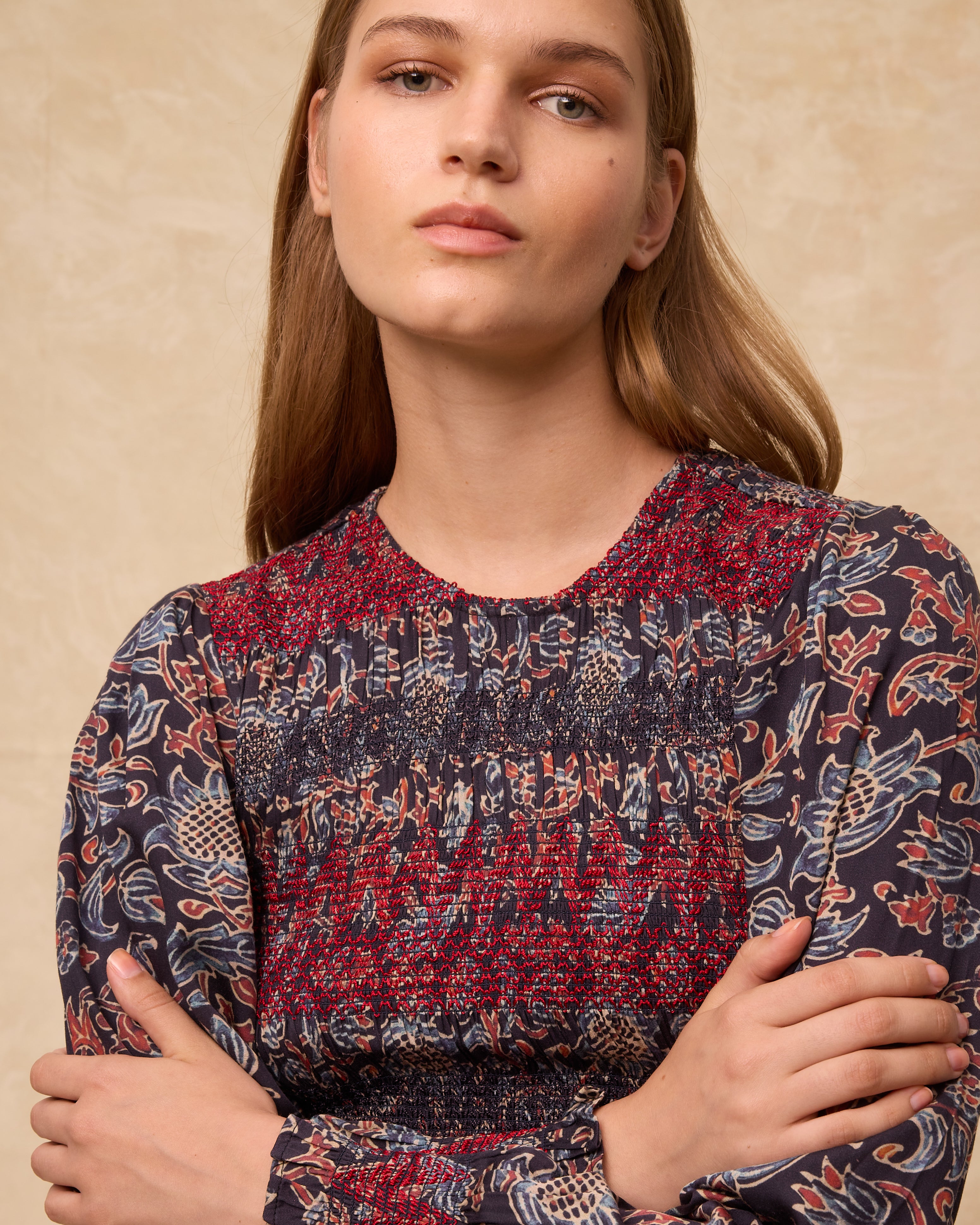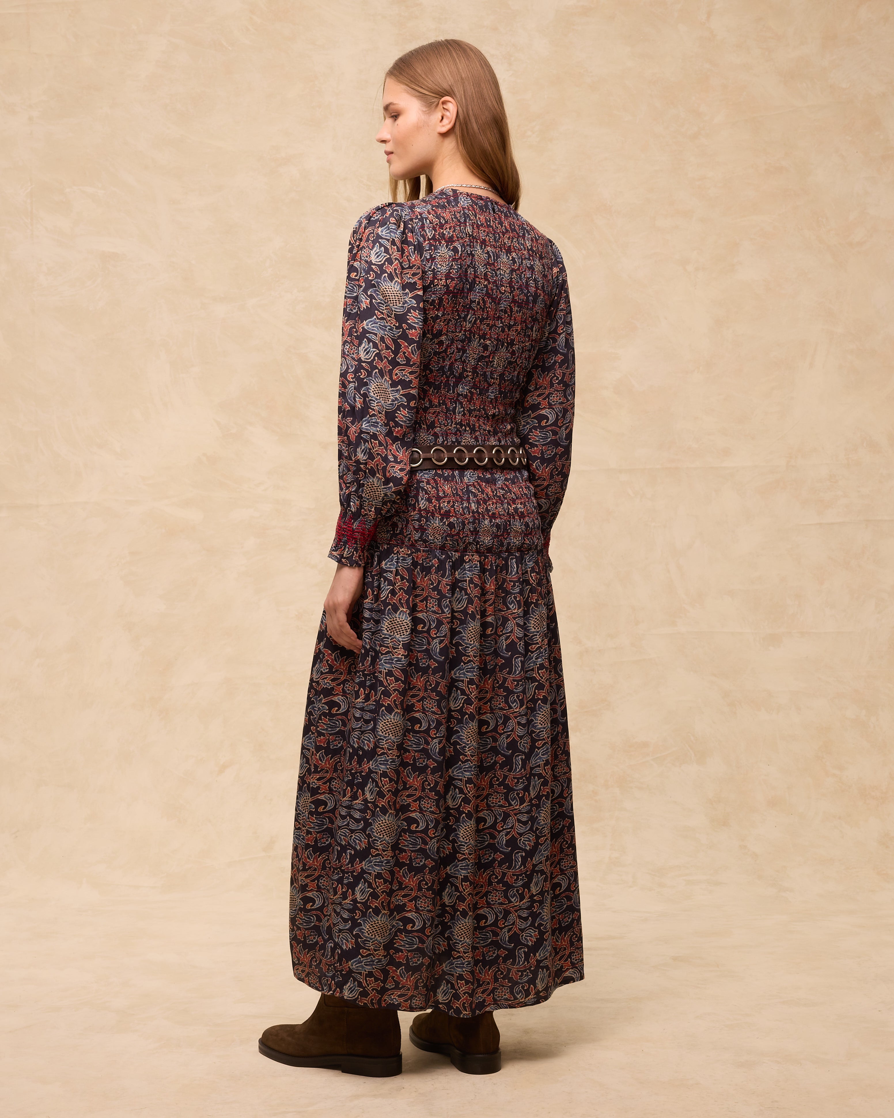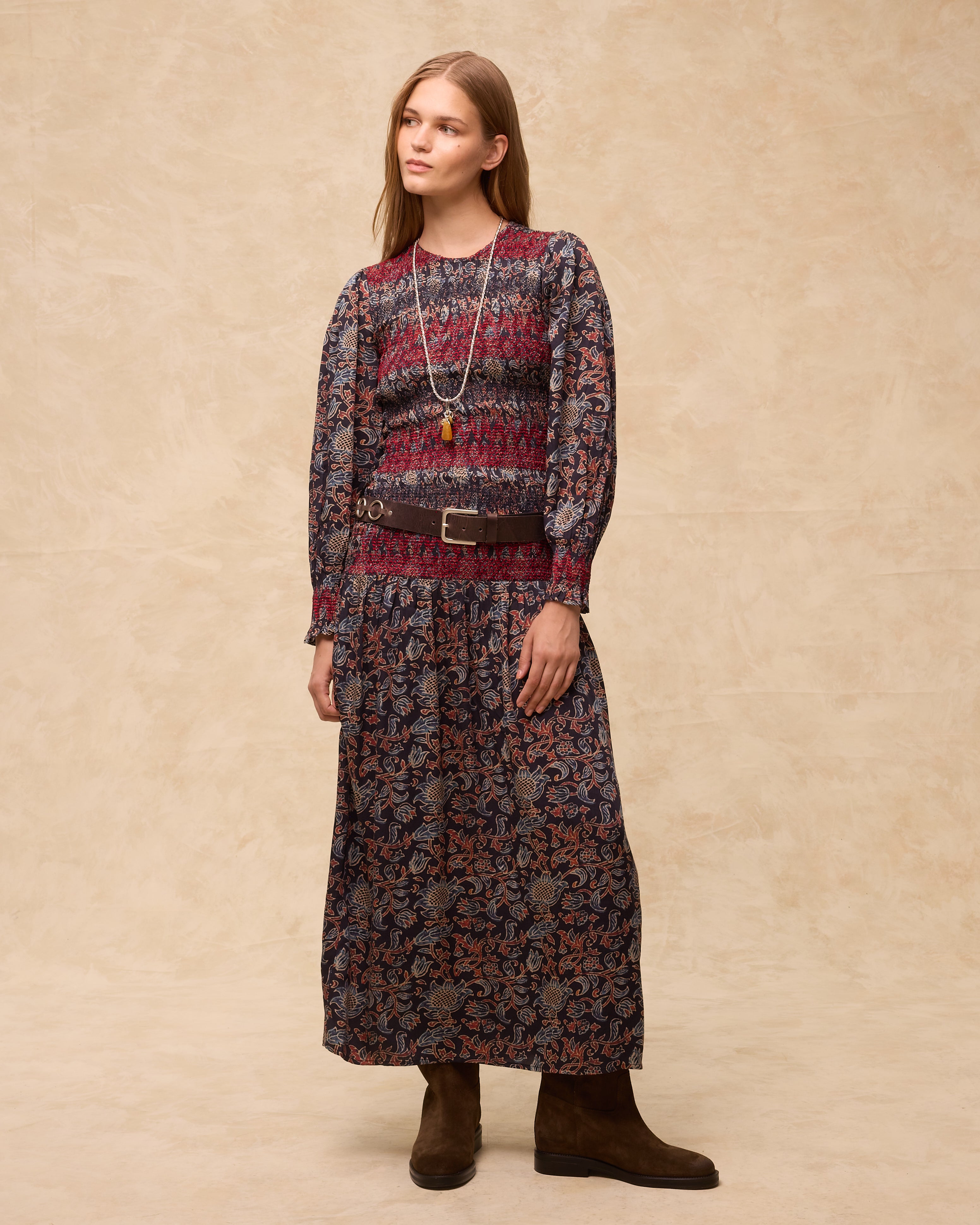 Crafted from 100% modal, the Maretoile Dress is defined by its fluid drape and artisanal detail. The silhouette is gently structured with wide embroidered smocking across the bodice and cuffs, giving way to a softly gathered skirt that falls to midi length. The floral print blends warm reds, navy and soft neutrals for a timelessly feminine look.