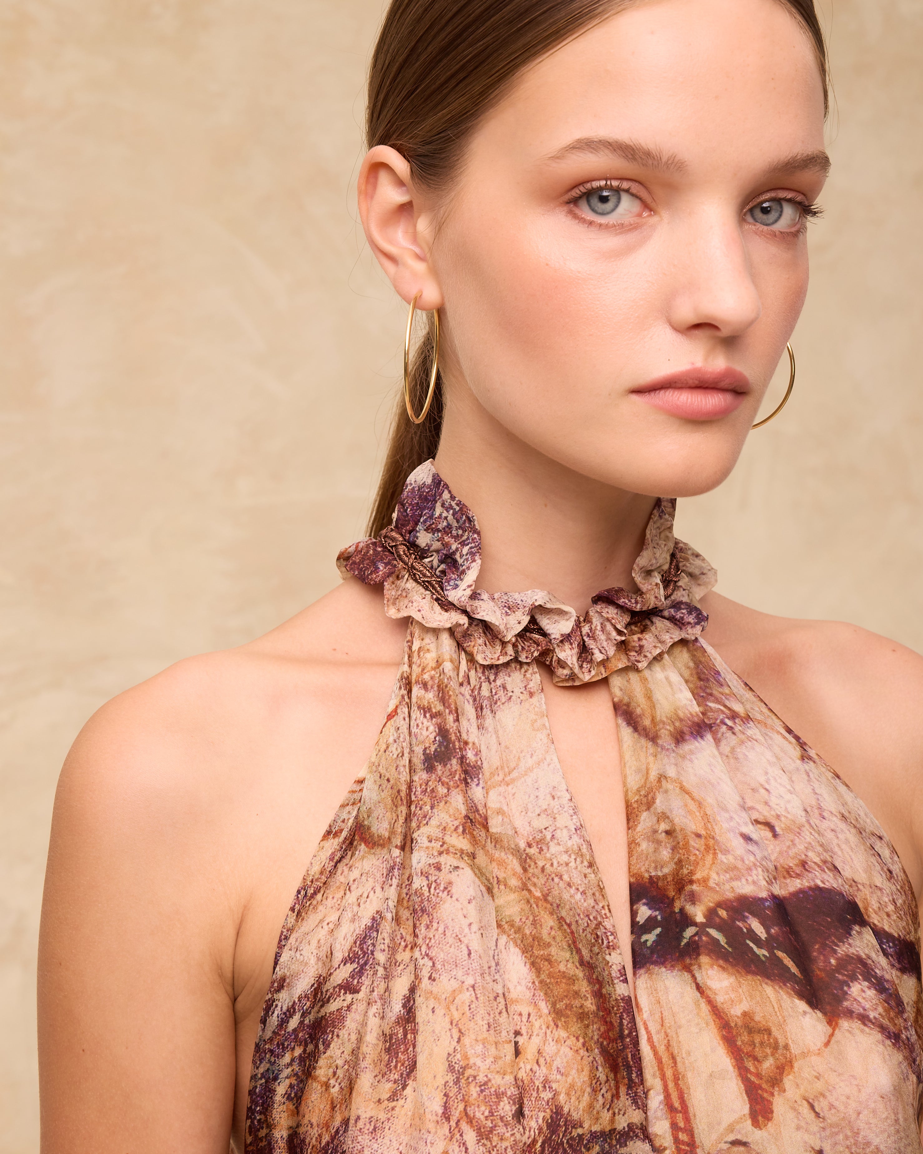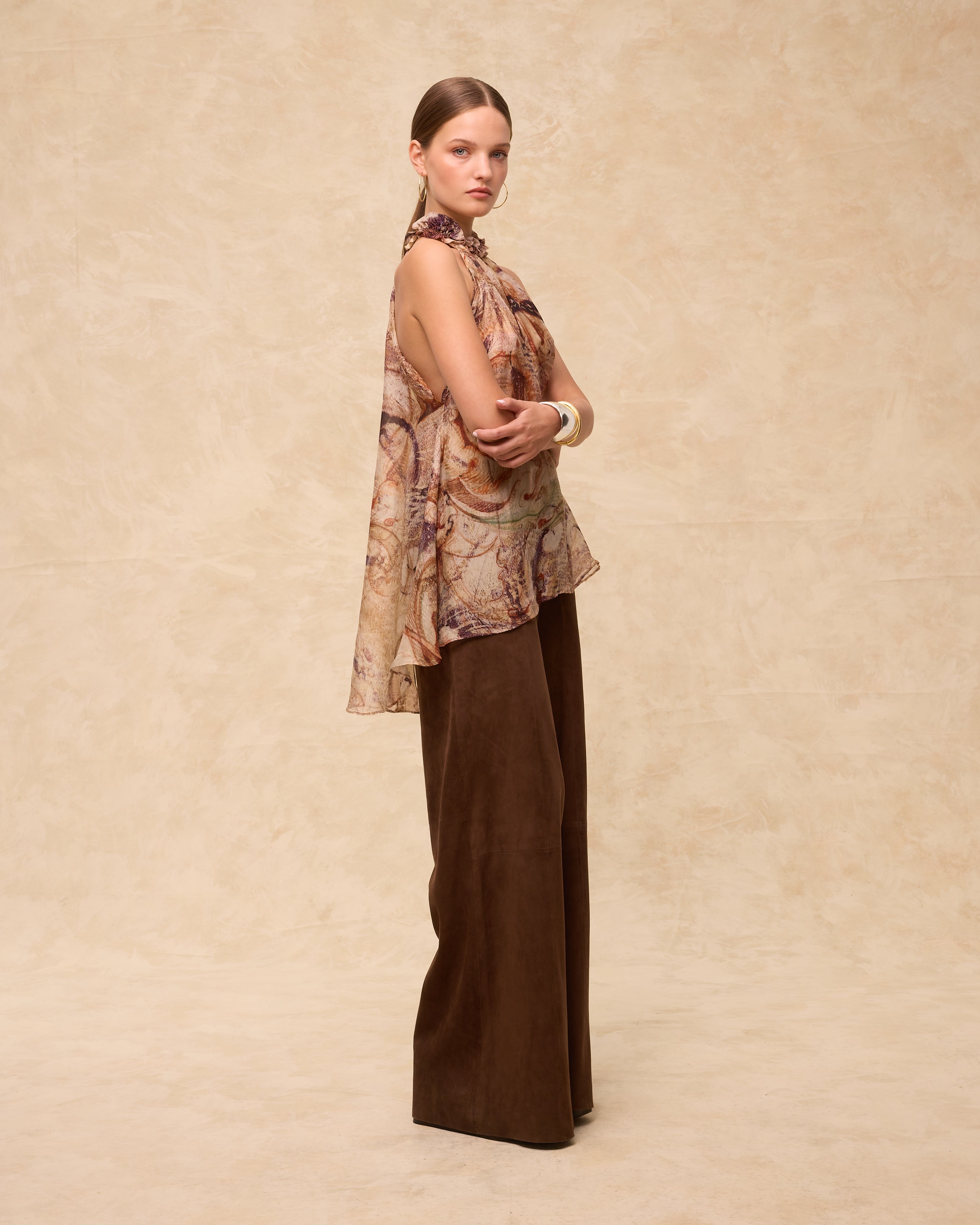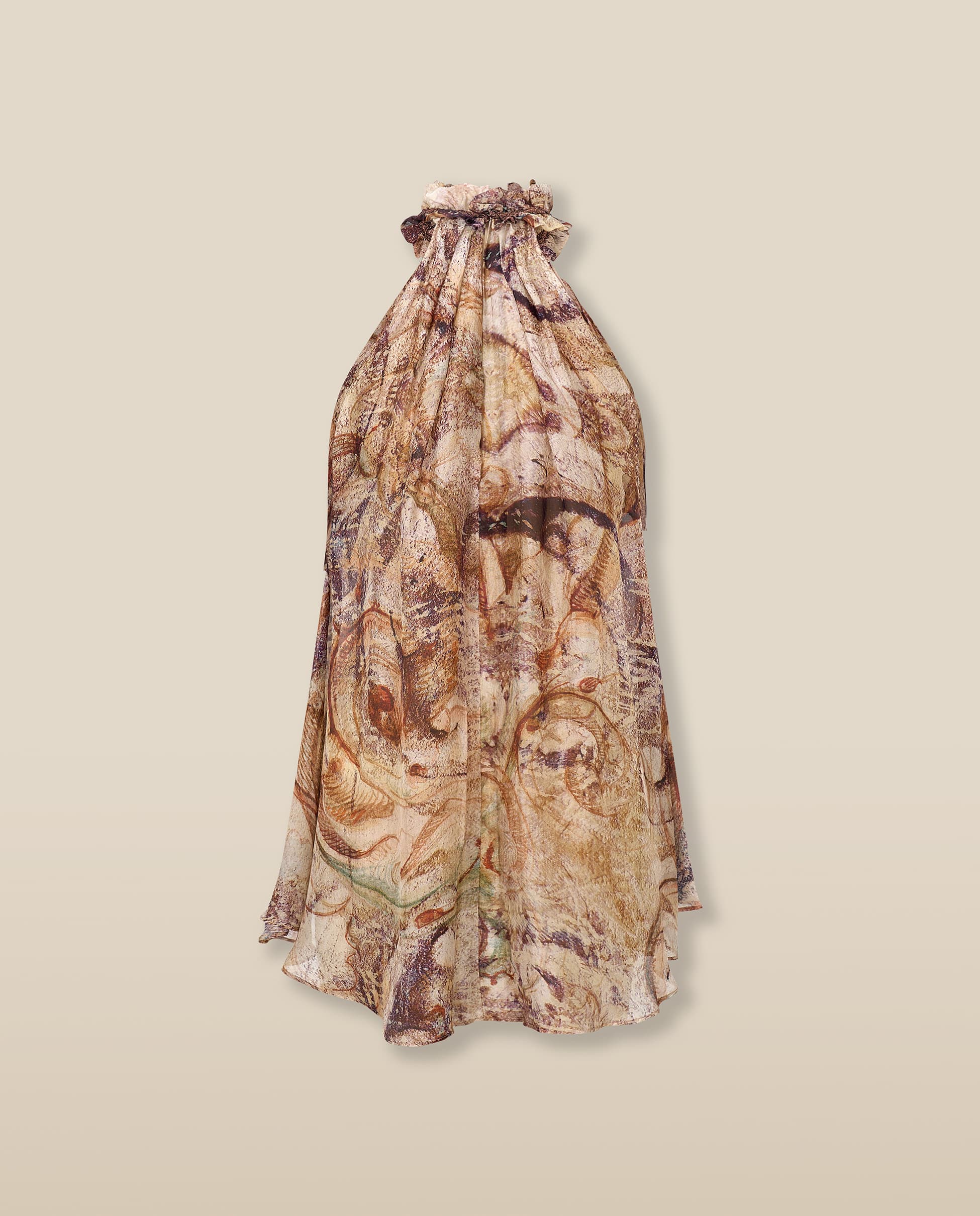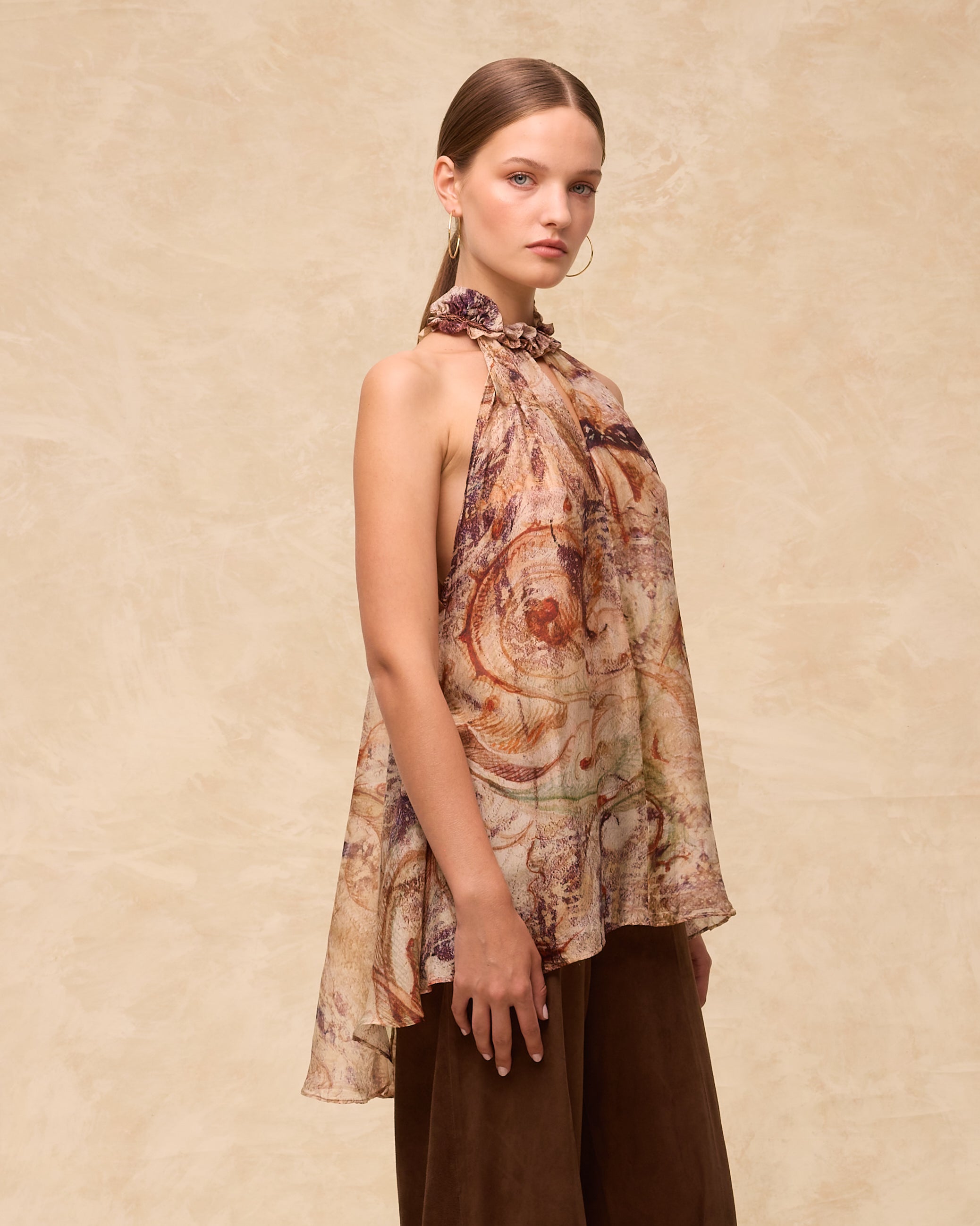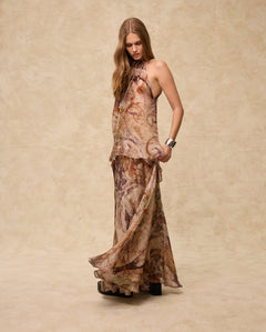 Soft and sculptural, the Marsiglia Top is crafted from Italian fabric in a washable silk-blend with a digitally printed marble-effect motif. Designed with a high halter neckline and layered asymmetric silhouette, it drapes with natural movement for an elevated warm-weather look. Pair with the matching skirt for a striking head-to-toe statement.