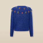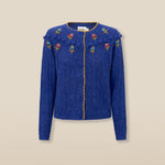 A rich blend of heritage and craft, the Miley cardigan is woven in a vibrant blue wool blend with intricate floral embroidery across the shoulders and chest. Its softly textured finish is enhanced with tonal pompom details and contrast crochet edging along the neckline and opening. Designed for layering, it features a lightly cropped silhouette with long sleeves and a clean open front.