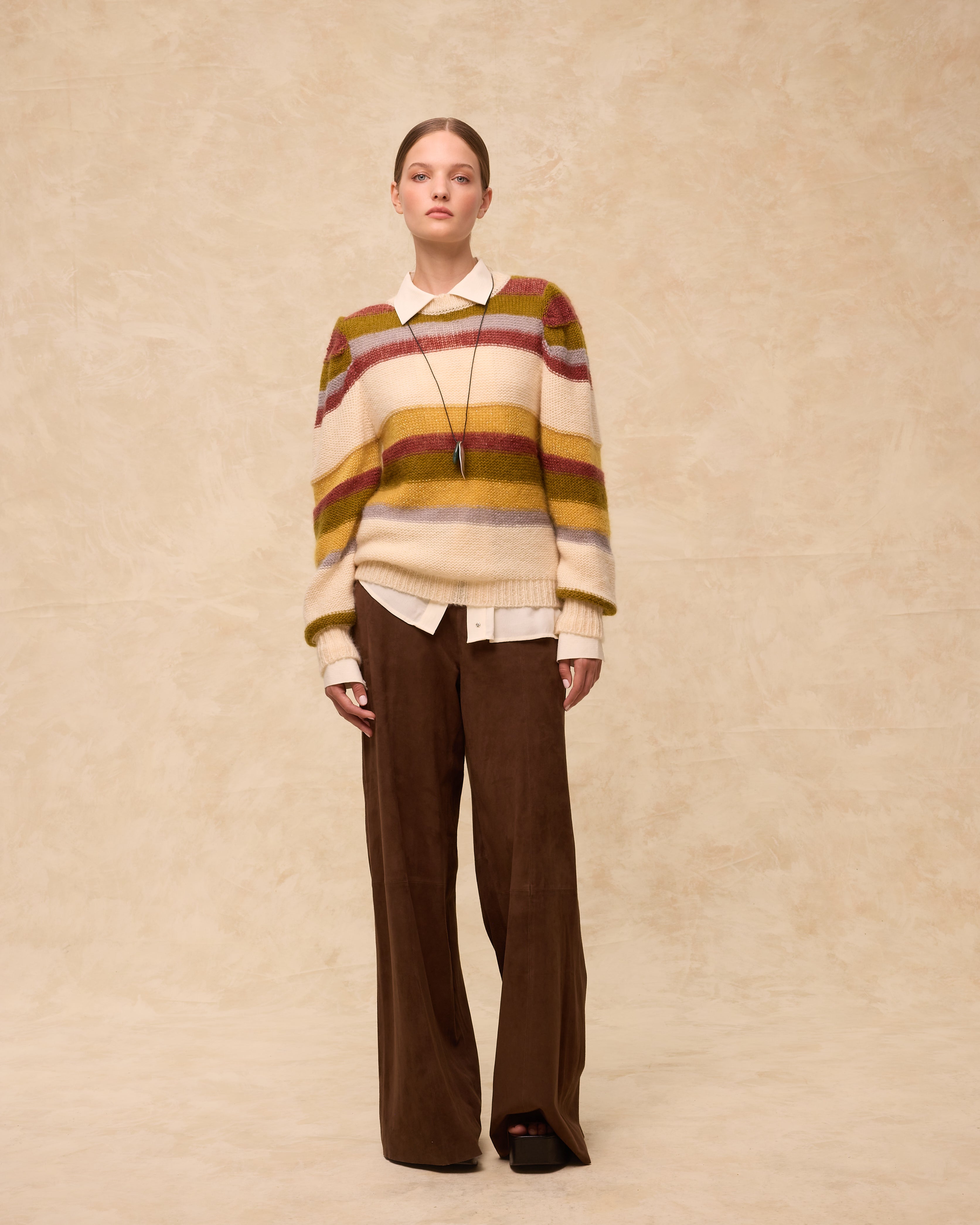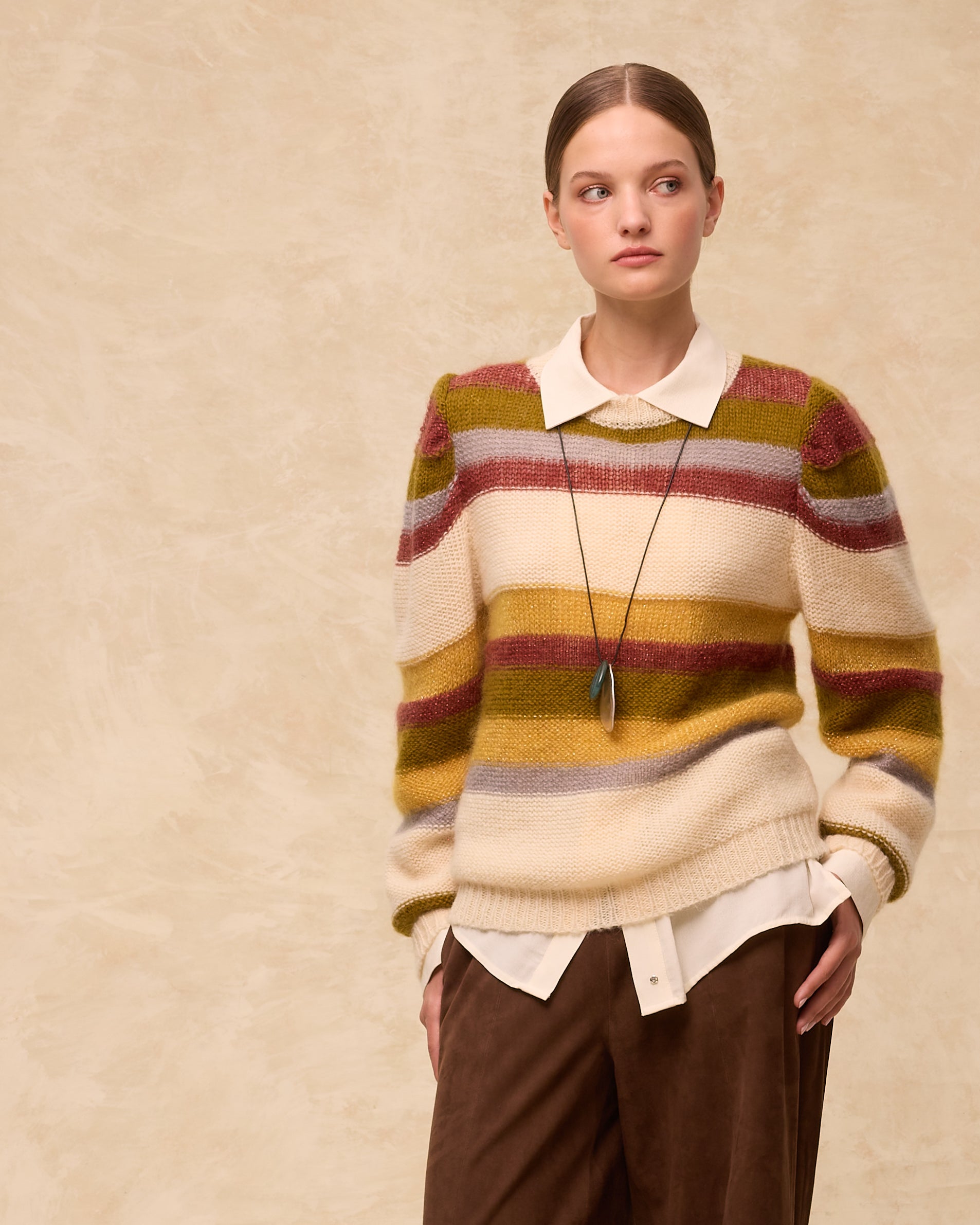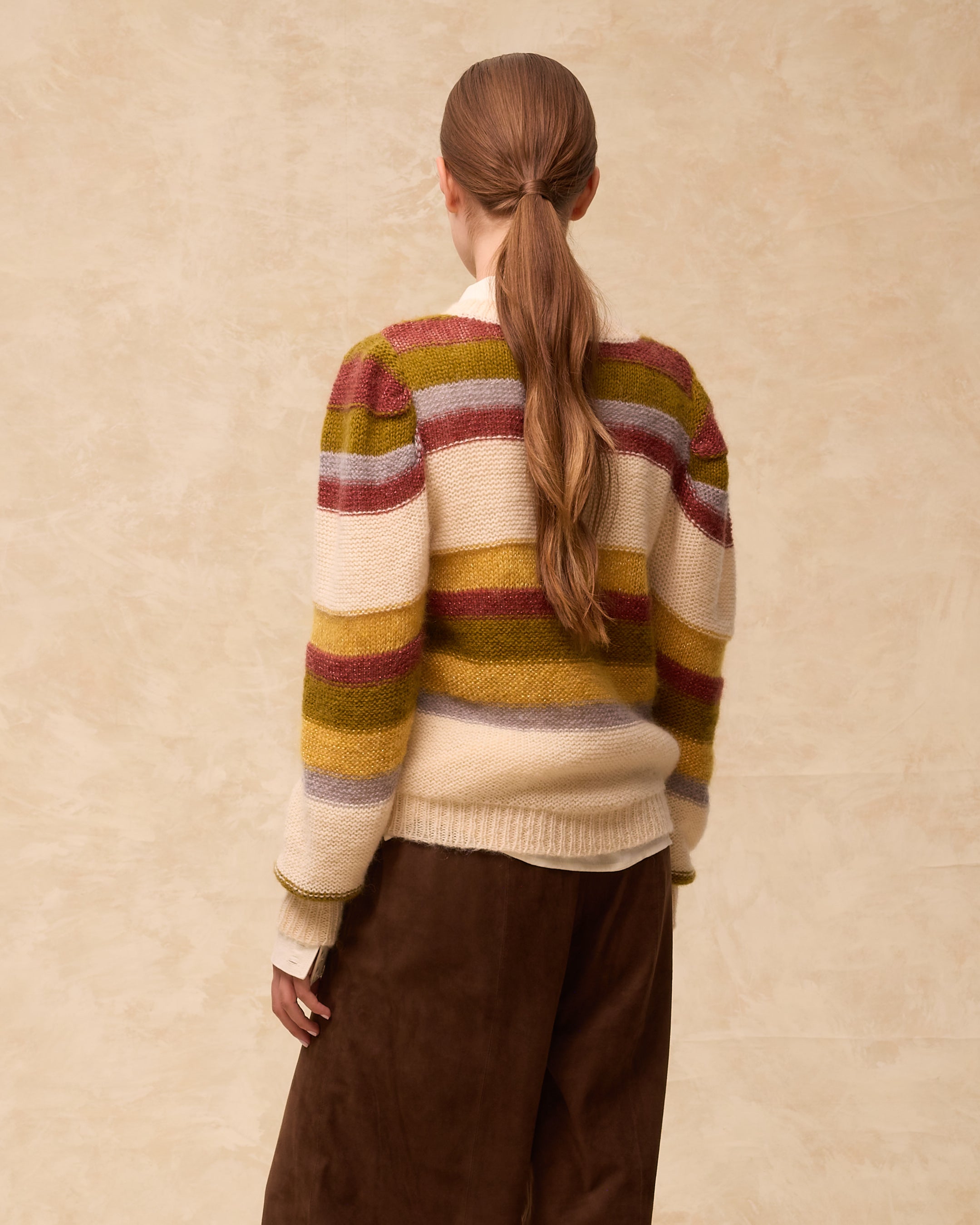 Playful yet refined, the Mint sweater is defined by its softly voluminous sleeves and painterly horizontal stripes in warm, earthy tones. Knitted with touches of mohair, wool and metallic yarn, it offers a rich mix of texture and light. Ribbed trims at the cuffs and hem complete the look with casual polish.