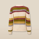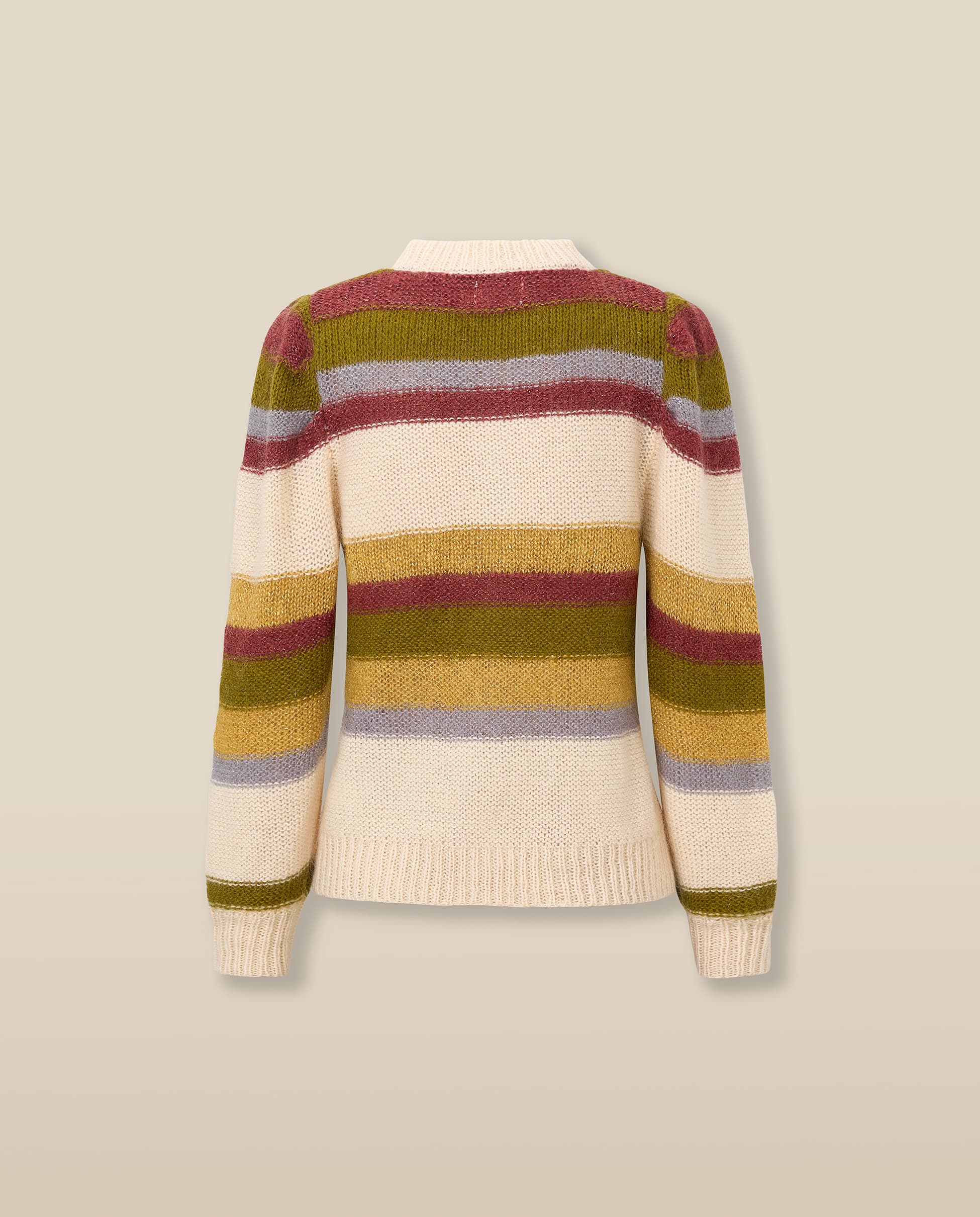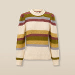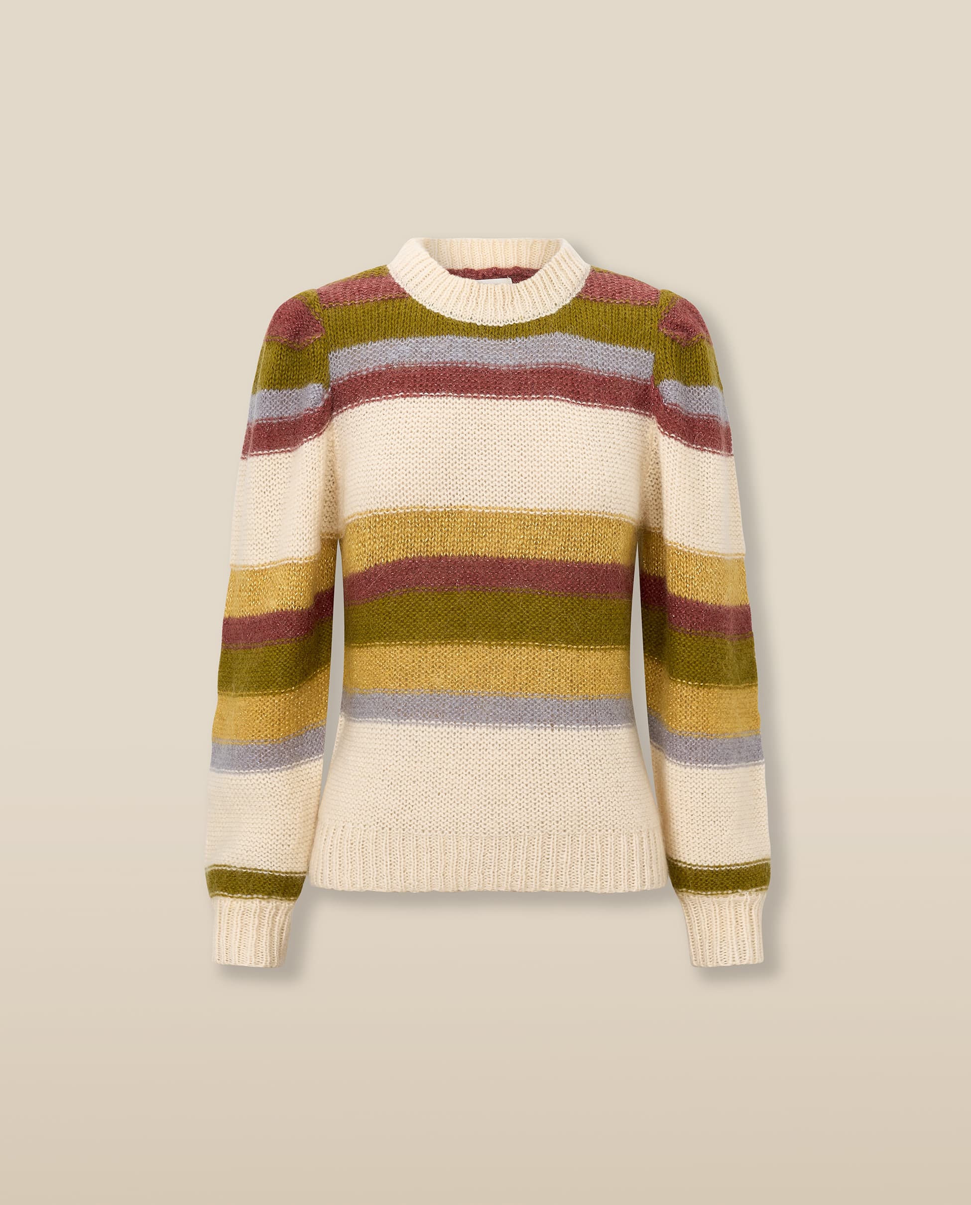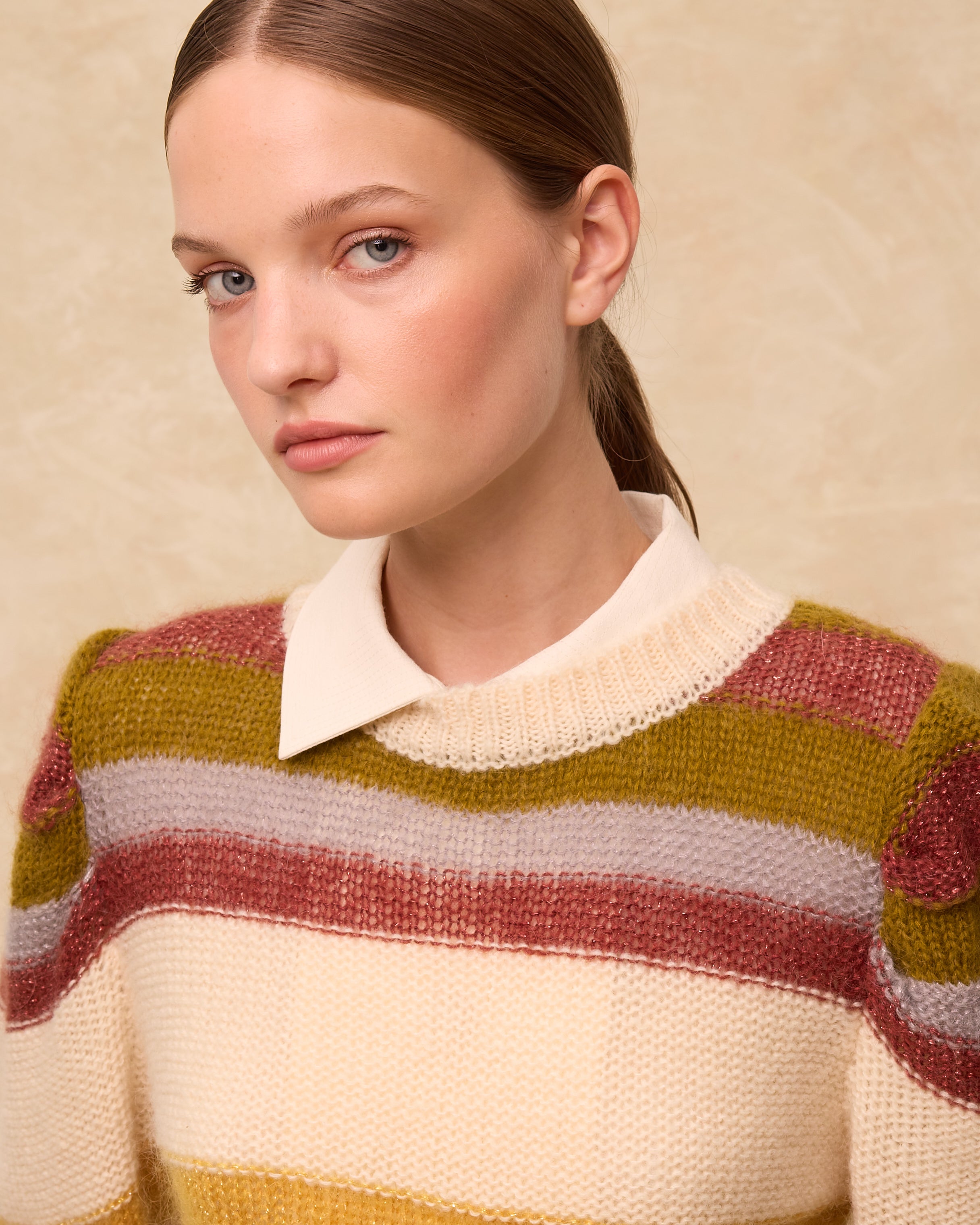 Playful yet refined, the Mint sweater is defined by its softly voluminous sleeves and painterly horizontal stripes in warm, earthy tones. Knitted with touches of mohair, wool and metallic yarn, it offers a rich mix of texture and light. Ribbed trims at the cuffs and hem complete the look with casual polish.