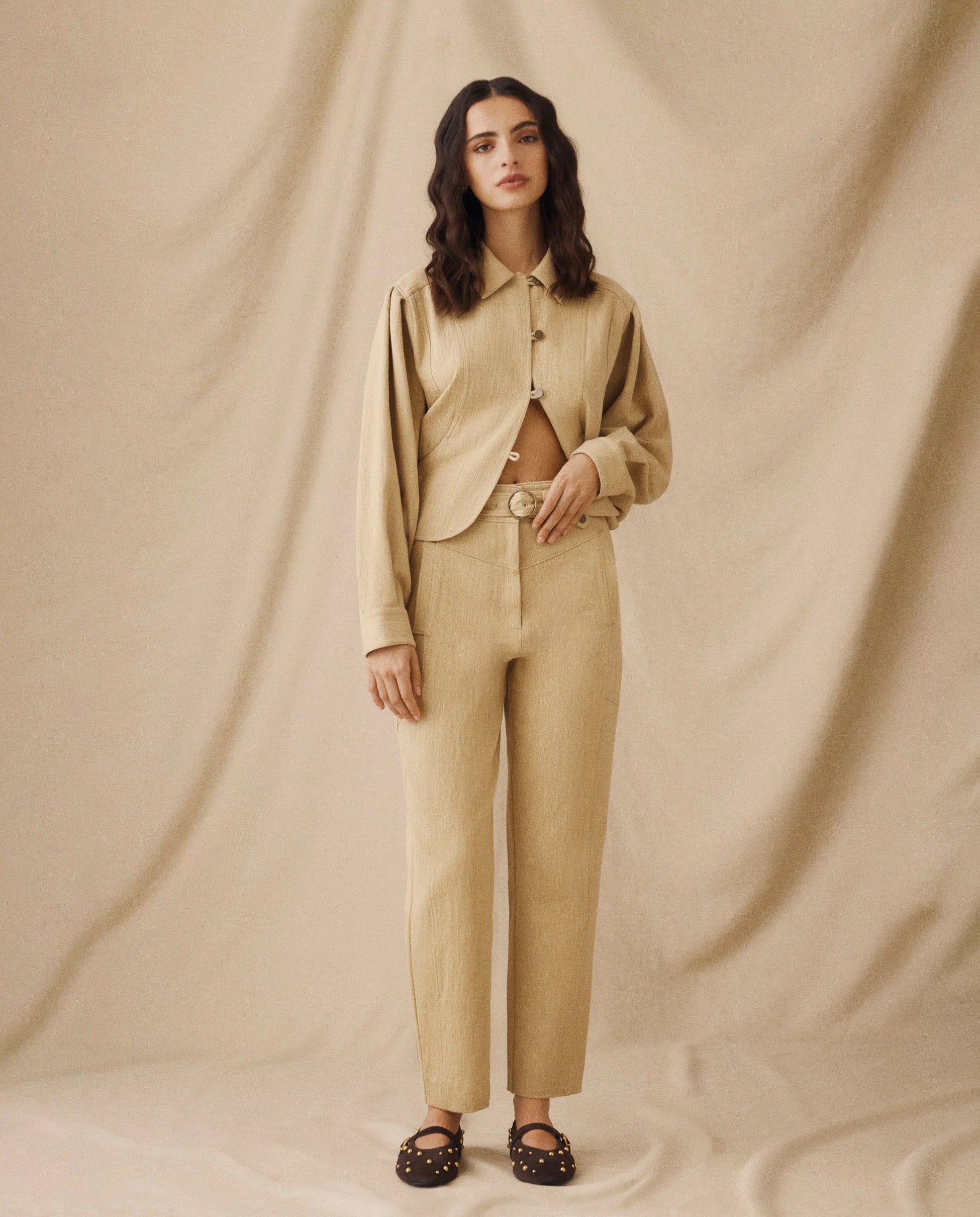 A modern twist on tailoring, the Moana Jacket is cut from textured cotton in a soft light camel tone. Designed with pleated shoulders and voluminous sleeves, it fastens through the front with looped button closures. A gently curved hem and side pockets complete the silhouette, while buttoned cuffs add a refined touch.
