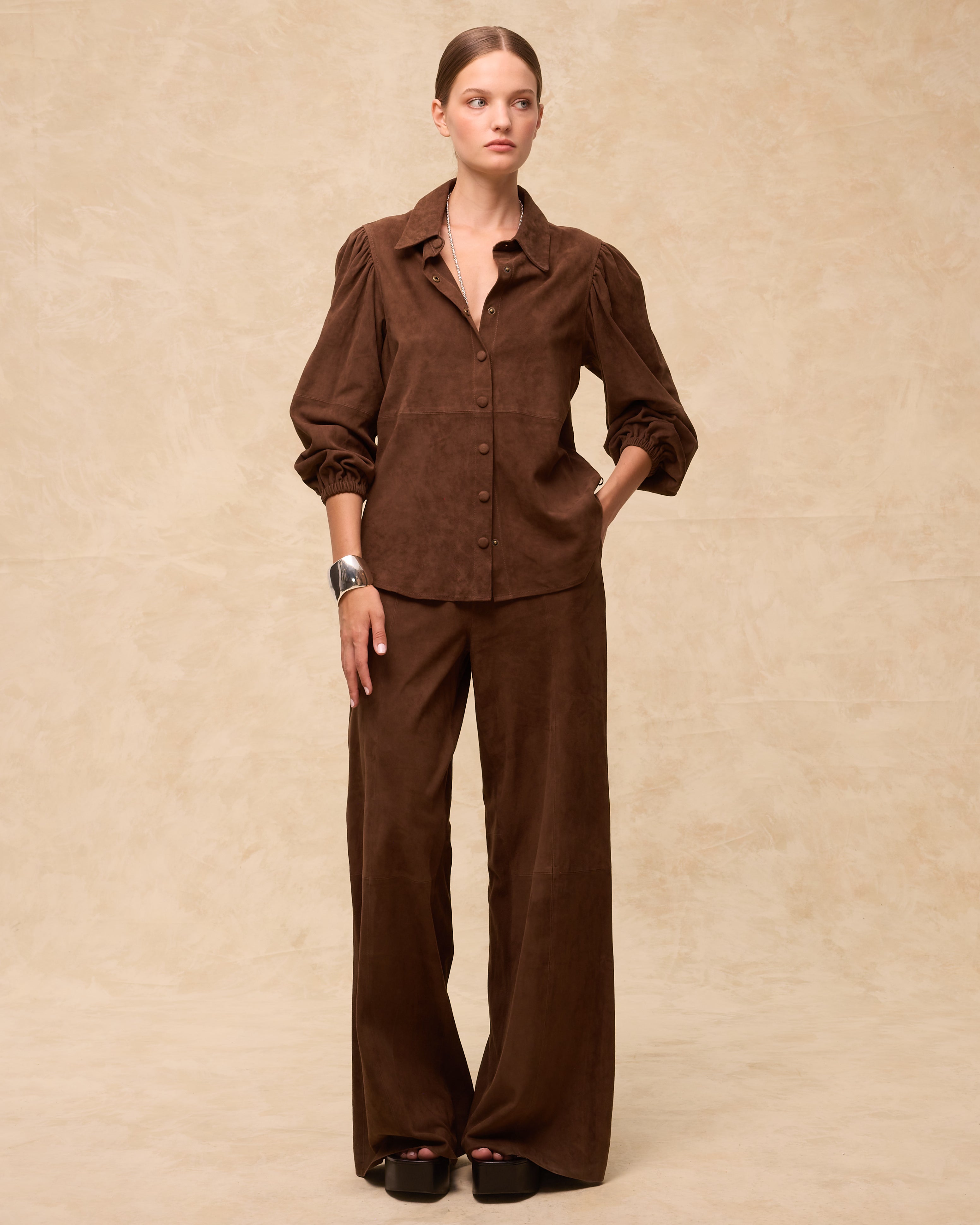 Cut from 100% goat leather suede, the Mocha trousers combine softness with structure in a rich, deep brown tone. Designed to sit high on the waist, they feature a clean waistband, subtle front seams and generous wide legs for graceful movement. Side pockets add functionality, while the fluid silhouette makes them ideal for elevating day-to-evening looks.