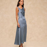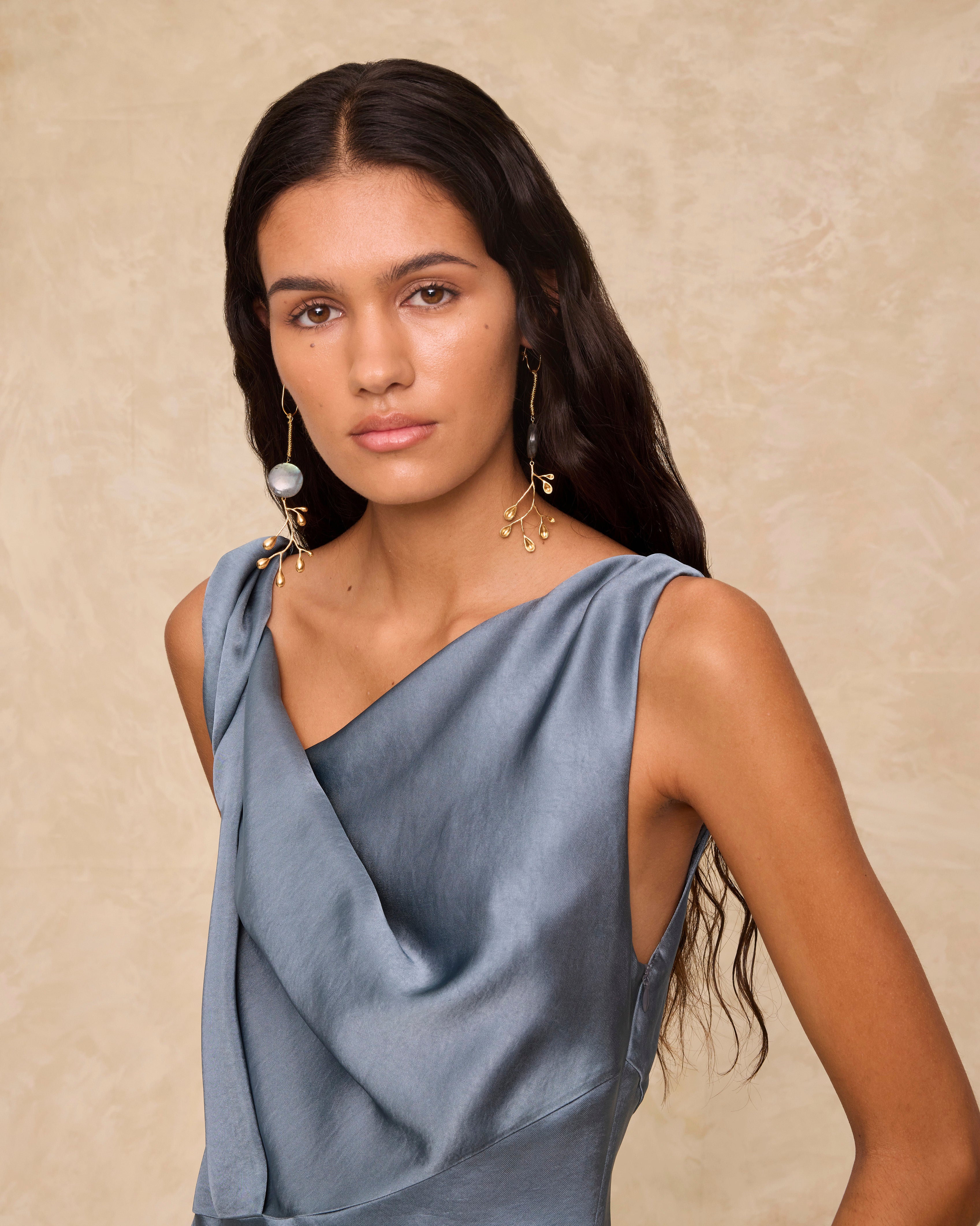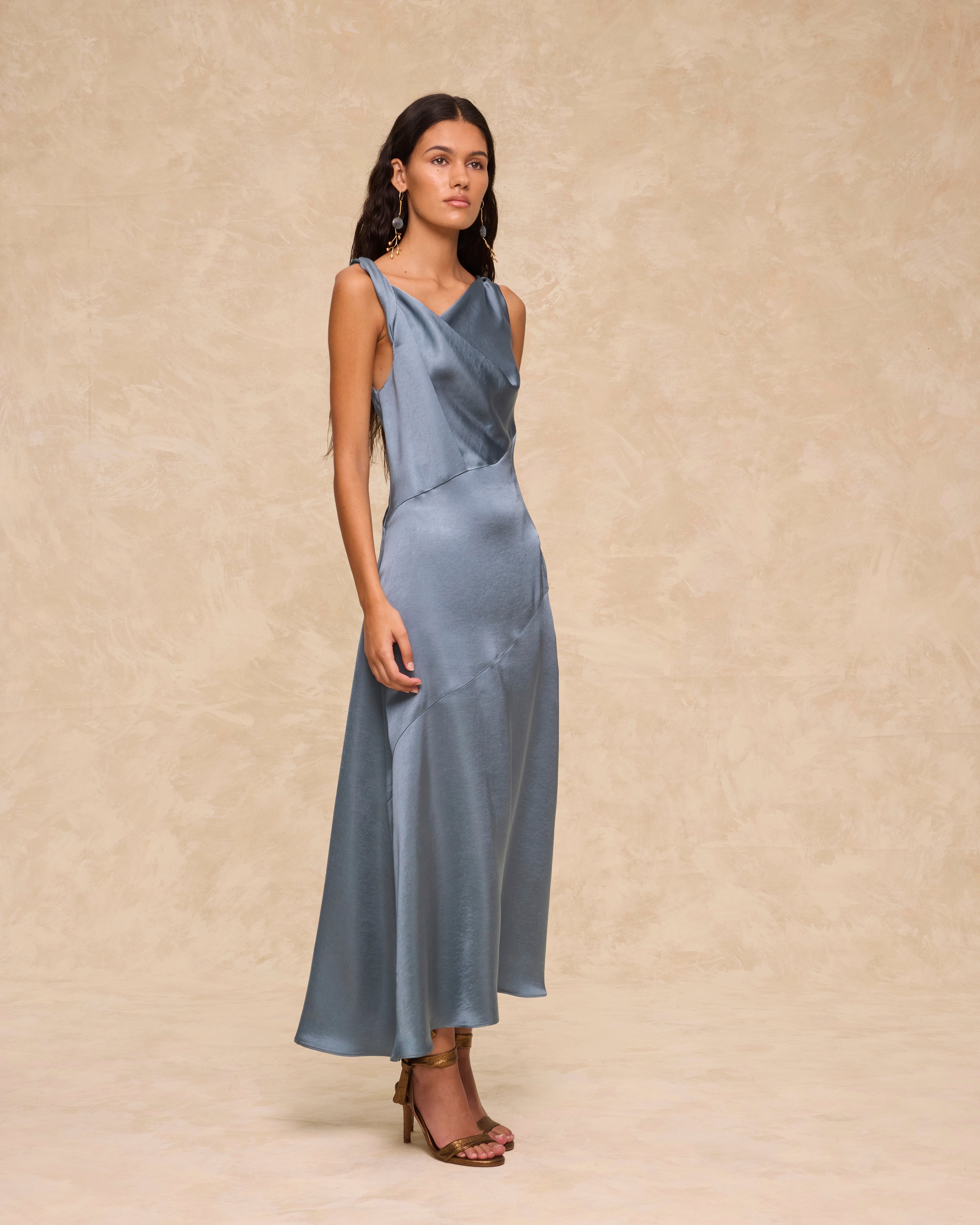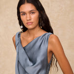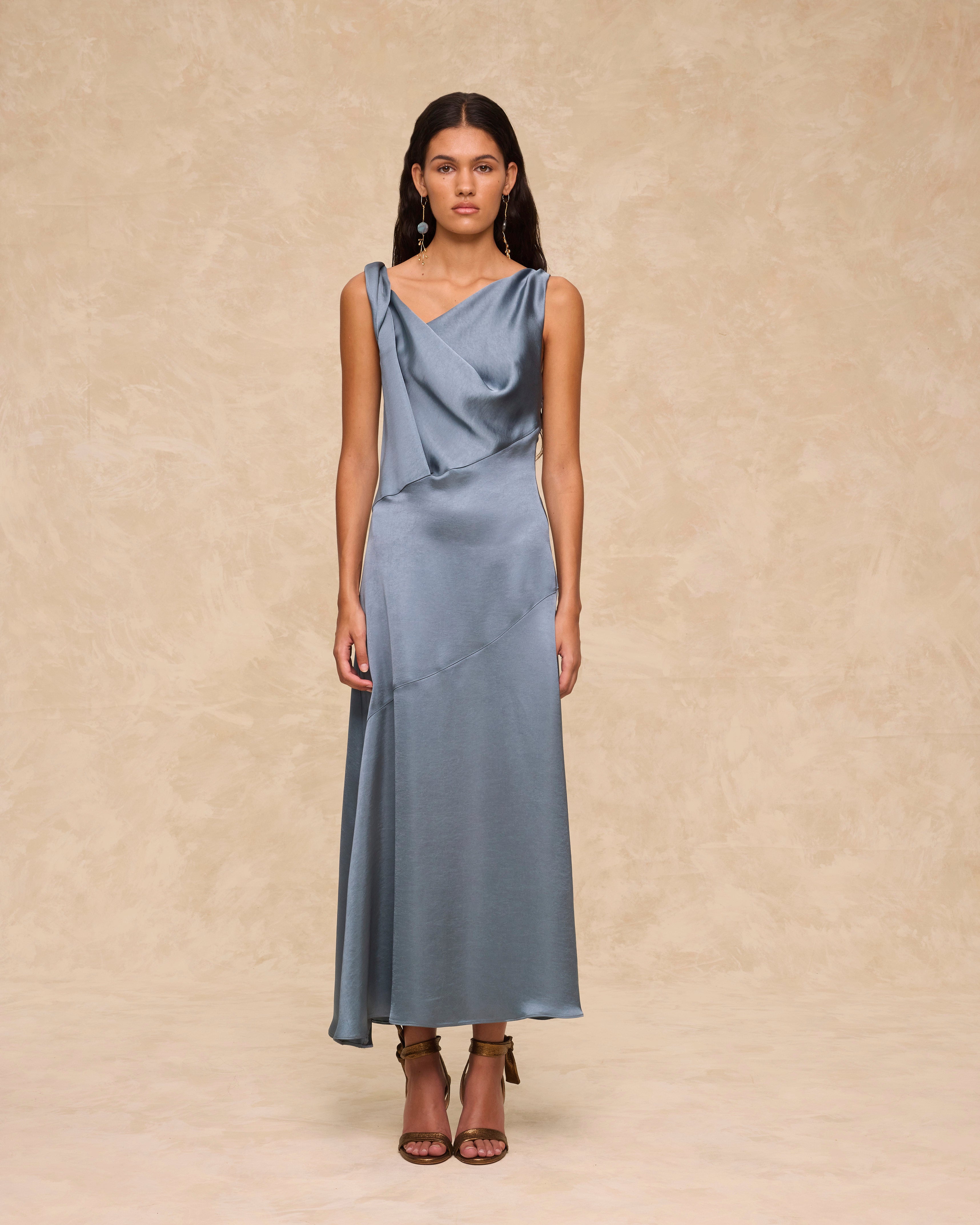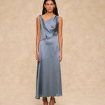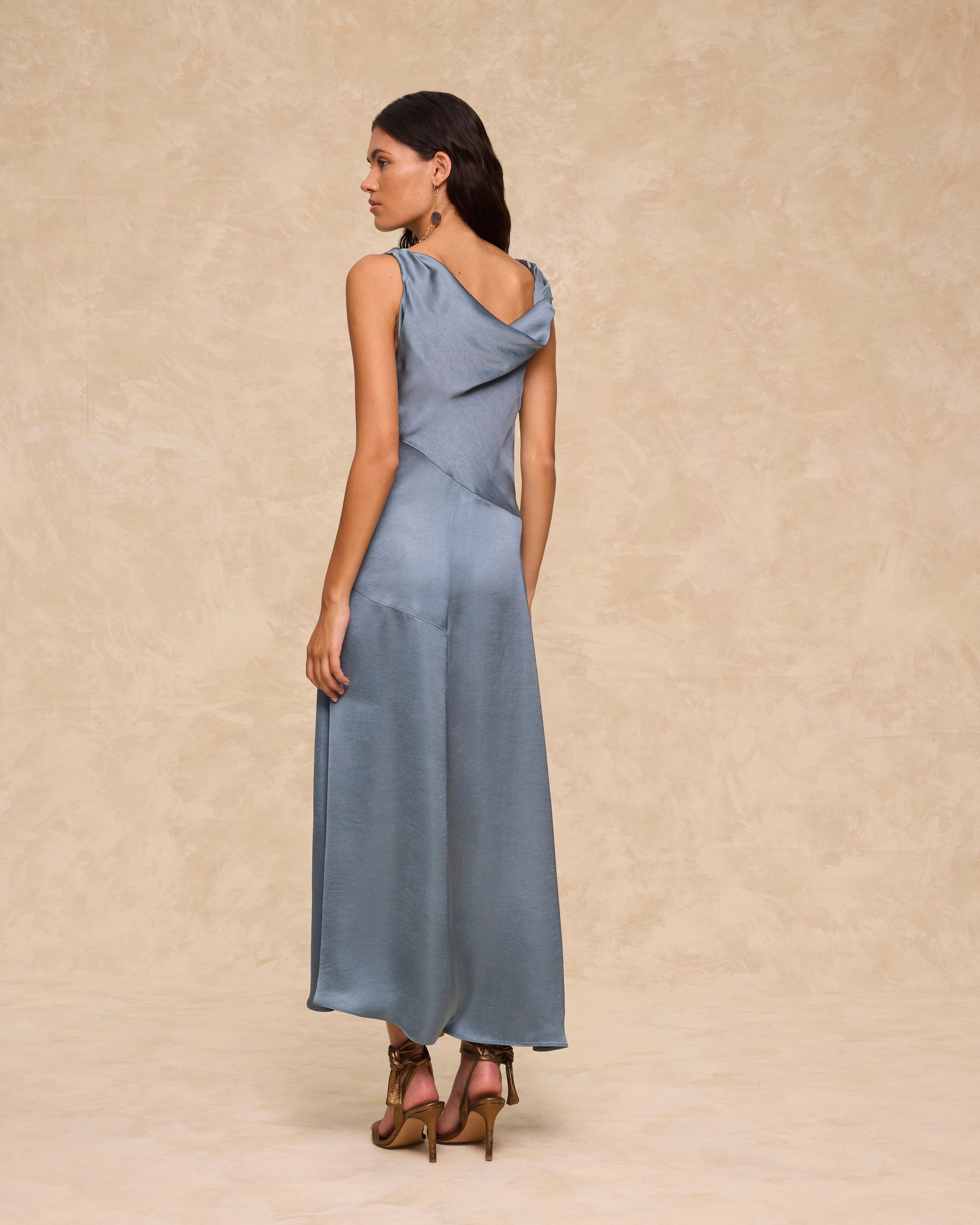 Where sculptural elegance meets fluid drape, the Natalia Dress in steel is a refined take on modern occasionwear. Cut in lustrous satin with soft structure, it features a softly draped neckline with a twisted shoulder strap, and asymmetric seam detailing through the skirt. A concealed side zip ensures a smooth, flattering fit.