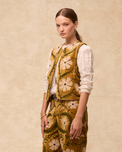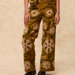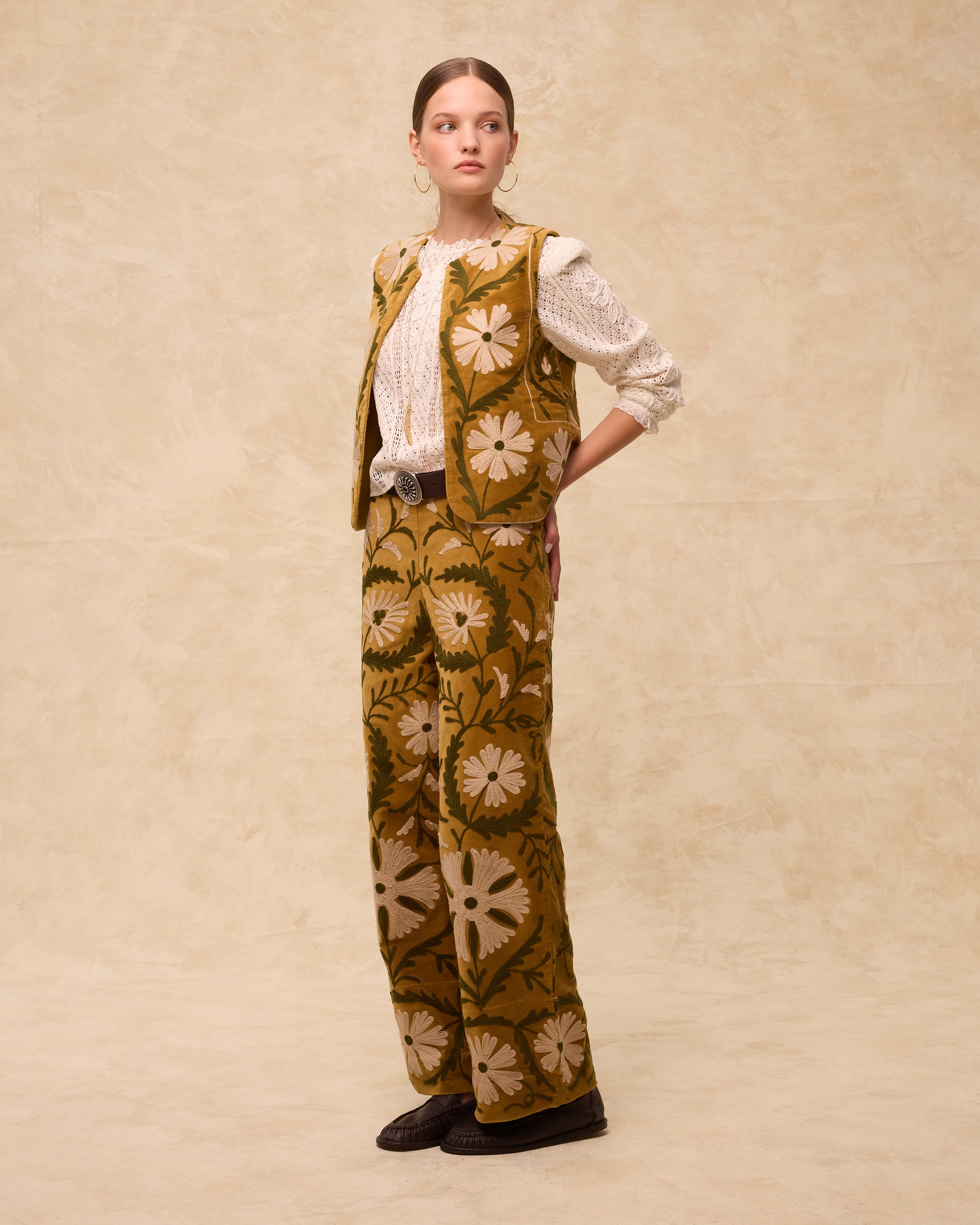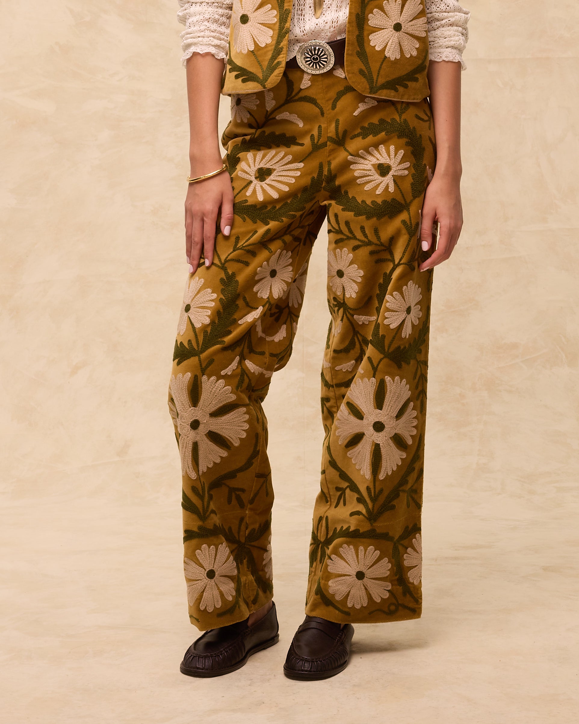 Richly embroidered in cream and green wool thread, the Suzani Trousers are a bold take on bohemian tailoring. Cut from cotton velvet in a warm mustard hue, they’re designed to sit high on the waist and fall into a fluid wide leg. Unlined for natural movement, they fasten with a discreet side zip for a smooth finish.