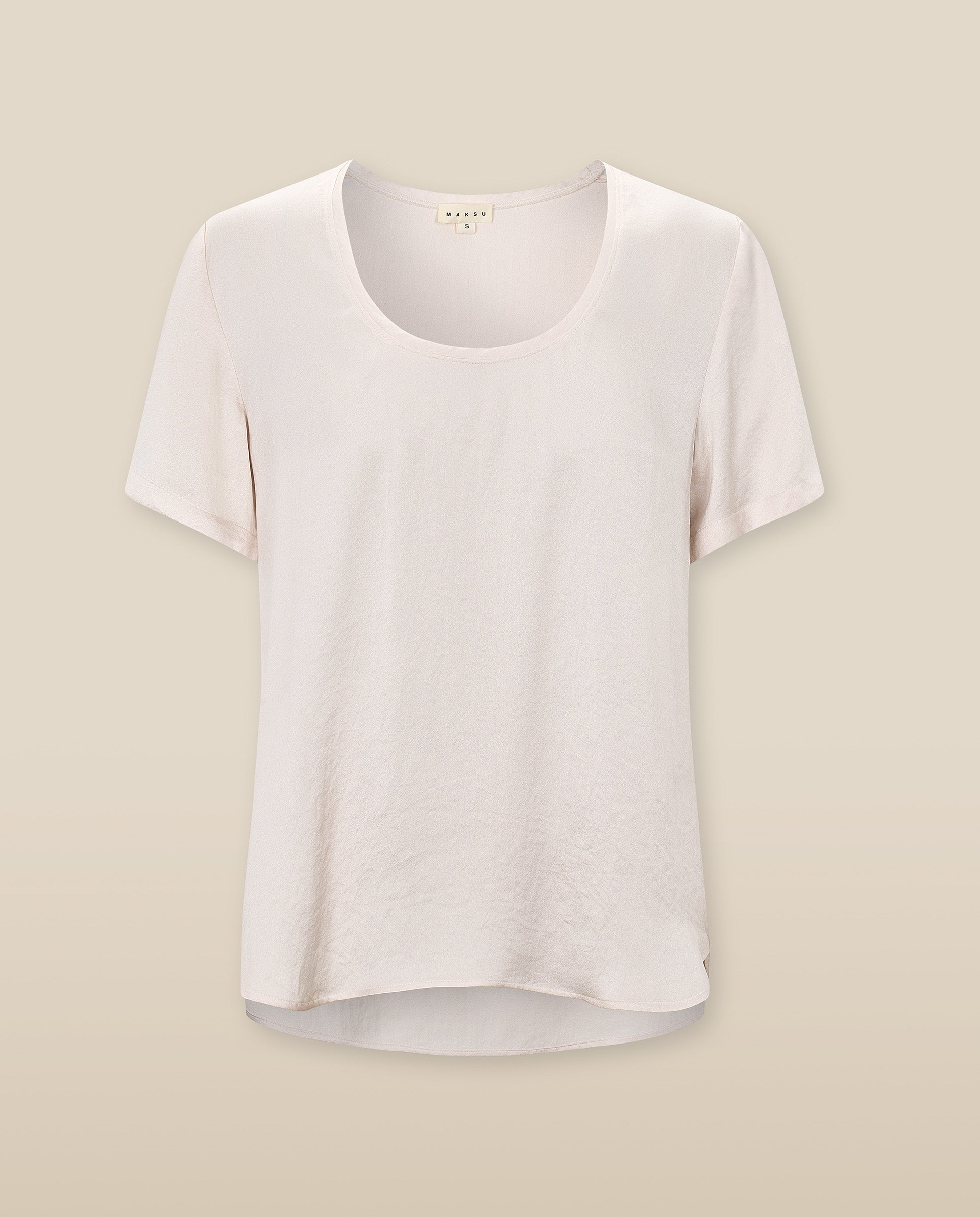 The Yukta Blouse in ivory is a minimalist and timeless wardrobe essential. Crafted from a slightly satin fabric with a soft, subtle sheen, it offers a refined finish and exceptional comfort. The flattering round neckline and relaxed, roomy cut make it a versatile piece that effortlessly transitions from day to night. This elegant and minimalist design is perfect for layering or wearing solo as a staple piece in your collection.